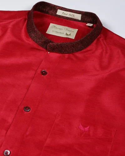 Maurya vastra Crimson Red Raw Silk Mandarin Collar Shirt