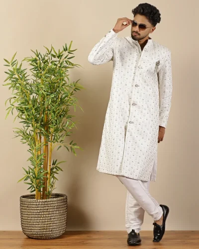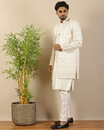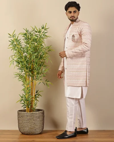 Blush Peach Thread Embroidery Textured Sherwani Set
