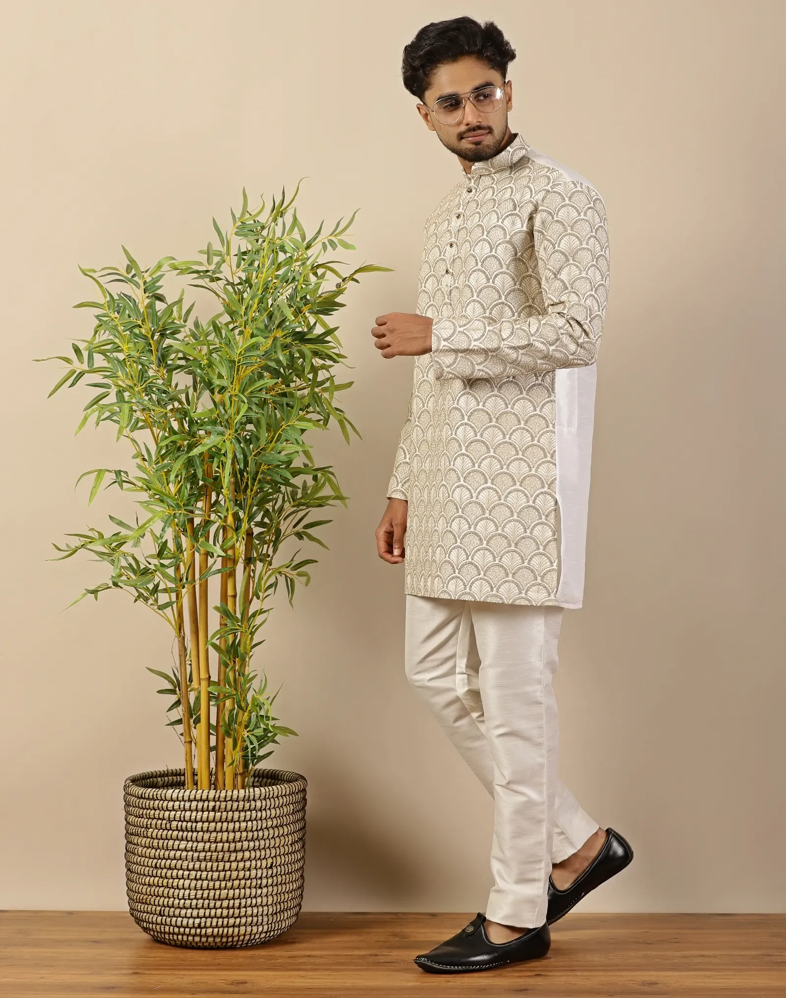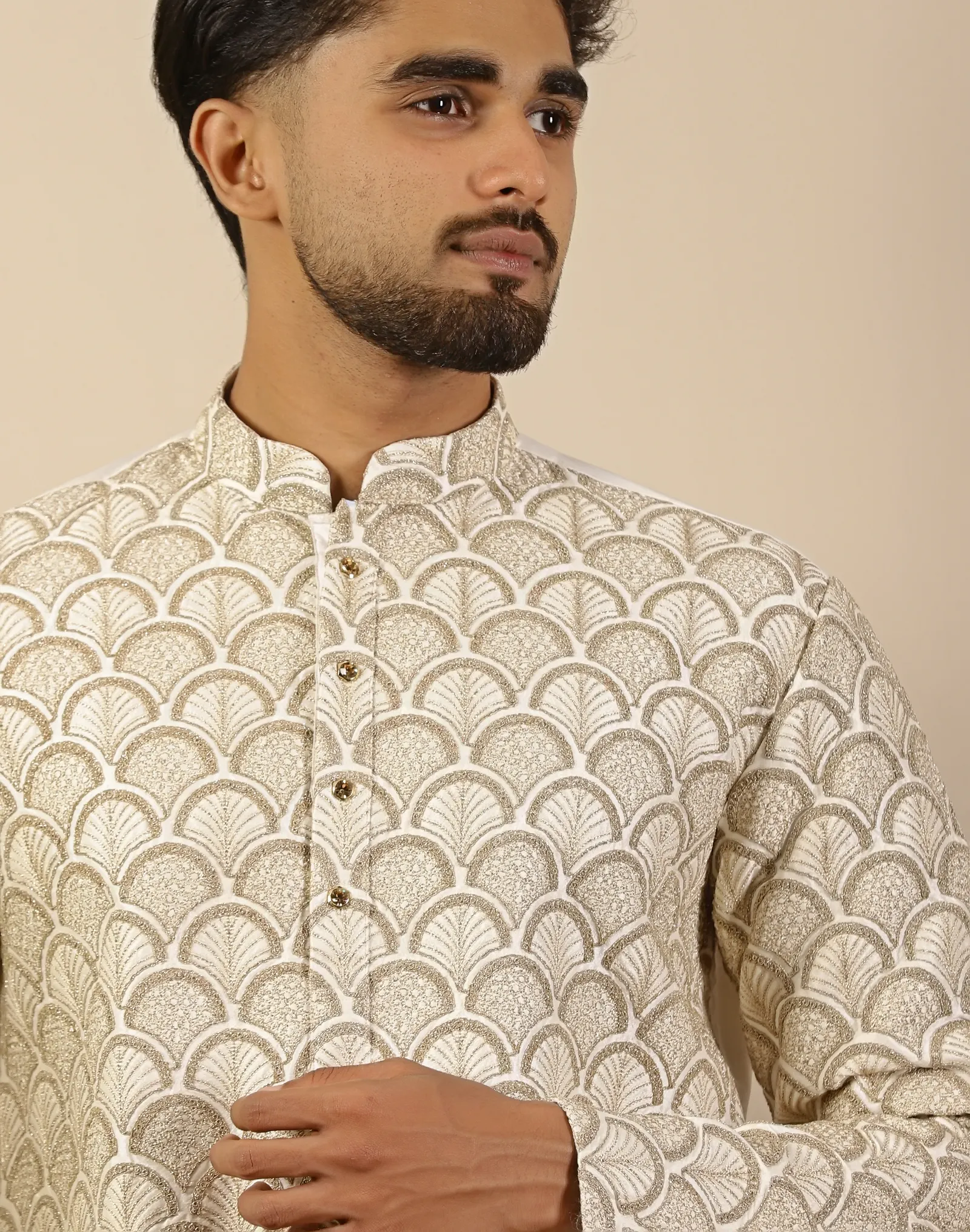 This Scotwilson Antique Gold Scallop-Textured Silk Short Kurta is a celebration of heritage craftsmanship expressed through contemporary tailoring. Crafted by Scotwilson from premium silk, the fabric features an intricate scallop weave pattern that creates depth, texture, and a subtle metallic sheen, lending the kurta a regal yet restrained presence.