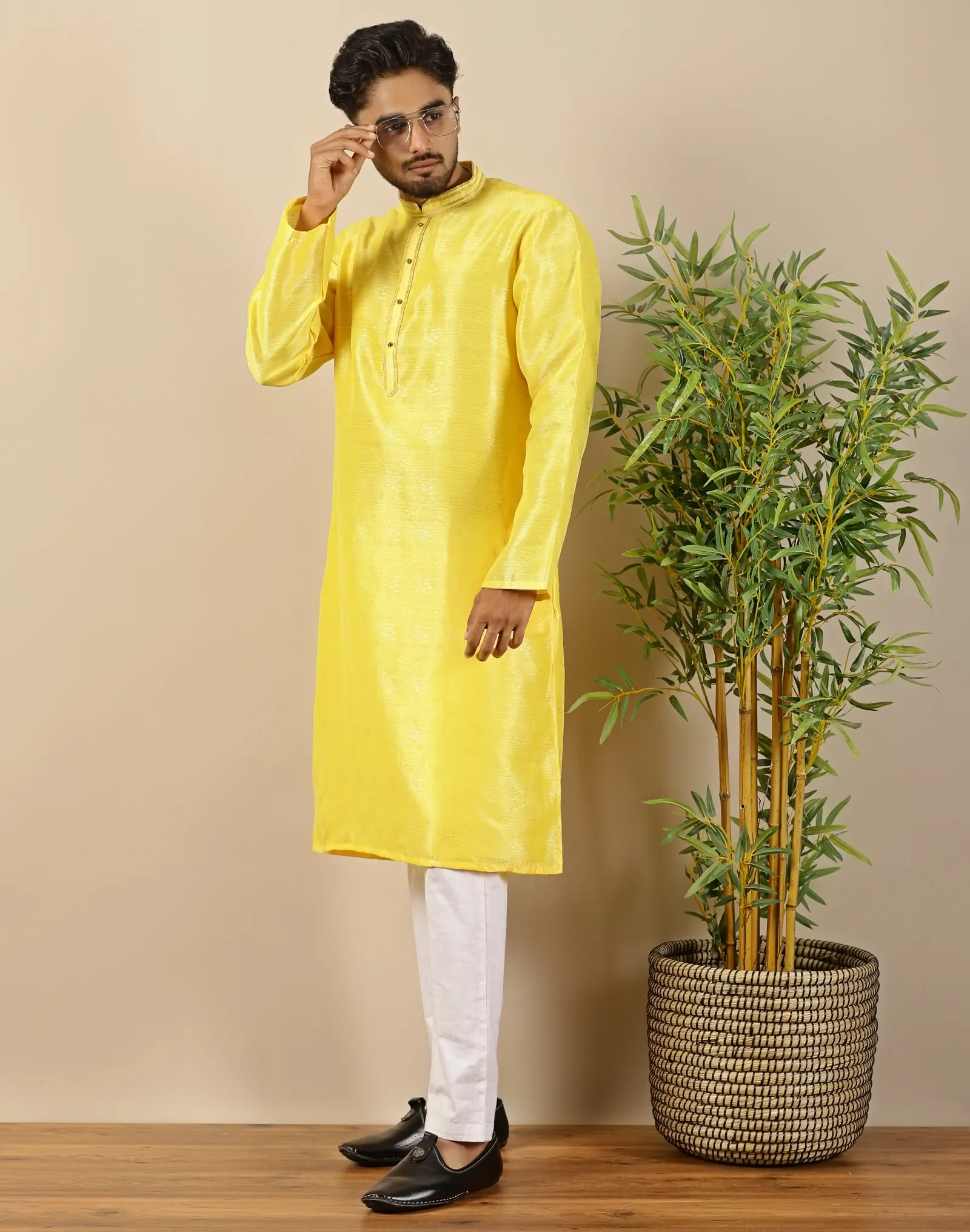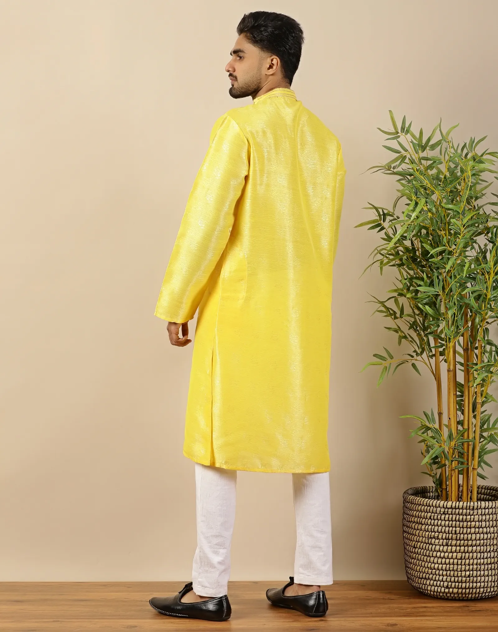 A radiant yellow kurta crafted in a subtle sheen fabric, designed to bring effortless elegance to festive and daytime occasions.