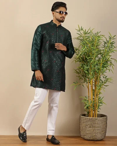 Pair the Maurya Vastra kurta with crisp white or ivory trousers and classic loafers or mojaris for festive events. For a contemporary twist, accessorize minimally and opt for neutral footwear to keep the focus on the Maurya Vastra kurta’s color and texture.