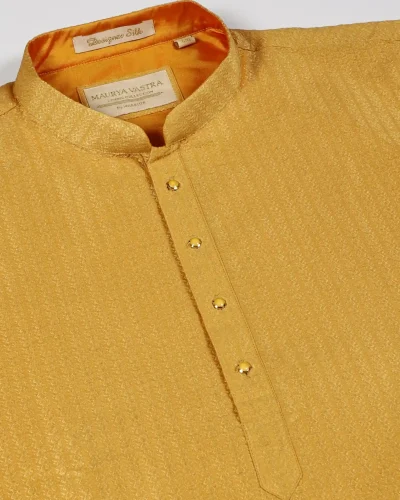 Designed with a structured mandarin collar and a minimalist buttoned placket, this Maurya Vastra kurta maintains a polished aesthetic while allowing ease of wear. The straight silhouette and regular fit ensure comfort and fluid movement, while the full-length sleeves add a timeless, balanced appeal. The vibrant yellow tone is bold yet tasteful, making this Maurya Vastra kurta a standout piece without excess.