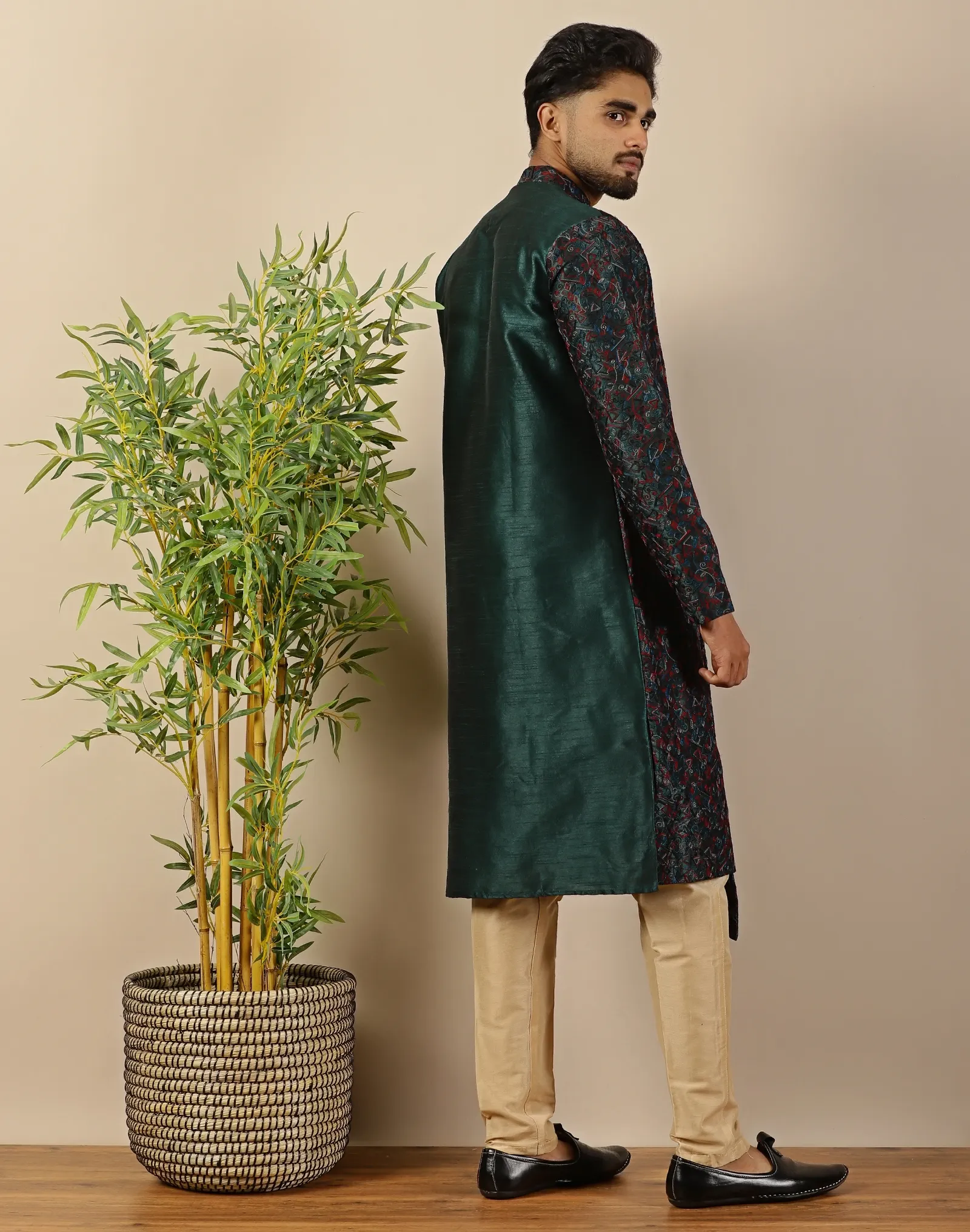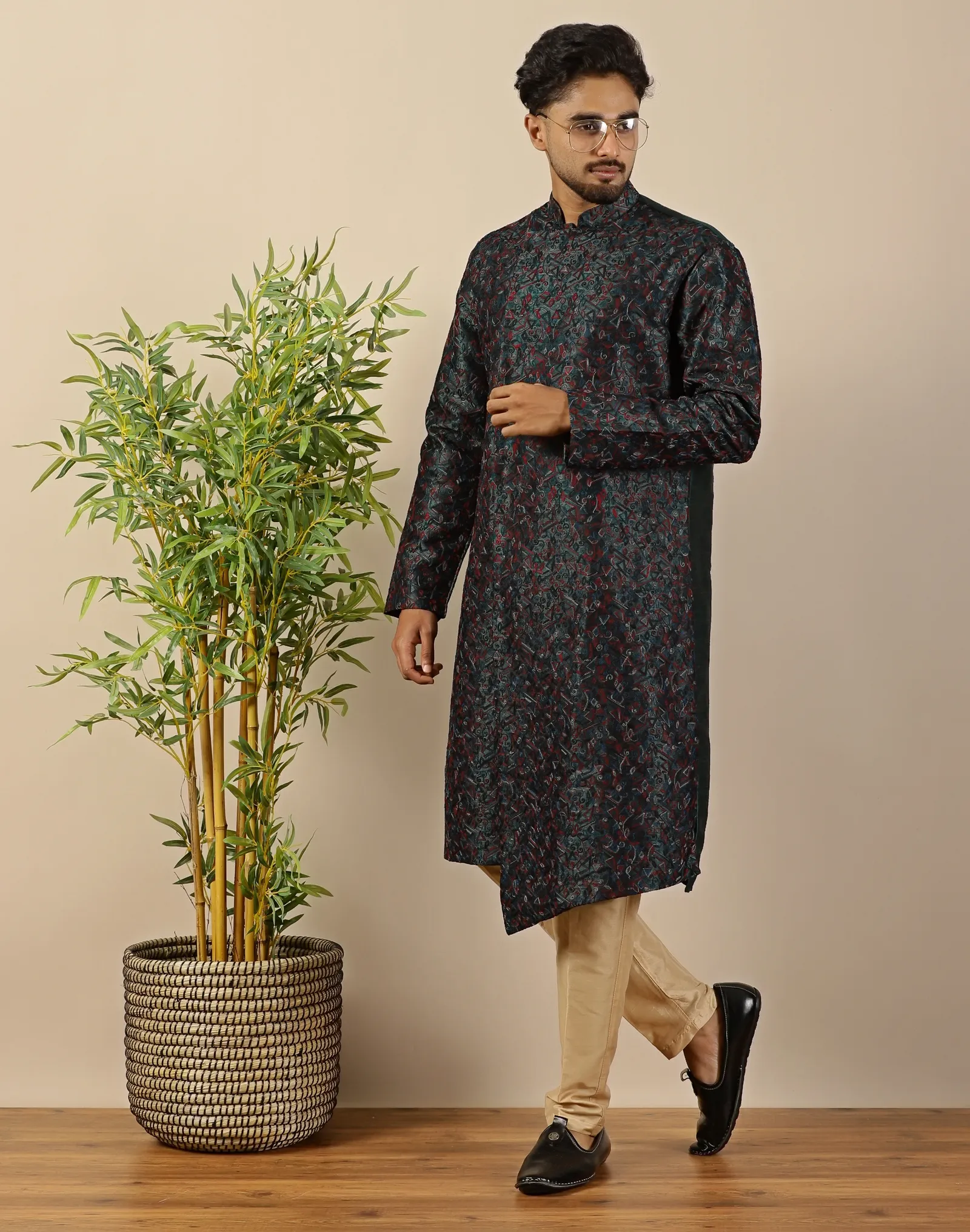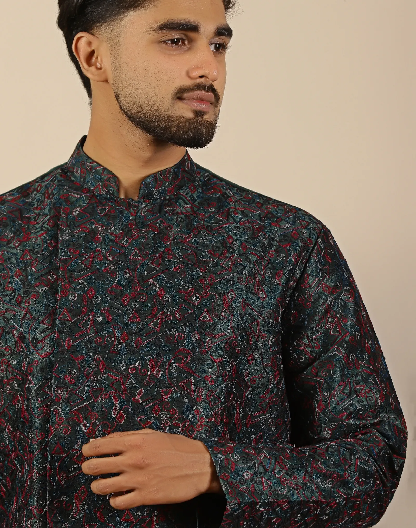 The all-over abstract print features layered tones of deep teal, charcoal, and subtle burgundy, creating a sophisticated visual depth. Designed with a clean mandarin collar and a concealed front placket, the kurta maintains a minimalist finish despite its intricate print. The straight cut and regular fit ensure ease of movement, while full-length sleeves and precise tailoring complete the refined look.