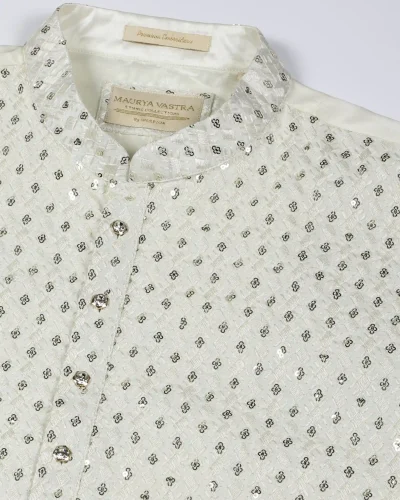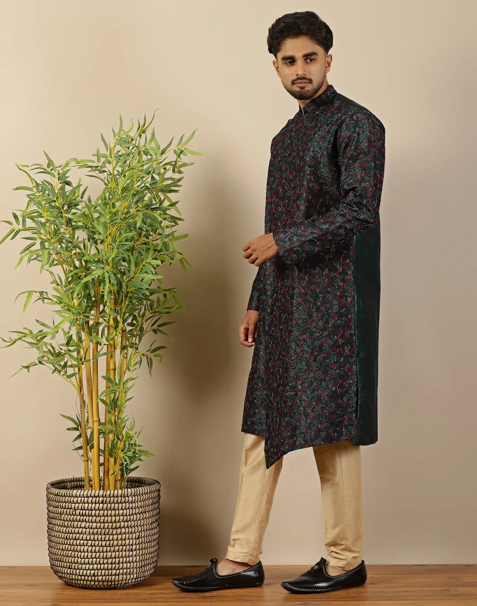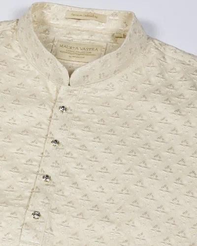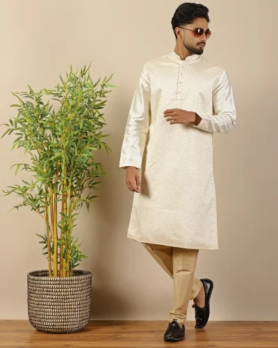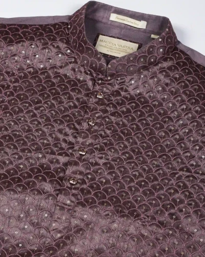 This Maurya Vastra kurta is crafted for modern traditional dressing, combining rich patterning with a sleek silhouette. Made from a premium lightweight fabric, it offers a smooth hand feel and breathable comfort while maintaining a structured drape.