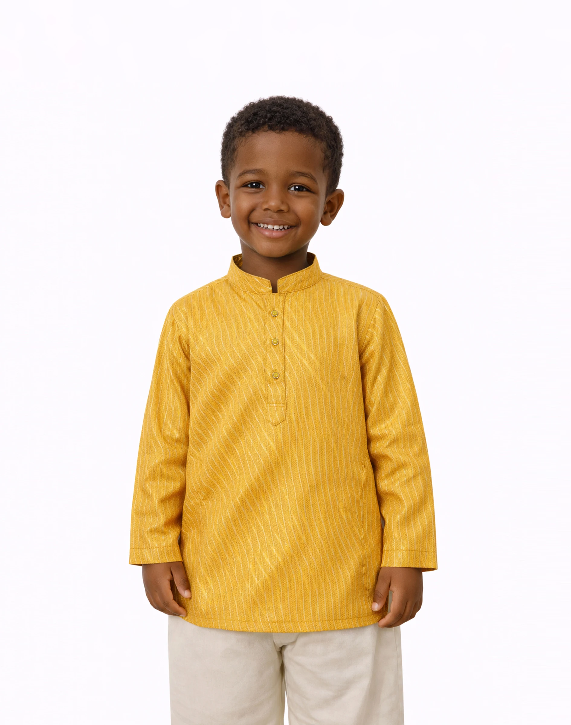Brighten up your child’s ethnic wardrobe with this beautifully crafted mustard yellow kurta. Designed with a subtle textured pattern, it adds depth and richness to the overall look while maintaining a refined aesthetic. The kurta features a mandarin collar, a neat buttoned placket, and full sleeves, offering a classic traditional silhouette. Made from a comfortable and breathable fabric, it ensures ease of movement and all-day comfort, making it ideal for festivals, weddings, and family gatherings. Its striking color and sophisticated design make it a standout choice for special occasions.
