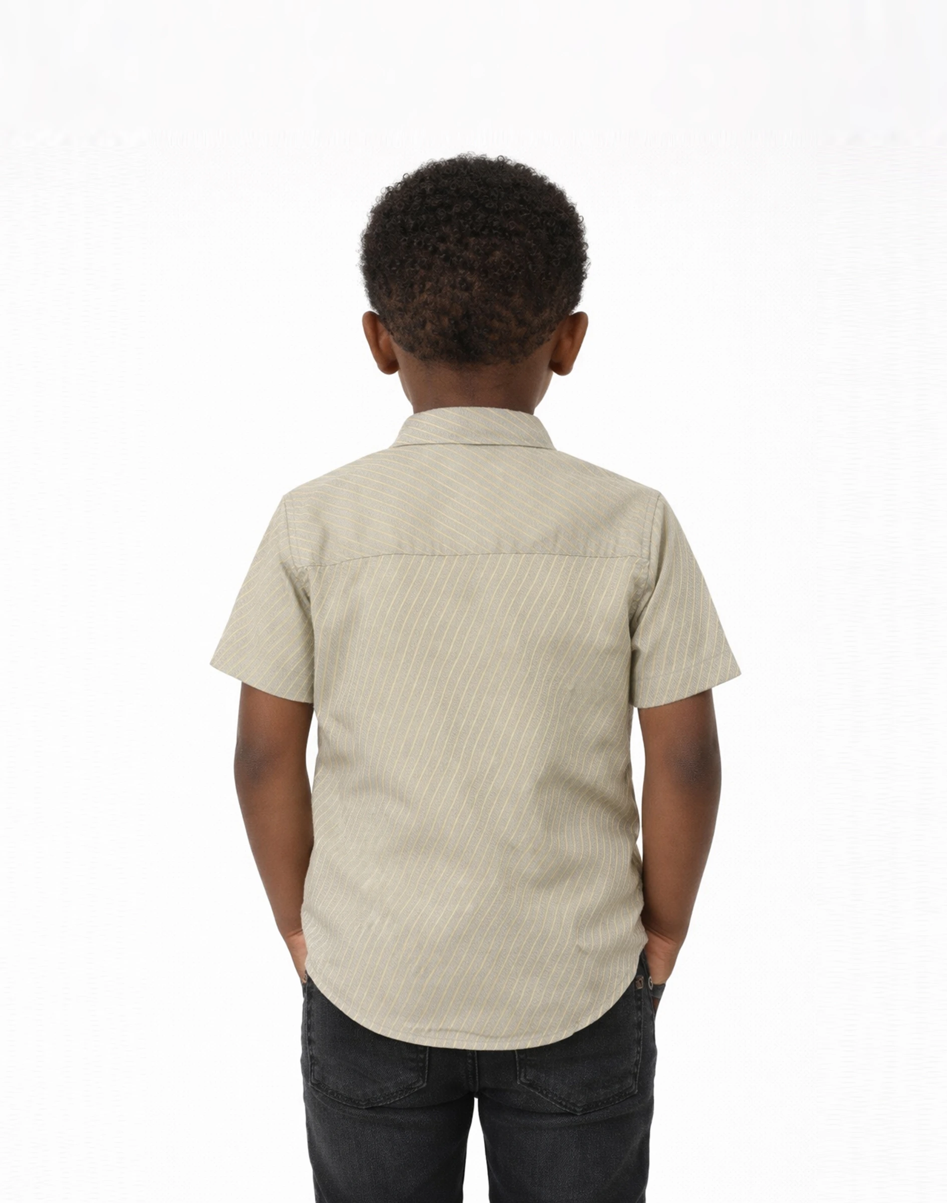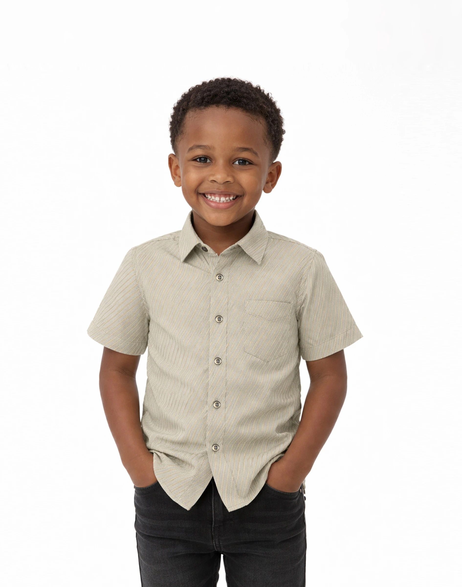 This boys’ short sleeve shirt in a refreshing sage green tone is designed with fine vertical stripes that add a touch of sophistication to a casual essential. Made from lightweight and breathable cotton, it ensures maximum comfort for all-day wear. The shirt features a classic collar, front button-down closure, and a neatly tailored chest pocket for added functionality. Its clean and versatile design makes it perfect for casual outings, school wear, or semi-formal occasions, offering a polished yet relaxed look.