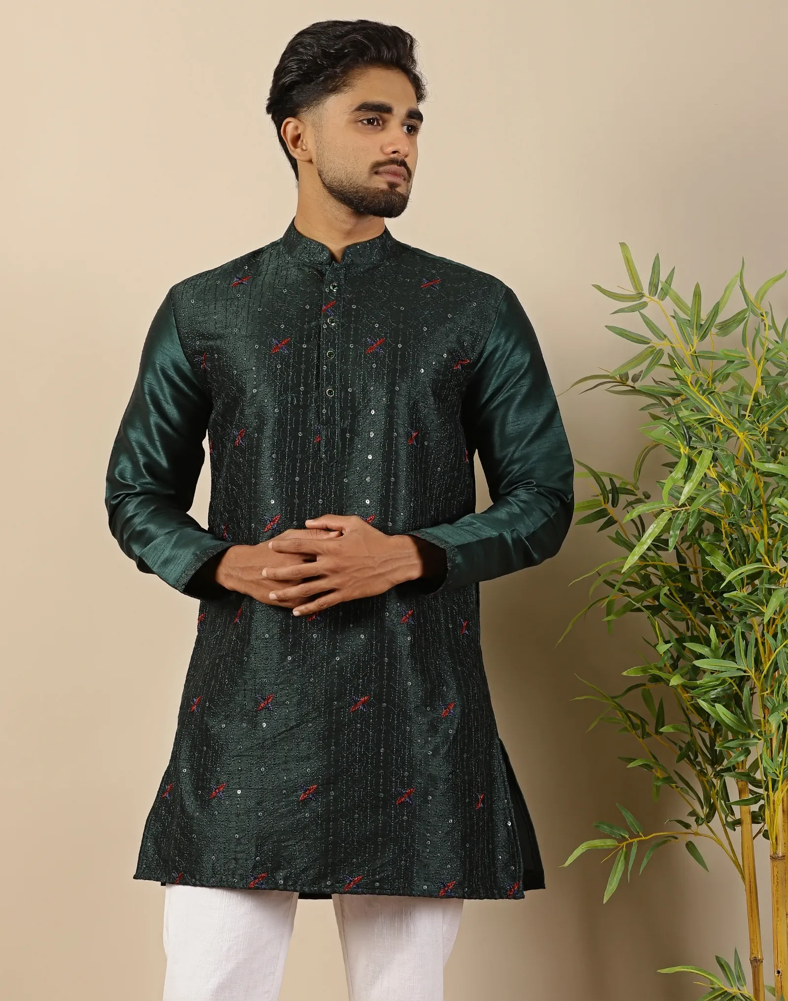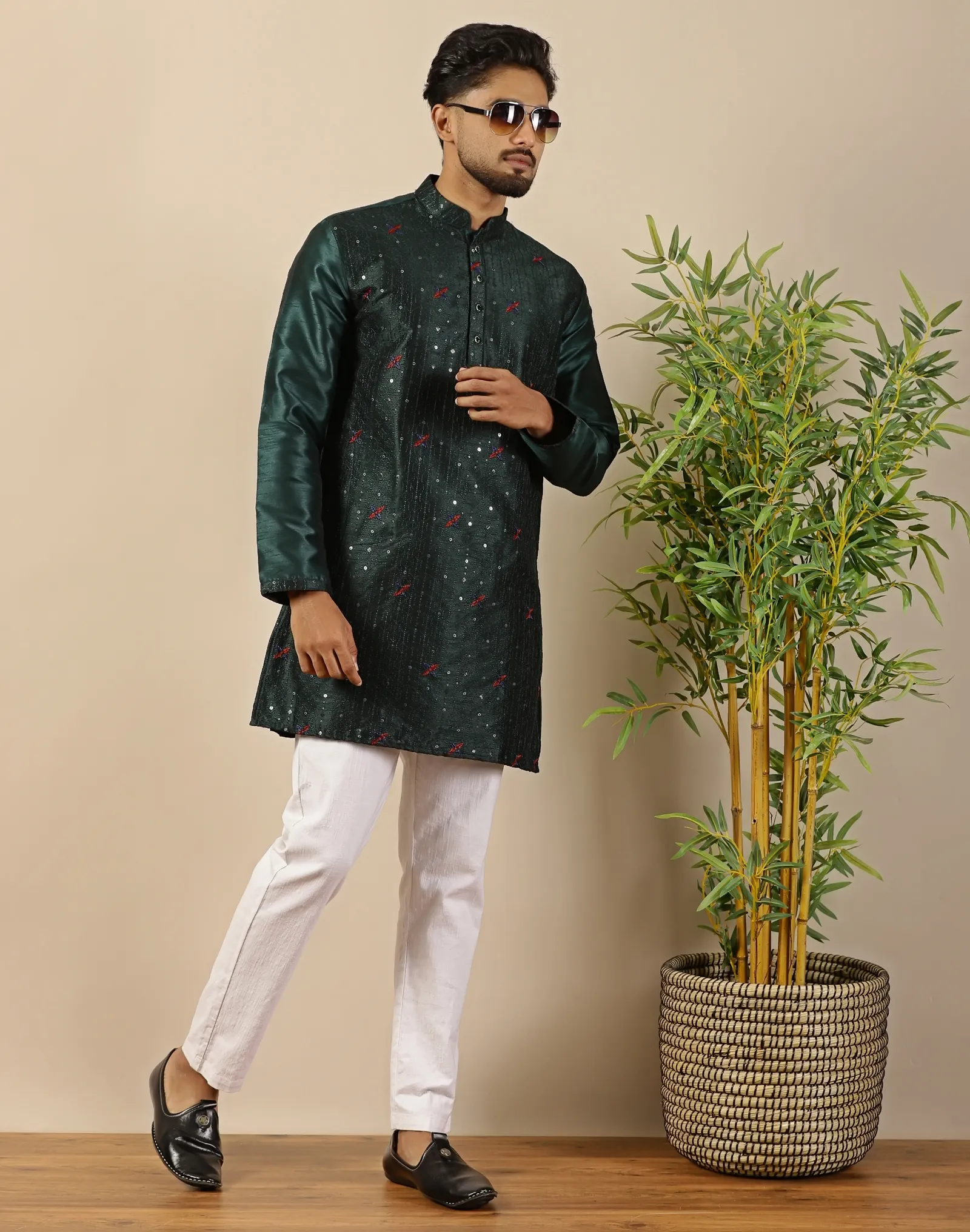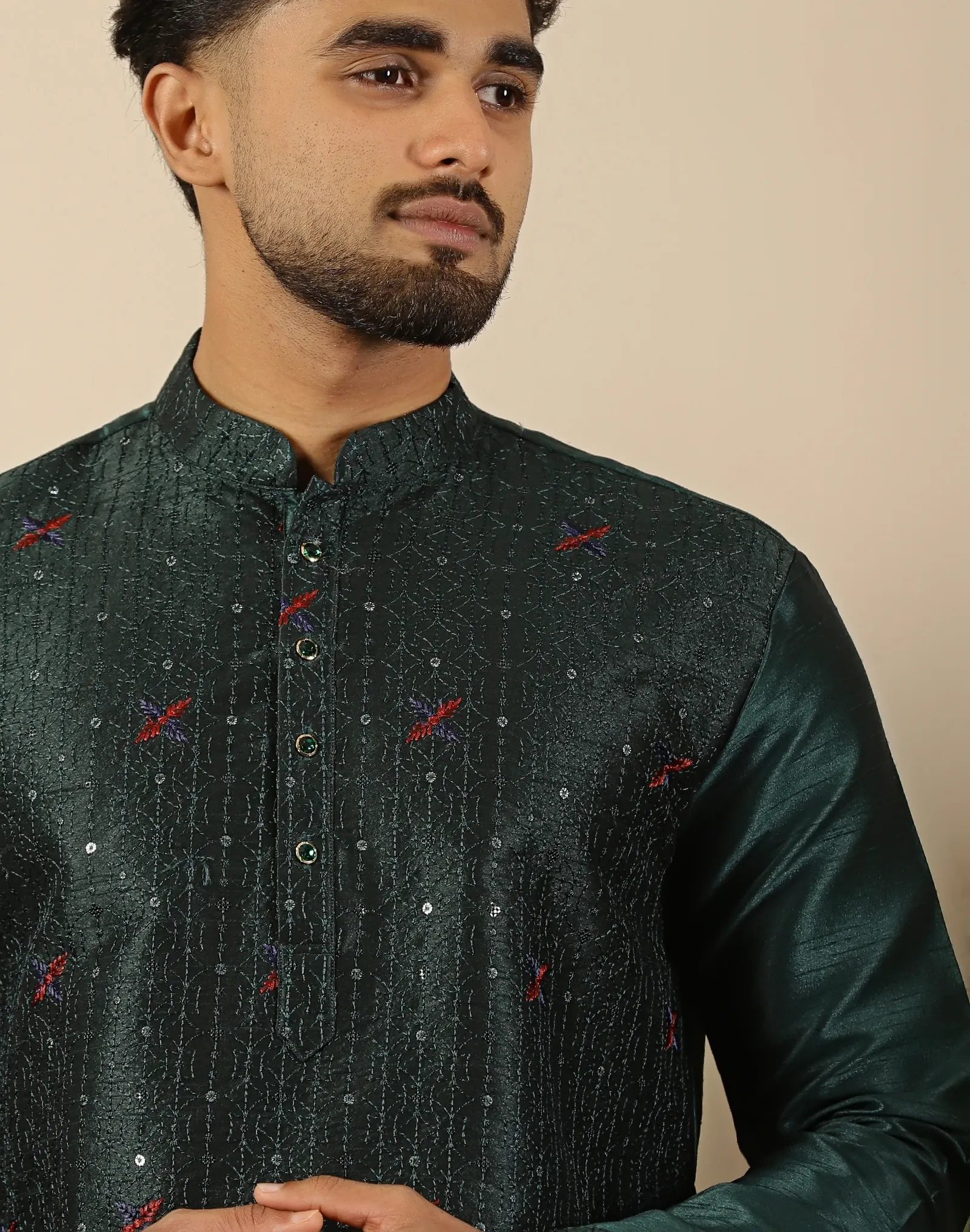 This Maurya Vastra emerald green kurta is a celebration of subtle luxury and refined craftsmanship. Crafted by Maurya Vastra from premium silk, the fabric carries a natural sheen that elevates the look while remaining graceful and composed. The surface features delicate woven motifs, adding depth and texture without overpowering the design.