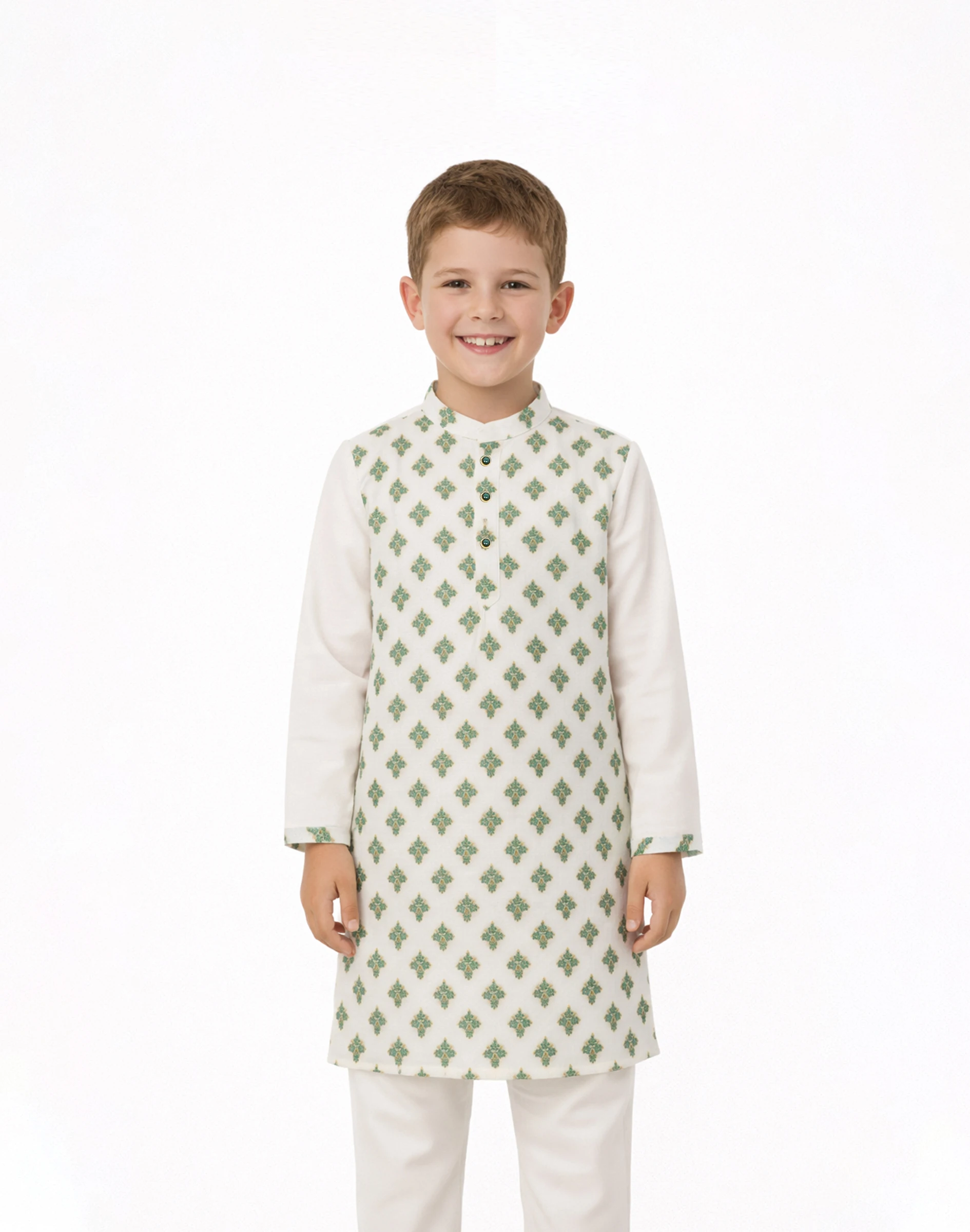 Bring a refreshing festive vibe to your child’s wardrobe with this ivory and green printed kurta. Designed with symmetrical traditional motifs in a soothing green tone, this kurta strikes the perfect balance between simplicity and festive charm.