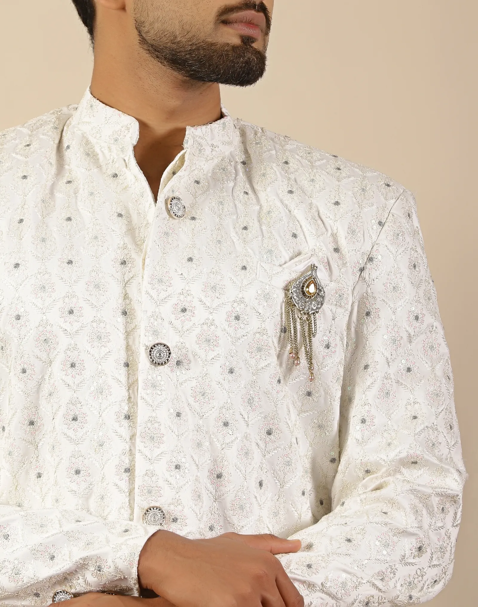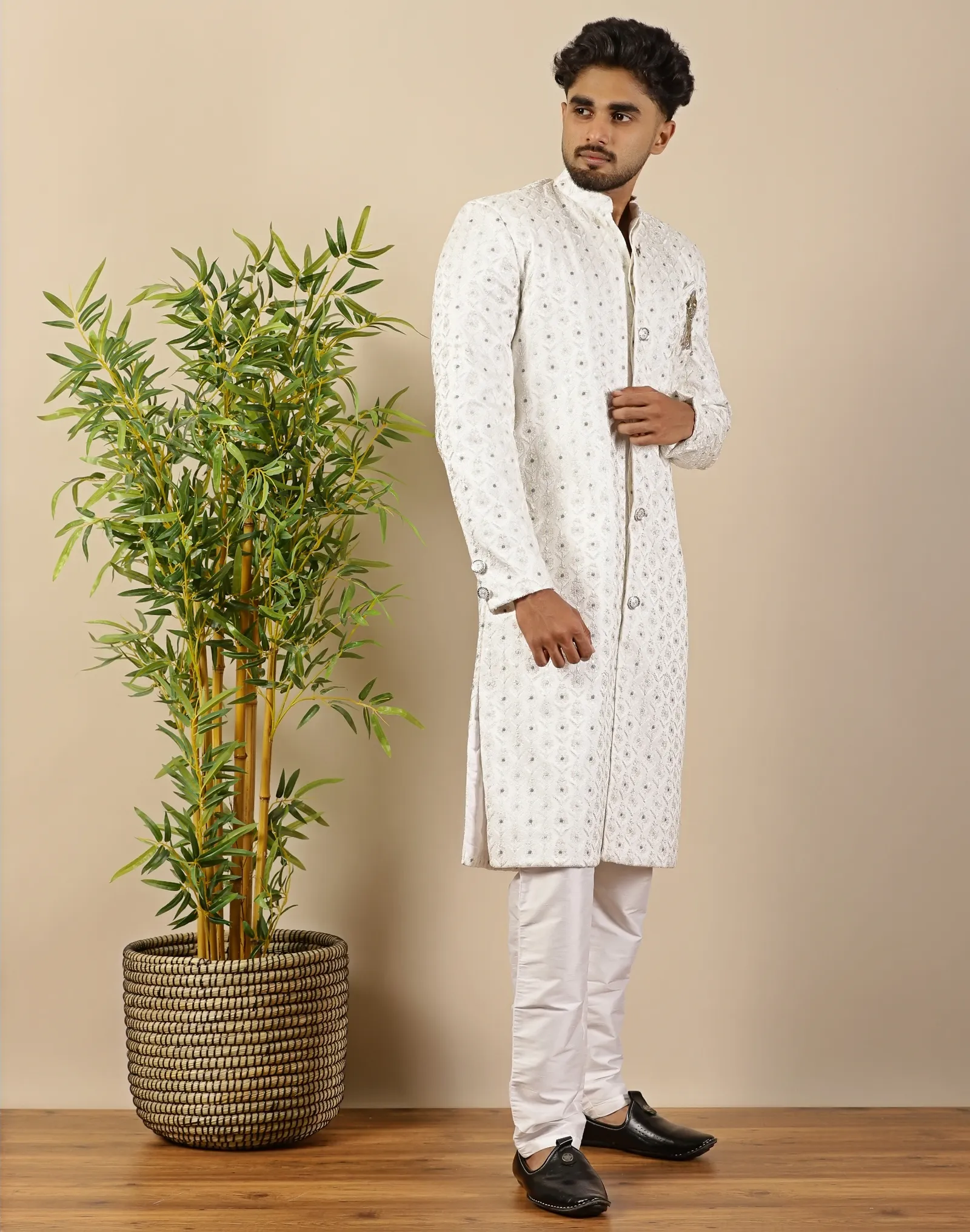 Style the Scotwilson Ivory Hand-Embroidered Sherwani Set with a crisp white churidar or straight pants for a seamless monochrome ensemble. Complete the look with traditional mojris or polished leather footwear to highlight the quiet luxury and contemporary charm of this Scotwilson piece.
