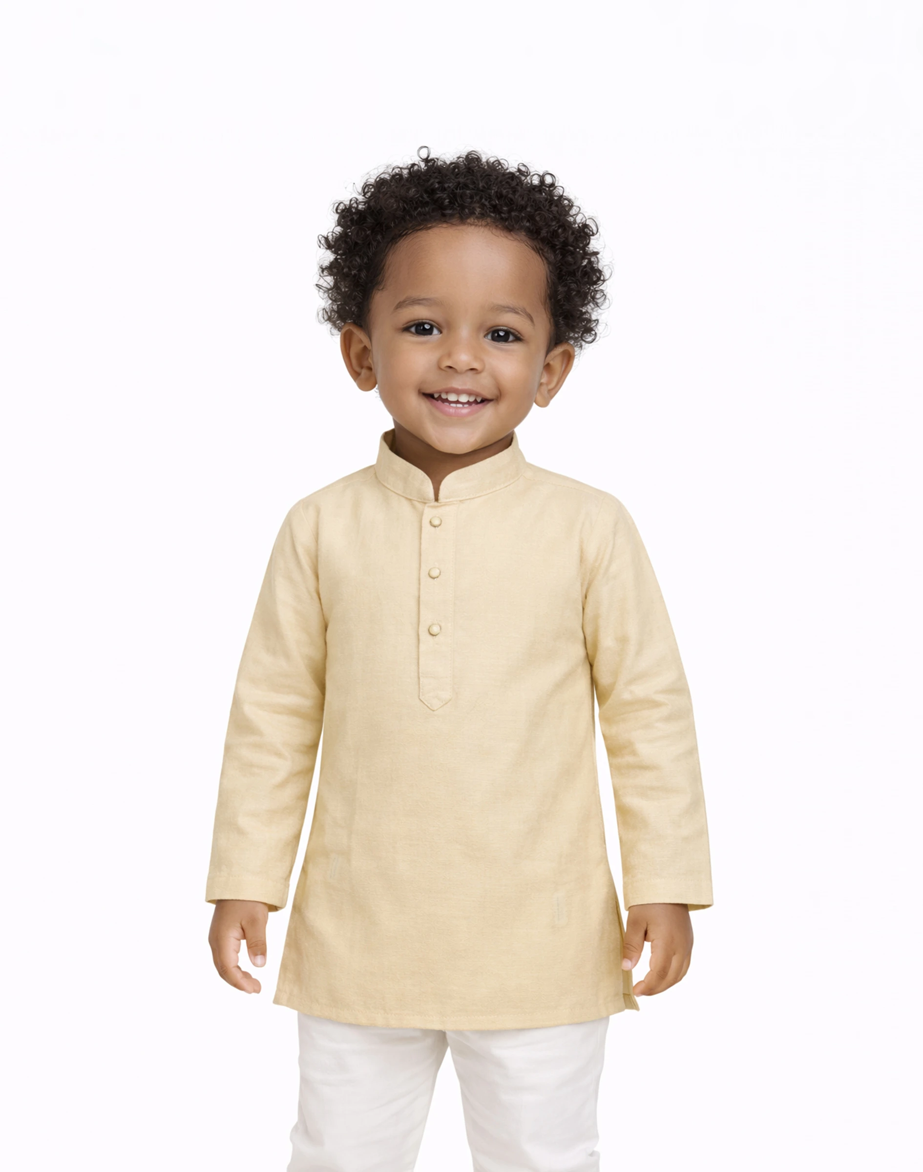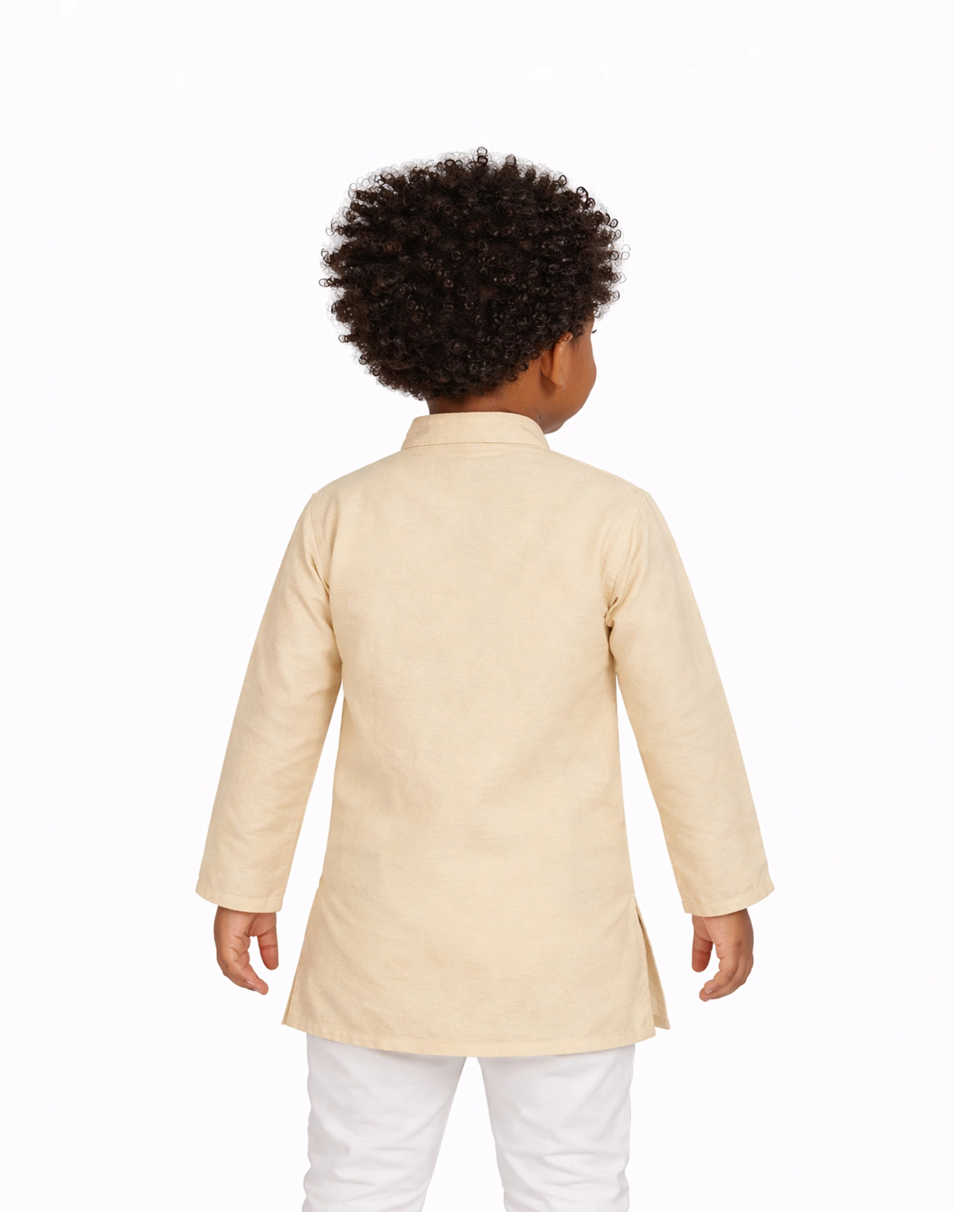 This boys’ cream kurta embodies understated sophistication with its minimal and refined brocade design. Crafted for a clean and elegant look, it features a mandarin collar, a neat buttoned placket, and full sleeves, offering a classic traditional silhouette. The smooth, breathable fabric ensures all-day comfort, making it suitable for festive occasions, family gatherings, and formal celebrations. Its neutral tone enhances versatility, allowing it to be styled in multiple ways for both simple and elevated looks. A must-have staple for a well-rounded ethnic wardrobe.