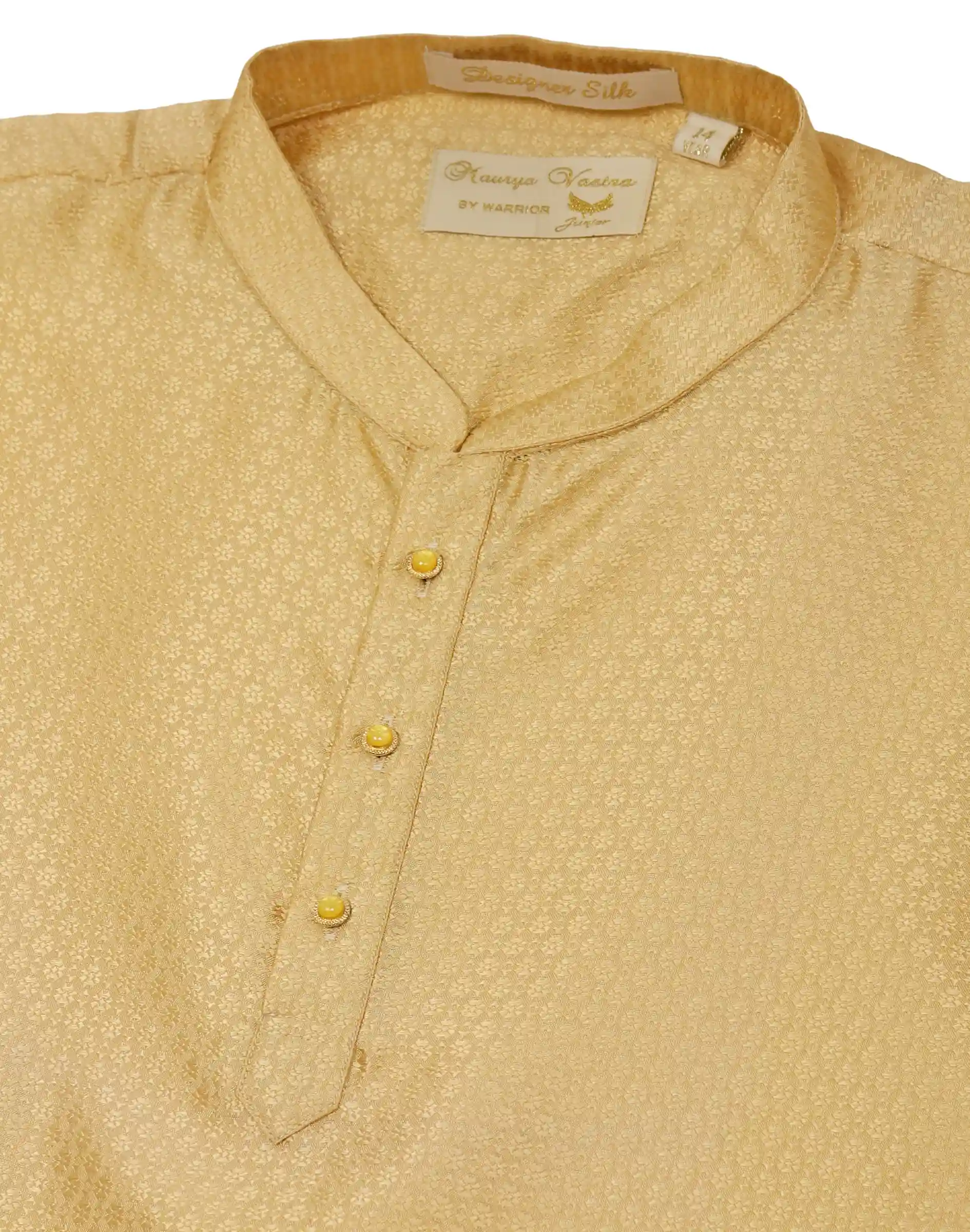 Elegant gold designer silk kurta with a subtle woven pattern, crafted for a rich and festive look.