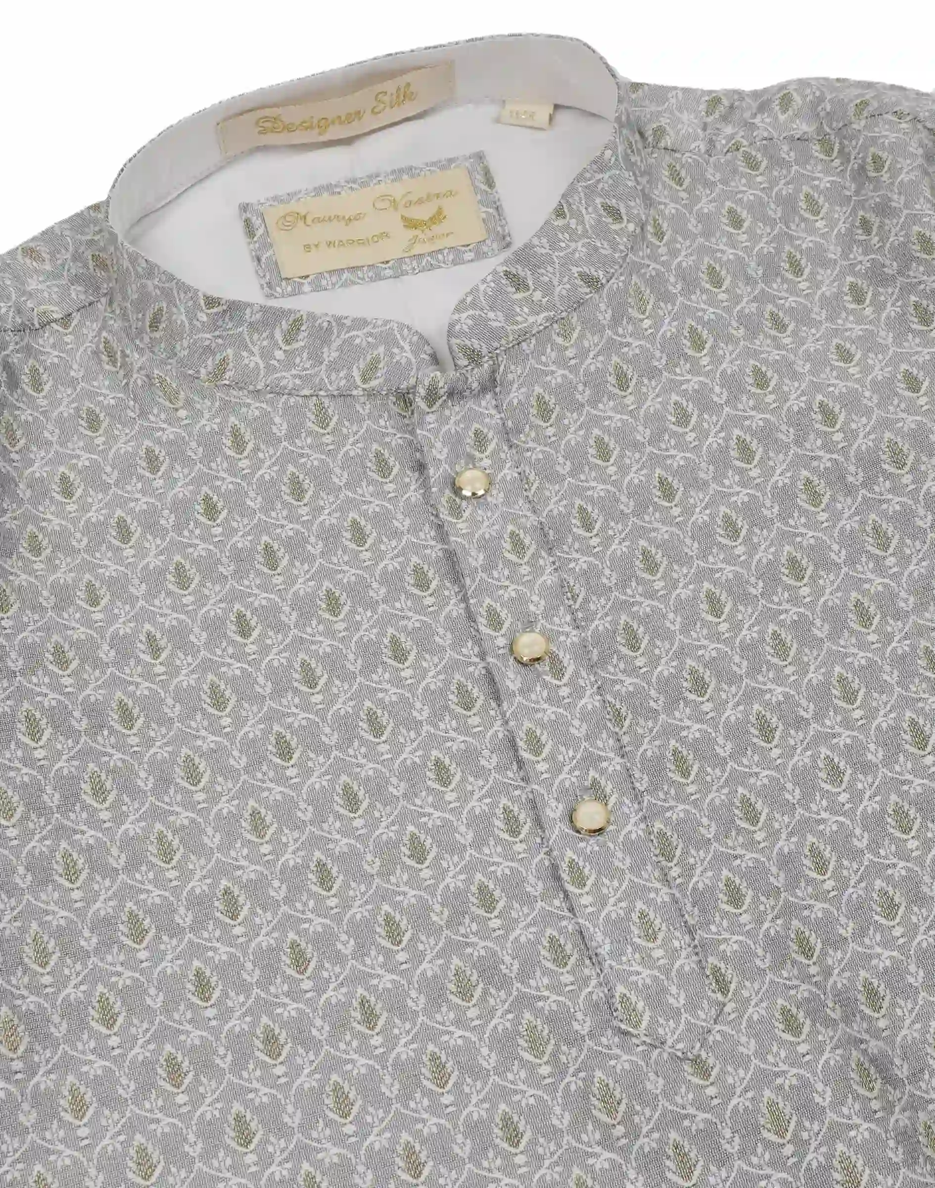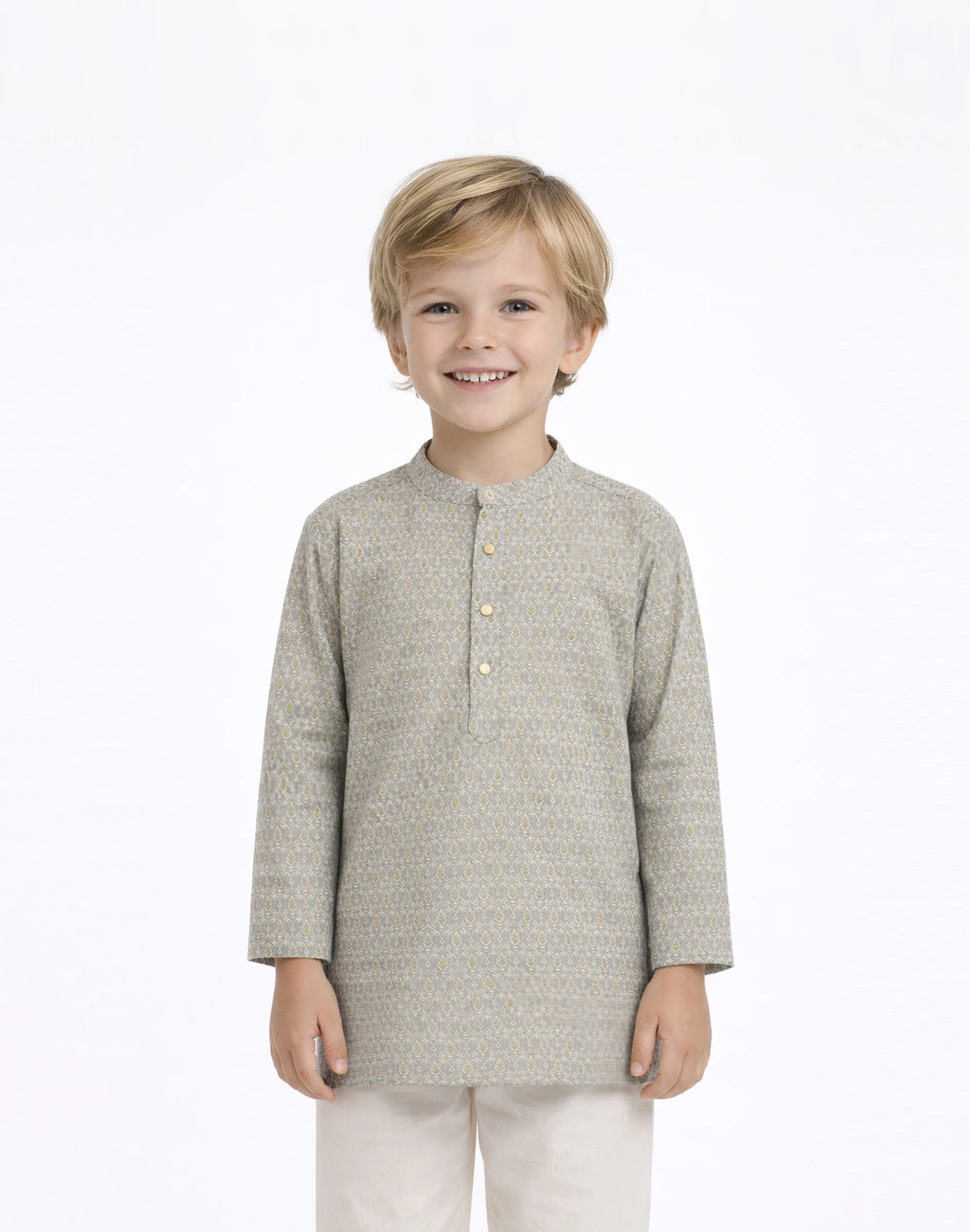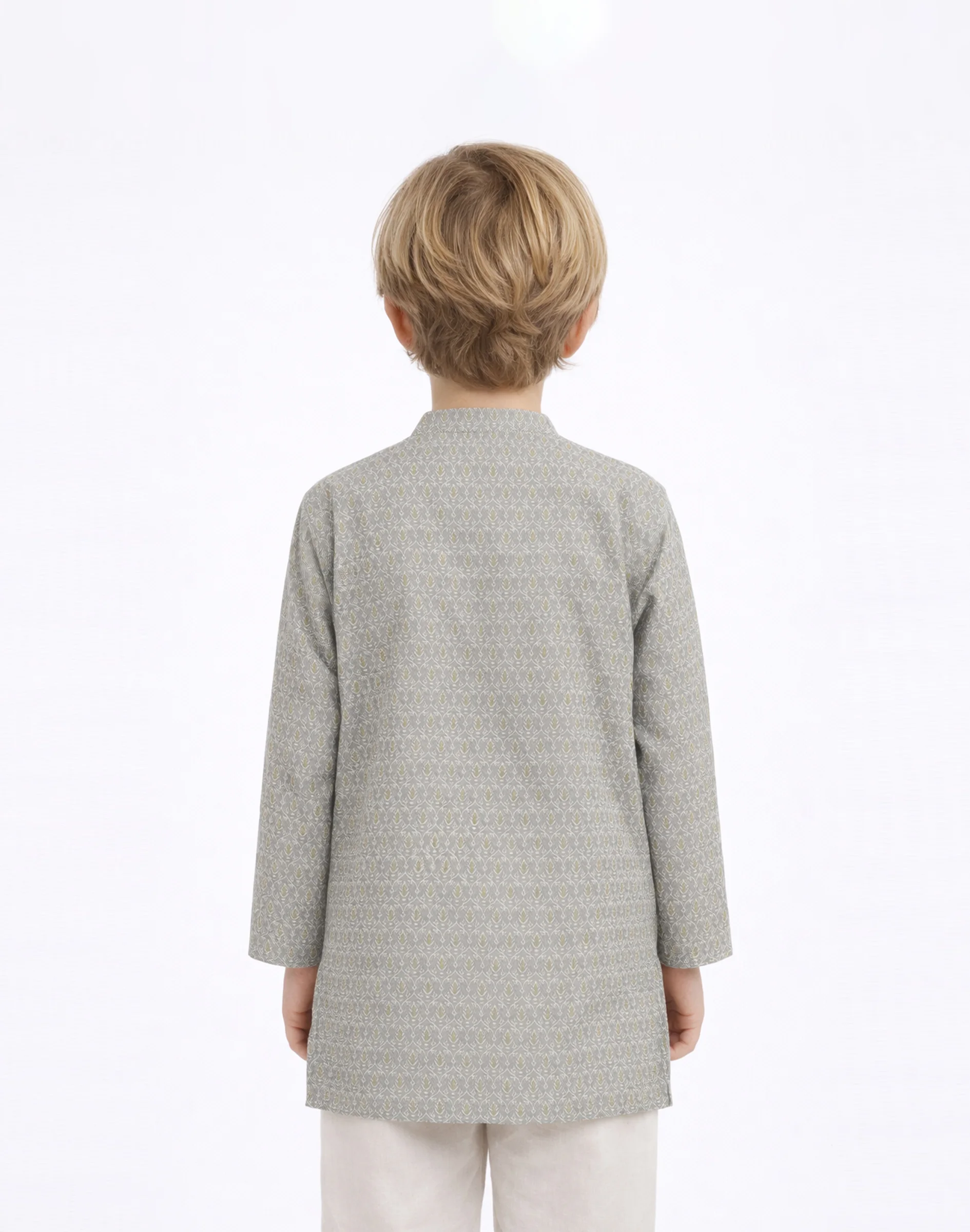 This boys’ kurta in a soft light grey tone features delicate all-over traditional prints that add texture and sophistication without overpowering the design. The muted color palette makes it a versatile choice for both daytime and evening occasions. Designed with a mandarin collar, a buttoned placket, and full sleeves, it offers a timeless ethnic silhouette with a modern touch. Crafted from breathable and comfortable fabric, this kurta ensures ease of movement and all-day comfort, making it ideal for festive celebrations, family gatherings, and special occasions. Its understated elegance makes it a wardrobe essential.