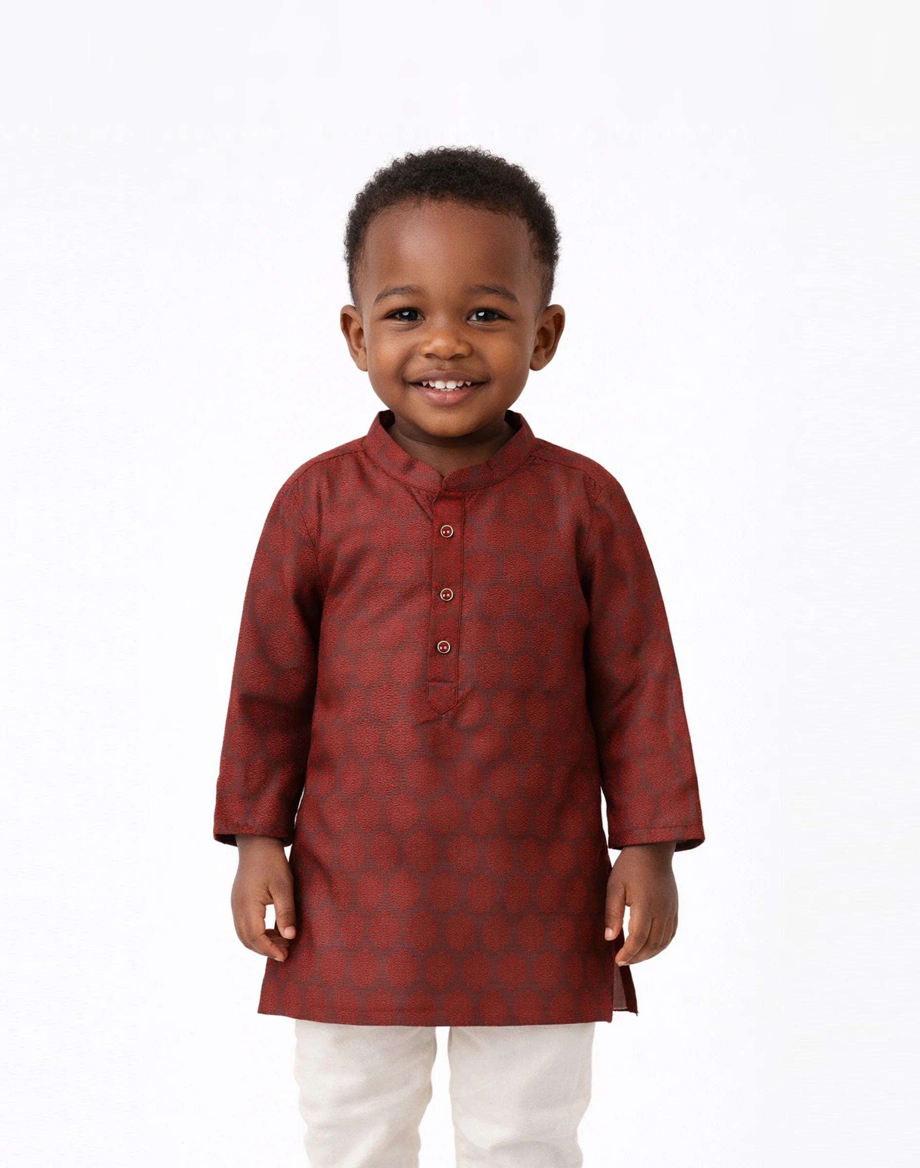 A rich maroon kurta with elegant jacquard patterning, crafted for a premium festive look.