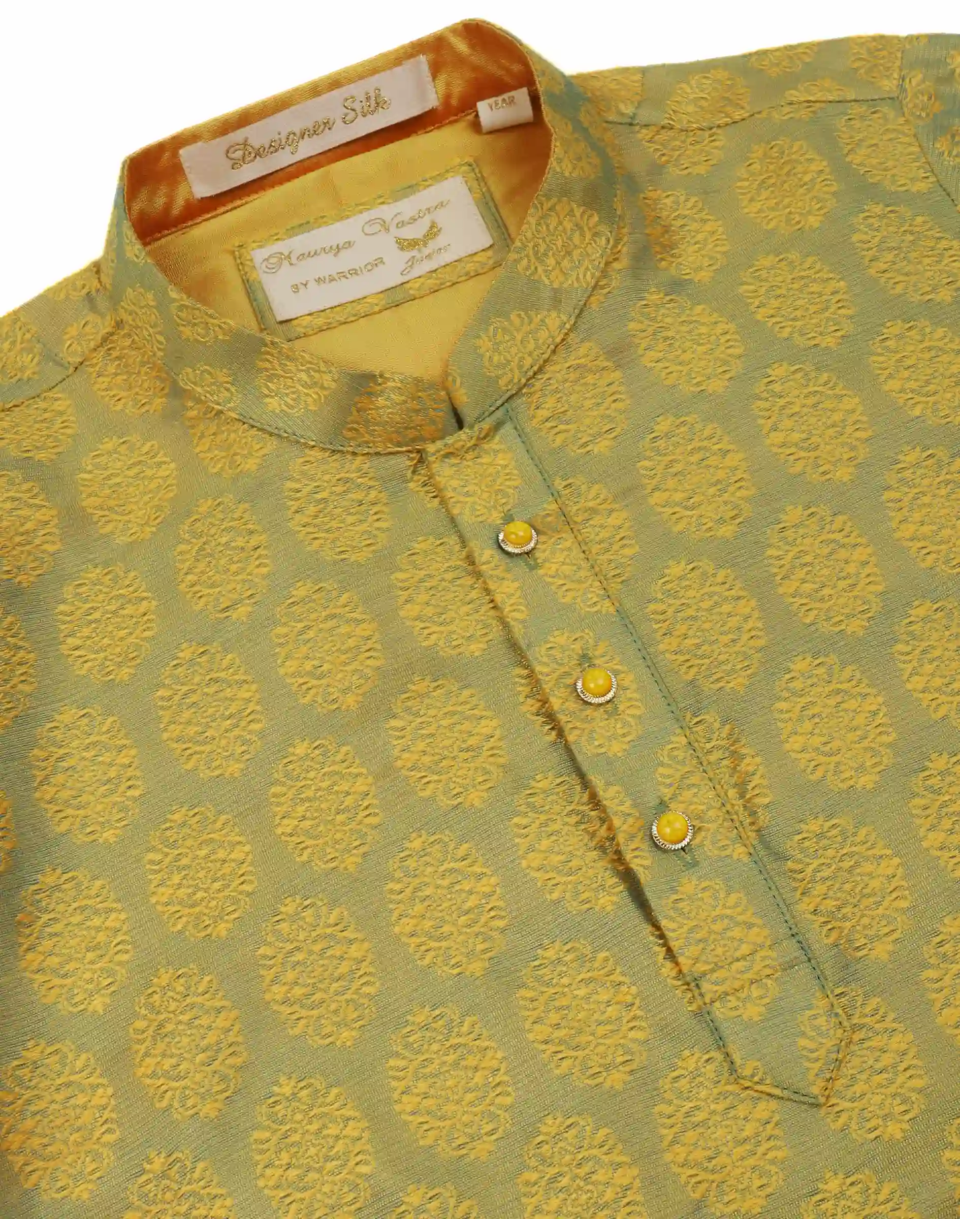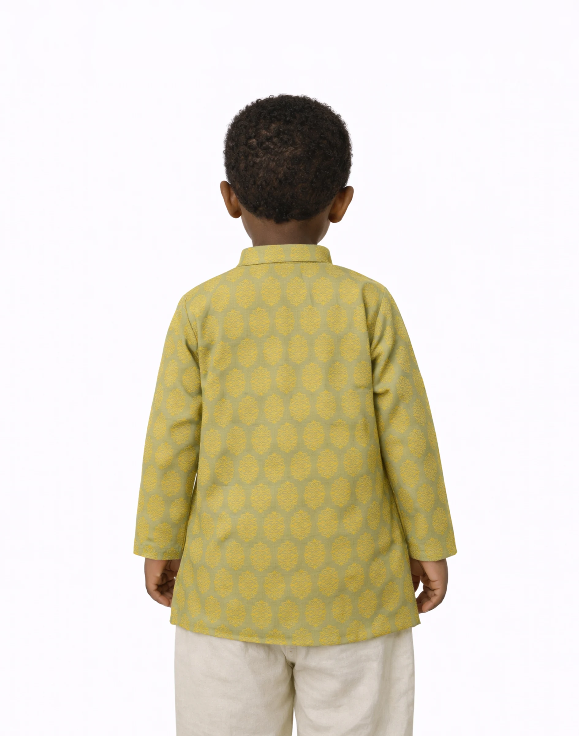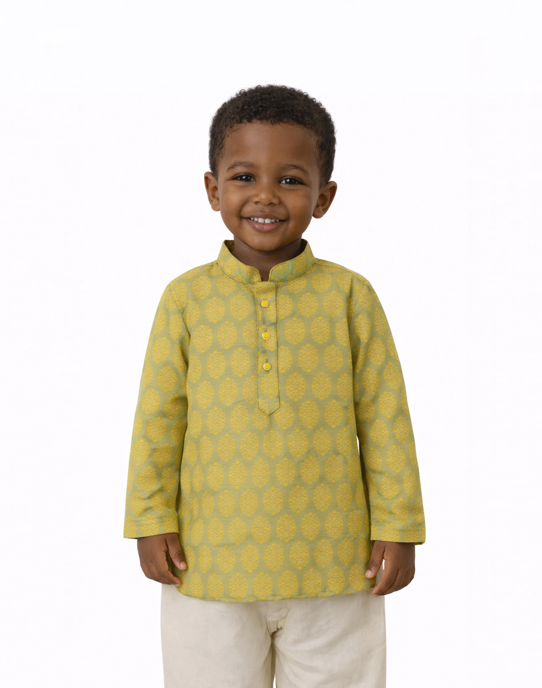 This boys’ kurta showcases a unique blend of olive green base with intricately woven mustard motifs, creating a striking and elegant contrast. The jacquard texture enhances the richness of the fabric, giving it a premium festive appeal. Designed with a mandarin collar, a buttoned placket, and full sleeves, it offers a timeless ethnic silhouette. The breathable fabric ensures comfort and ease of movement, making it ideal for long celebrations, weddings, and cultural occasions. Its distinctive color combination and detailed craftsmanship make it a standout piece in any festive wardrobe.