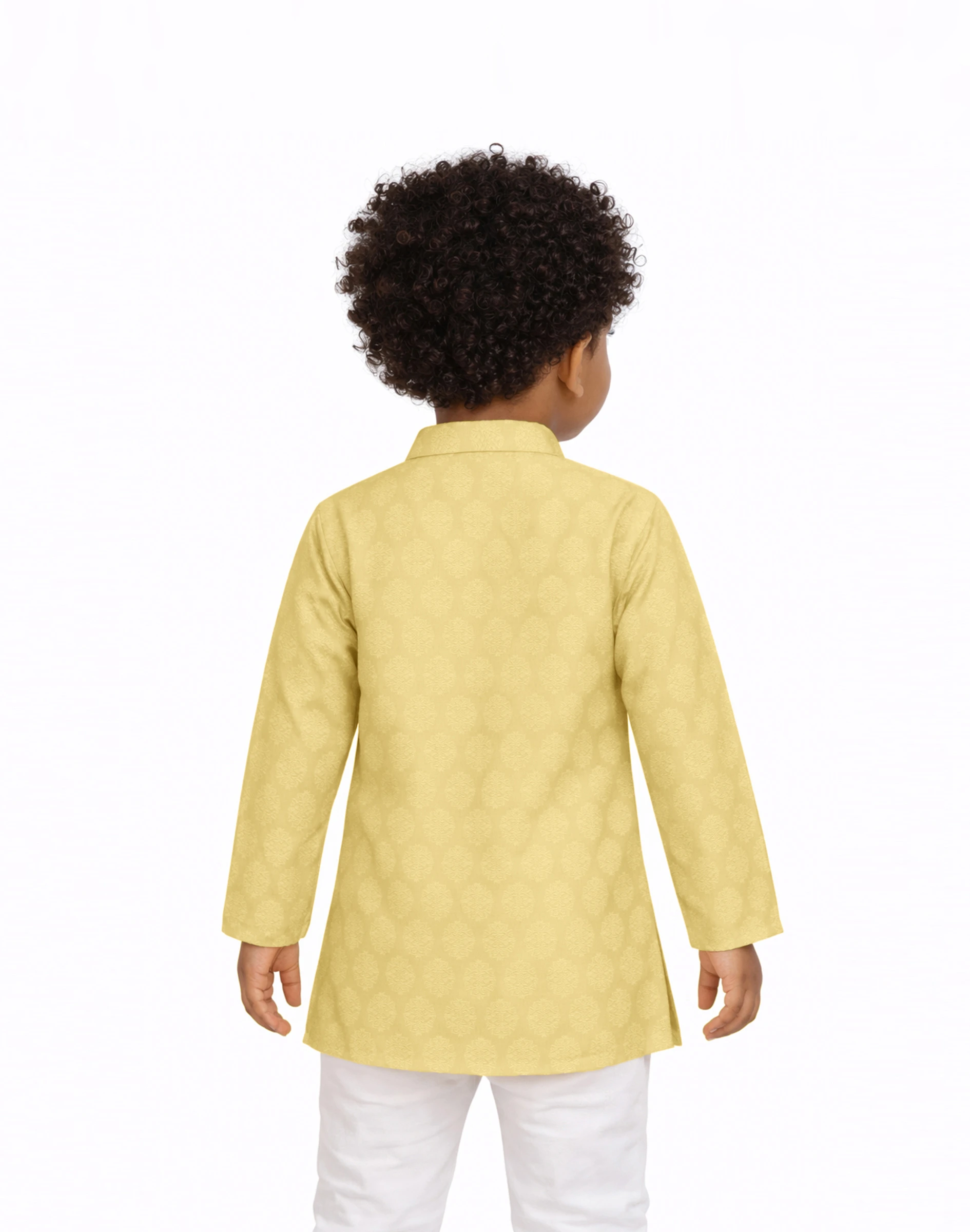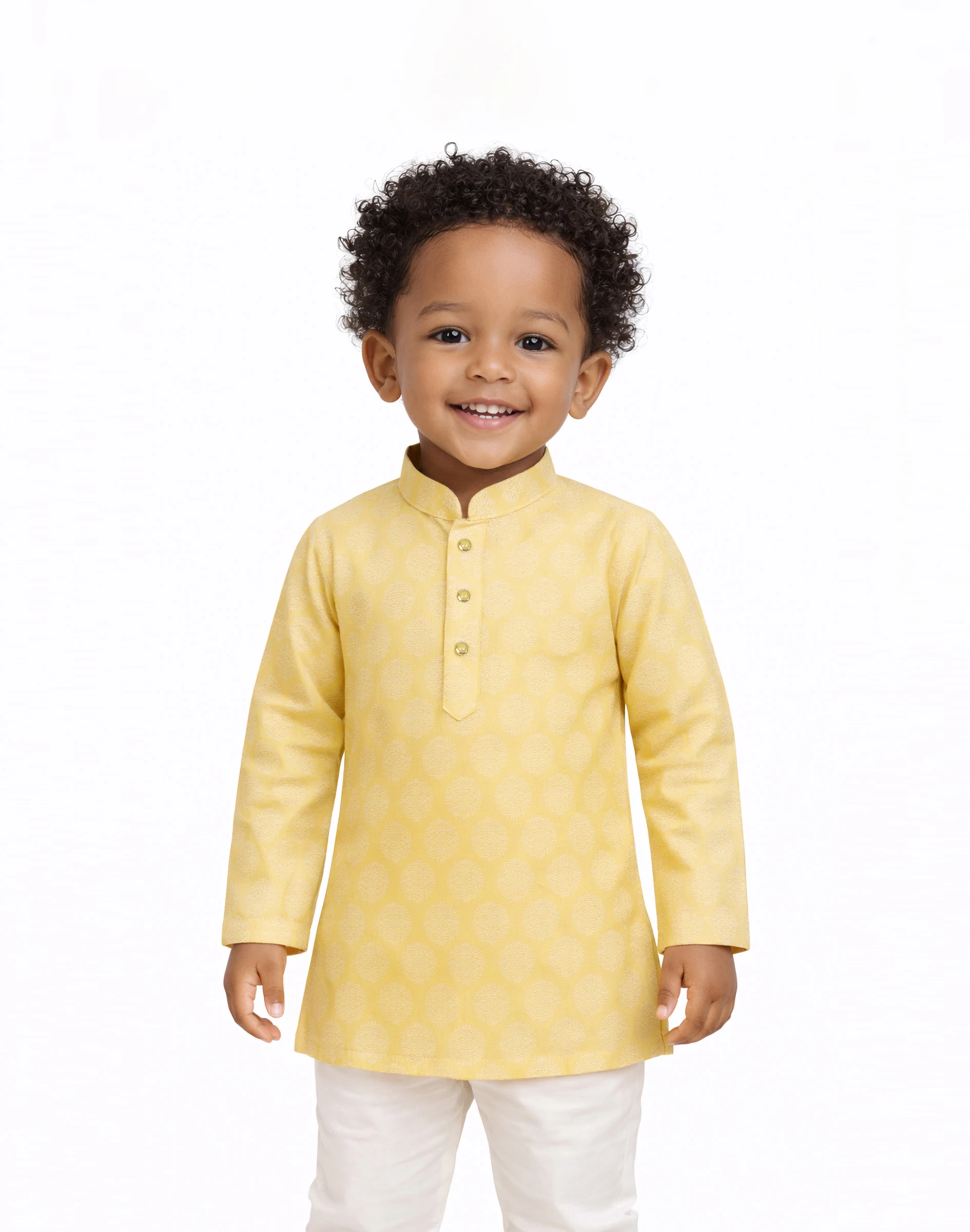 This boys’ pastel yellow kurta is designed to bring a soft and sophisticated charm to festive dressing. Featuring delicate self-textured motifs across the fabric, it offers a refined and minimal aesthetic while maintaining traditional appeal. The mandarin collar and buttoned placket enhance its classic silhouette, while the full sleeves provide a neat and polished finish. Crafted from breathable fabric, this kurta ensures all-day comfort and ease of movement, making it ideal for celebrations, family gatherings, and special occasions. Its light tone and intricate texture create a timeless and graceful look.