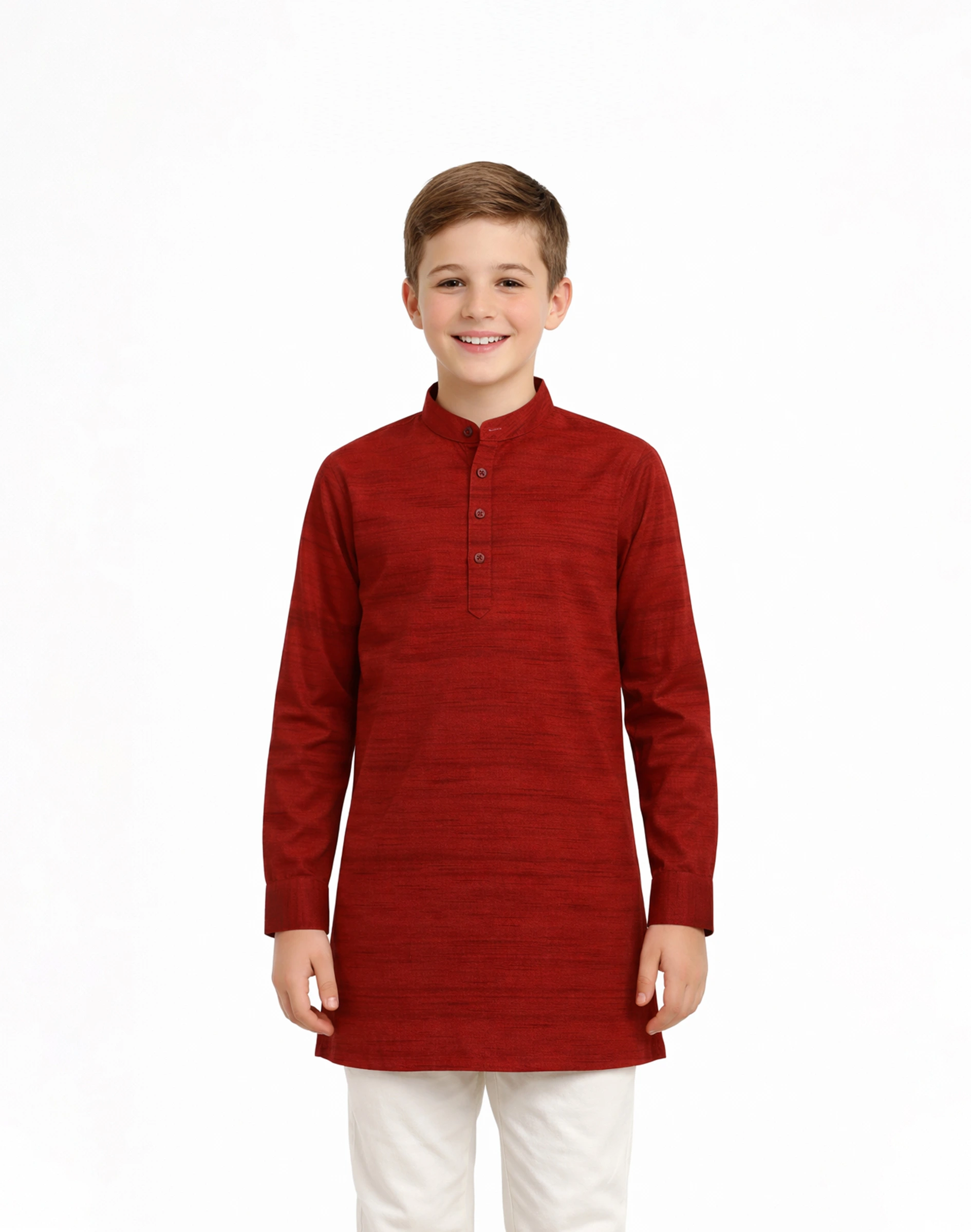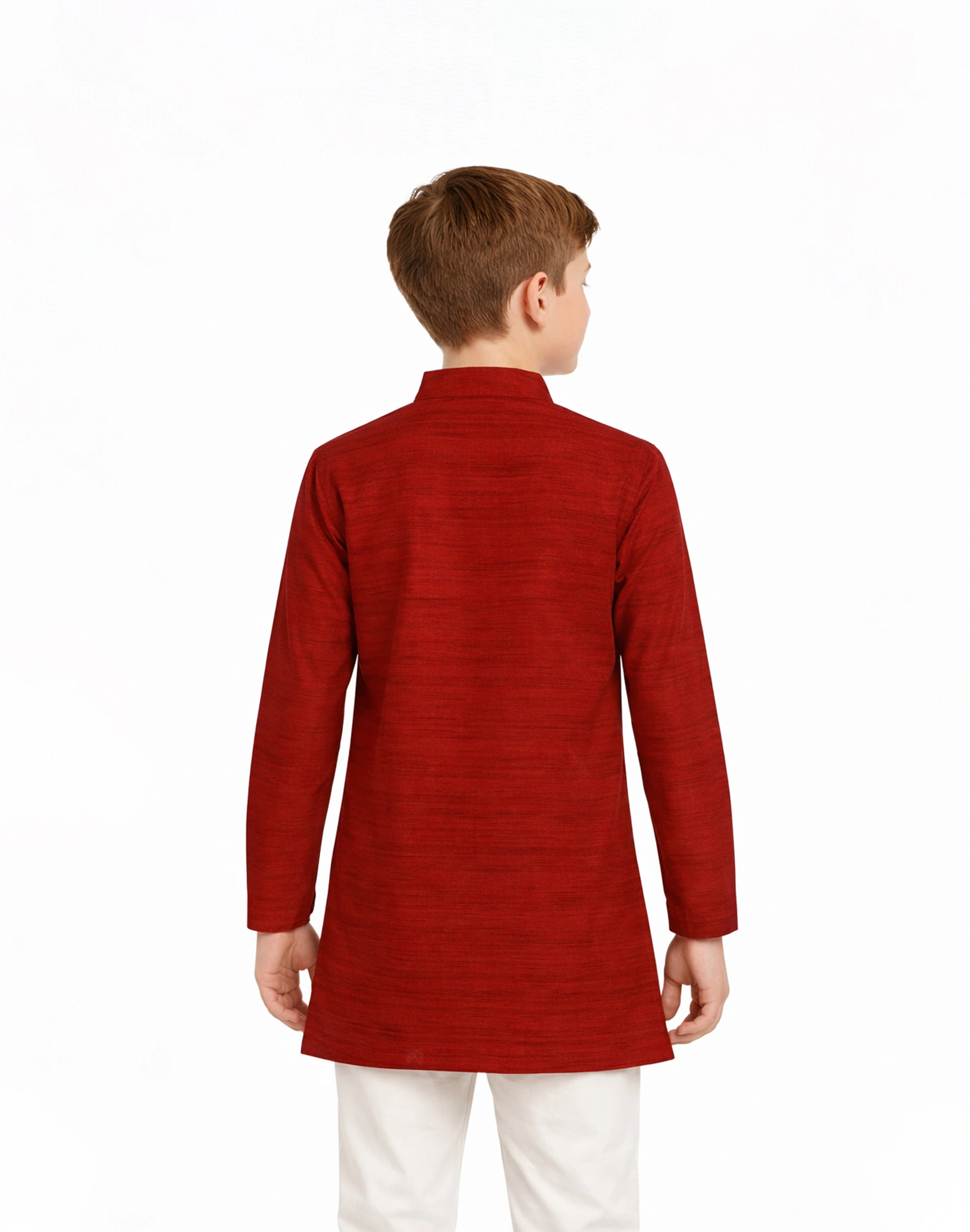 The Maurya Vastra Boys Red Raw Silk Festive Kurta is a timeless celebration piece crafted to bring out a regal ethnic charm. Made from premium raw silk, this kurta features a naturally textured weave that adds depth and richness to its vibrant red hue. The classic mandarin collar and neatly structured placket with tonal buttons enhance its refined look, while the straight silhouette ensures a comfortable and flattering fit. Perfect for festivals, weddings, and traditional occasions, this kurta strikes the perfect balance between minimal elegance and festive grandeur. Its breathable yet luxurious fabric makes it ideal for long wear without compromising on style.