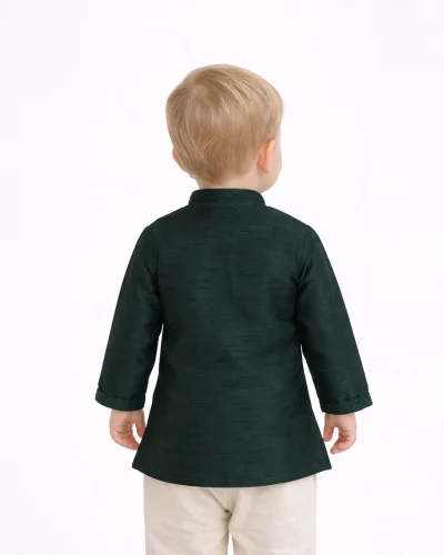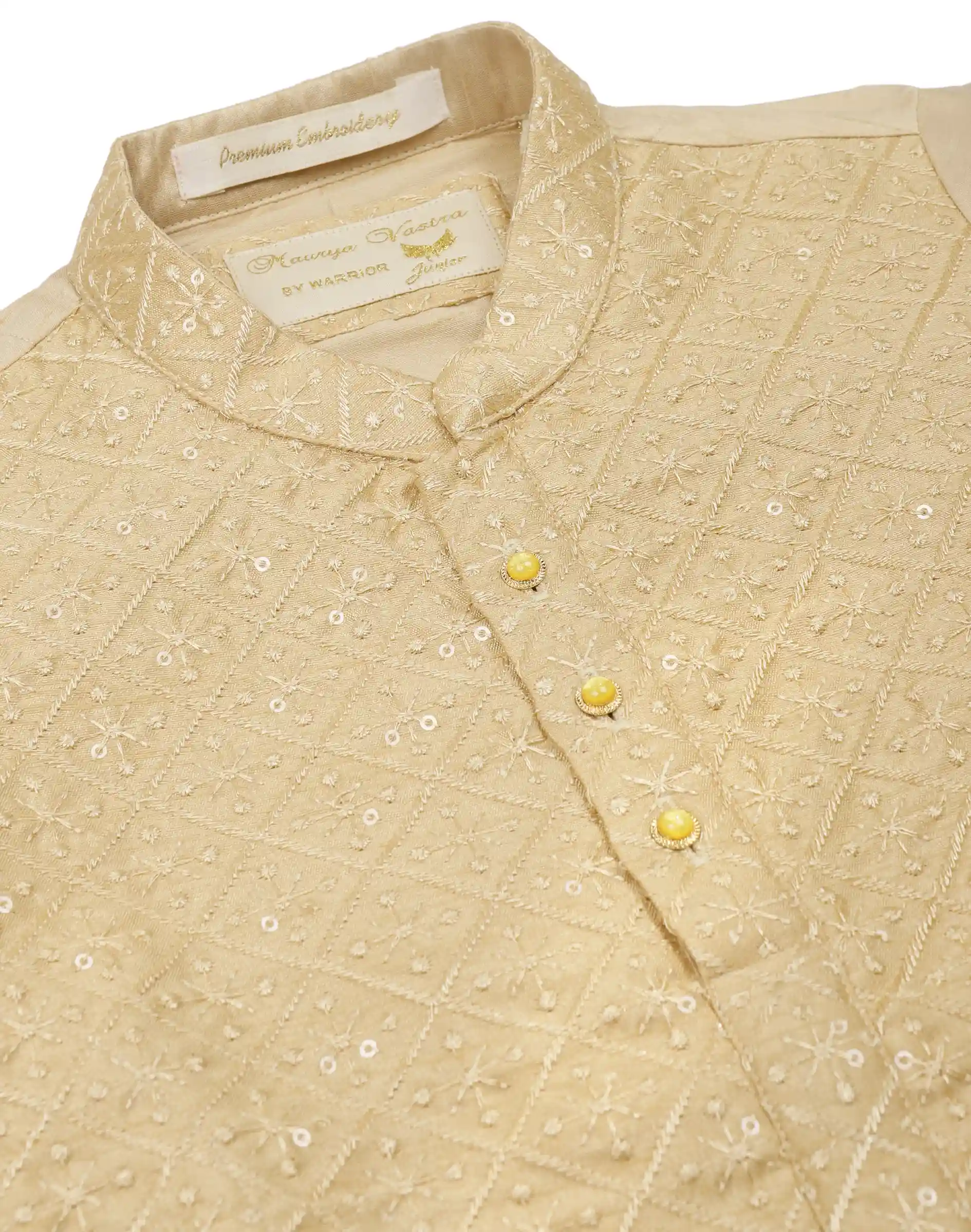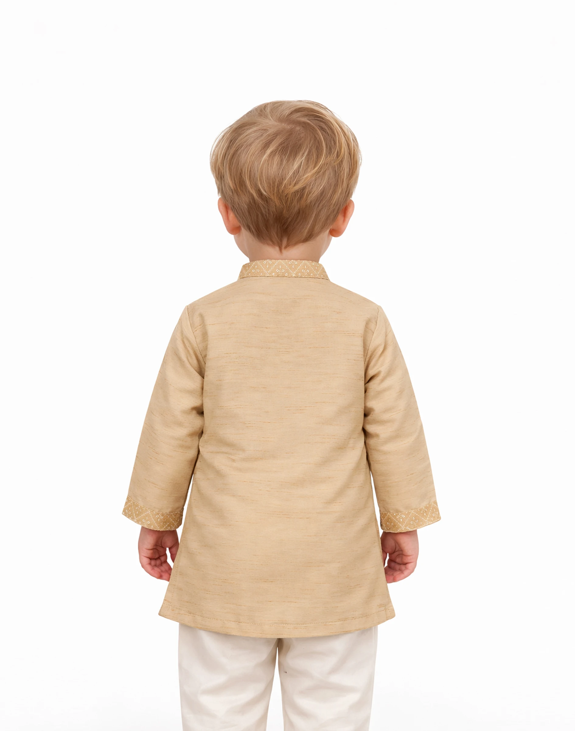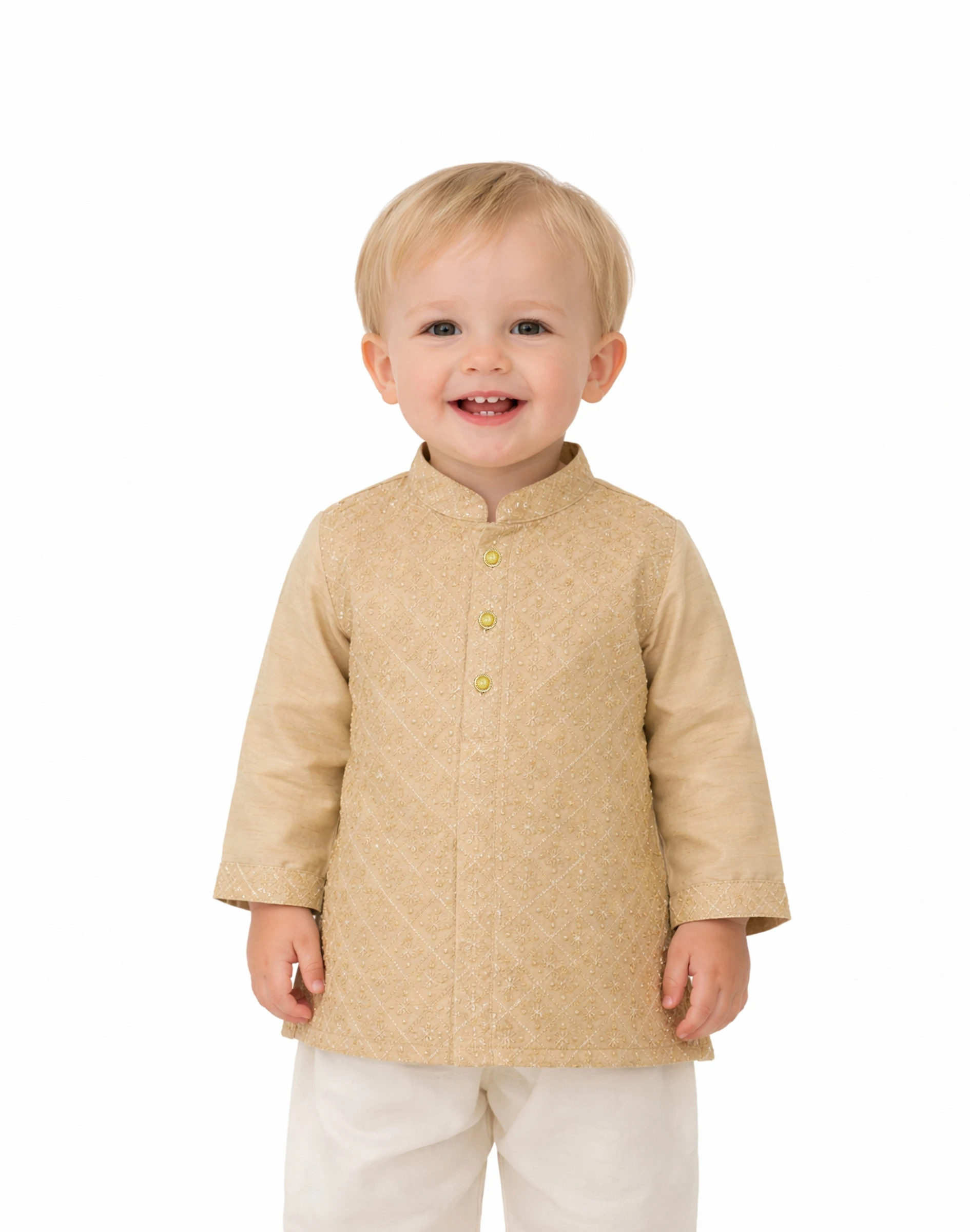 This sand beige festive kurta is a perfect blend of subtle luxury and traditional charm. Adorned with fine, all-over embroidery in a geometric pattern, it offers a refined texture that elevates its overall appeal. The soft neutral tone enhances its versatility, making it suitable for a wide range of occasions—from festive celebrations to weddings. Designed with a mandarin collar, coordinated buttons, and full sleeves, this kurta ensures a polished and comfortable fit for your little one. The lightweight fabric allows ease of movement while maintaining a structured and elegant silhouette.