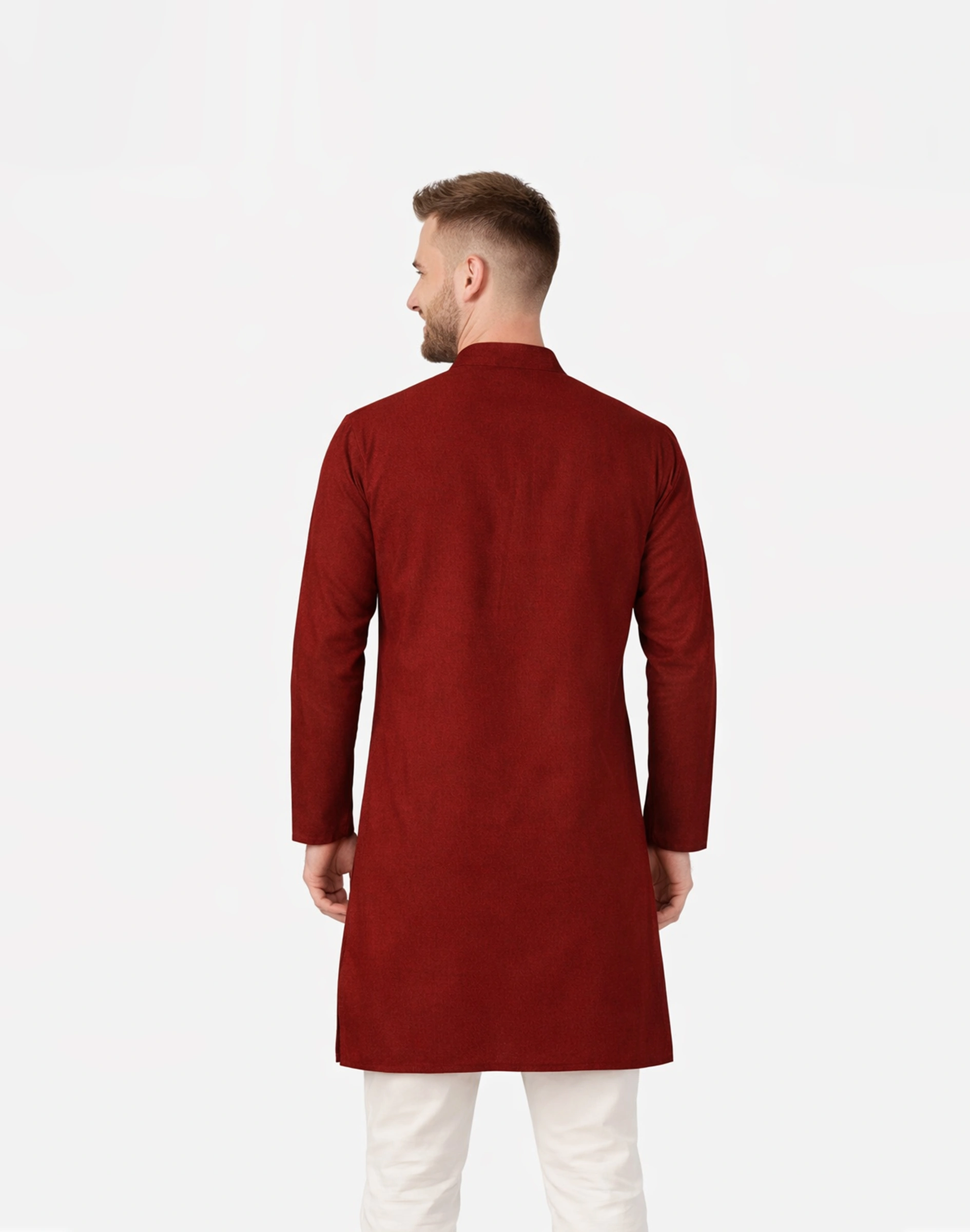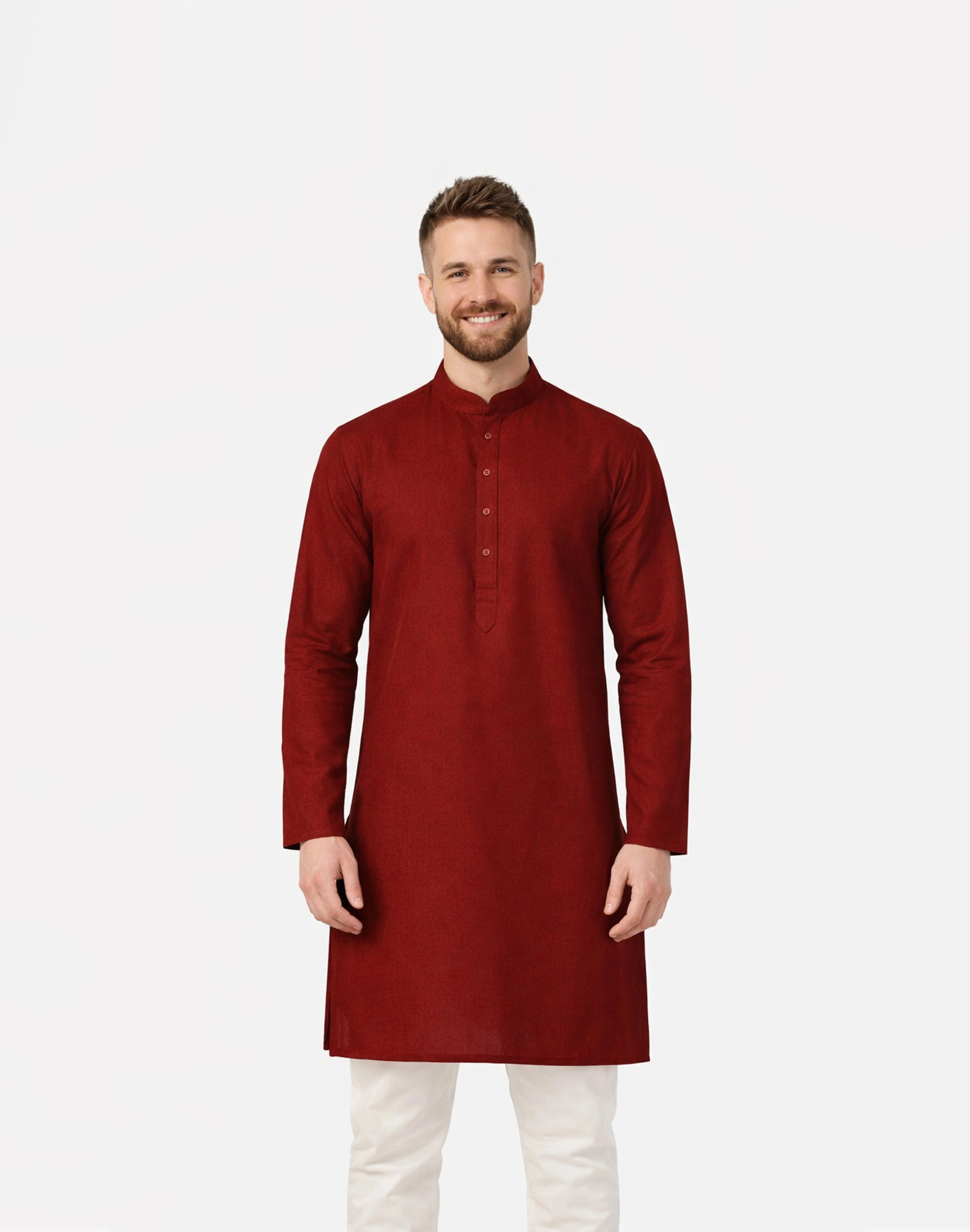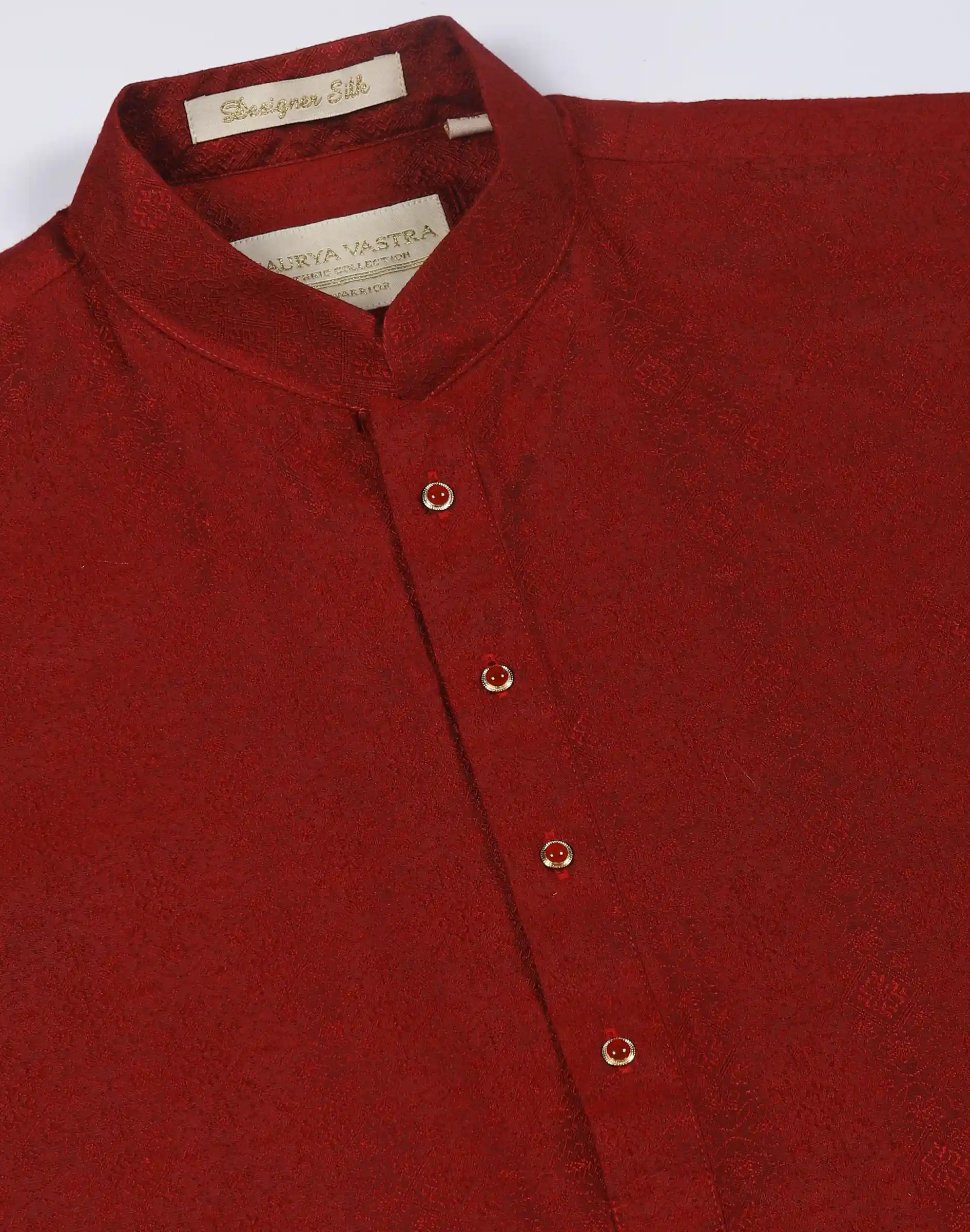 Elevate your festive wardrobe with the Maurya Vastra Classic Ruby Red Textured Silk Kurta, a perfect blend of tradition and contemporary sophistication. Crafted in a rich ruby red hue, this kurta features a finely woven self-textured pattern that adds depth while maintaining a clean and refined look. The soft sheen of the fabric enhances its luxurious appeal, making it an ideal choice for celebrations, weddings, and evening occasions. Designed with a classic mandarin collar and a sleek button placket adorned with elegant buttons, this kurta offers a sharp and polished silhouette. The full sleeves and tailored fit ensure a structured yet comfortable wear, allowing you to move effortlessly while looking impeccably dressed. Its vibrant yet refined tone makes it a standout piece for any special occasion