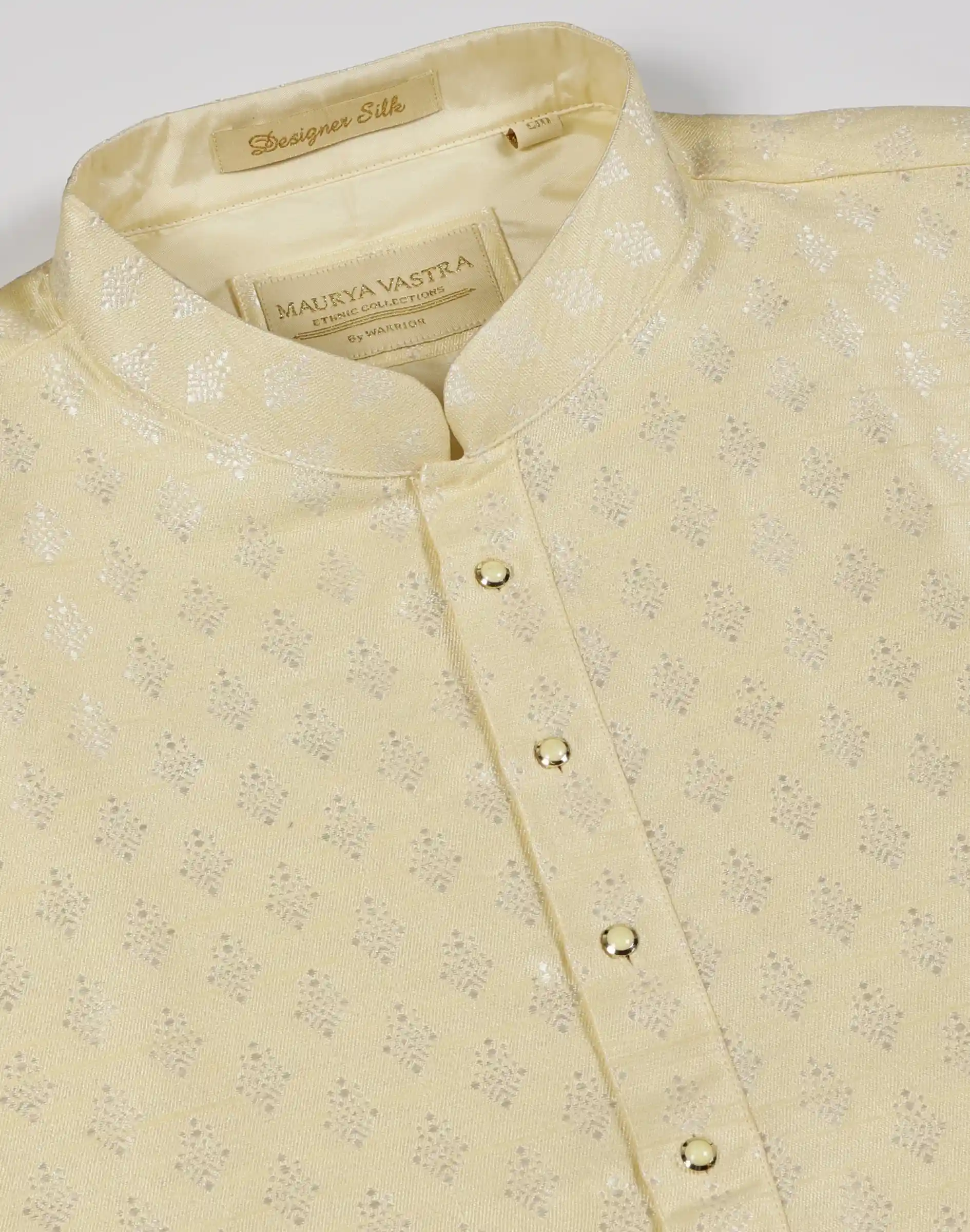 A refined cream kurta with delicate micro-brocade motifs and a smooth sheen, ideal for elegant festive occasions.
