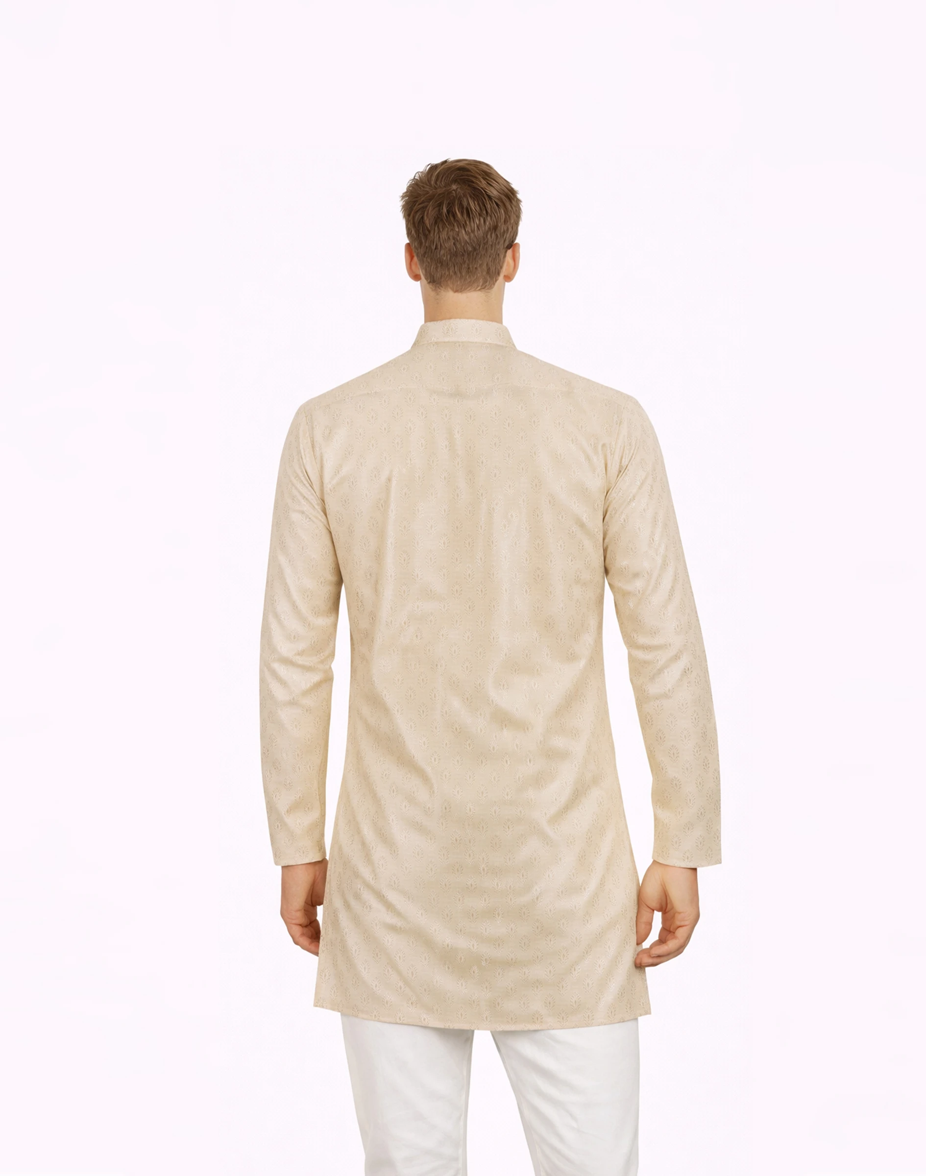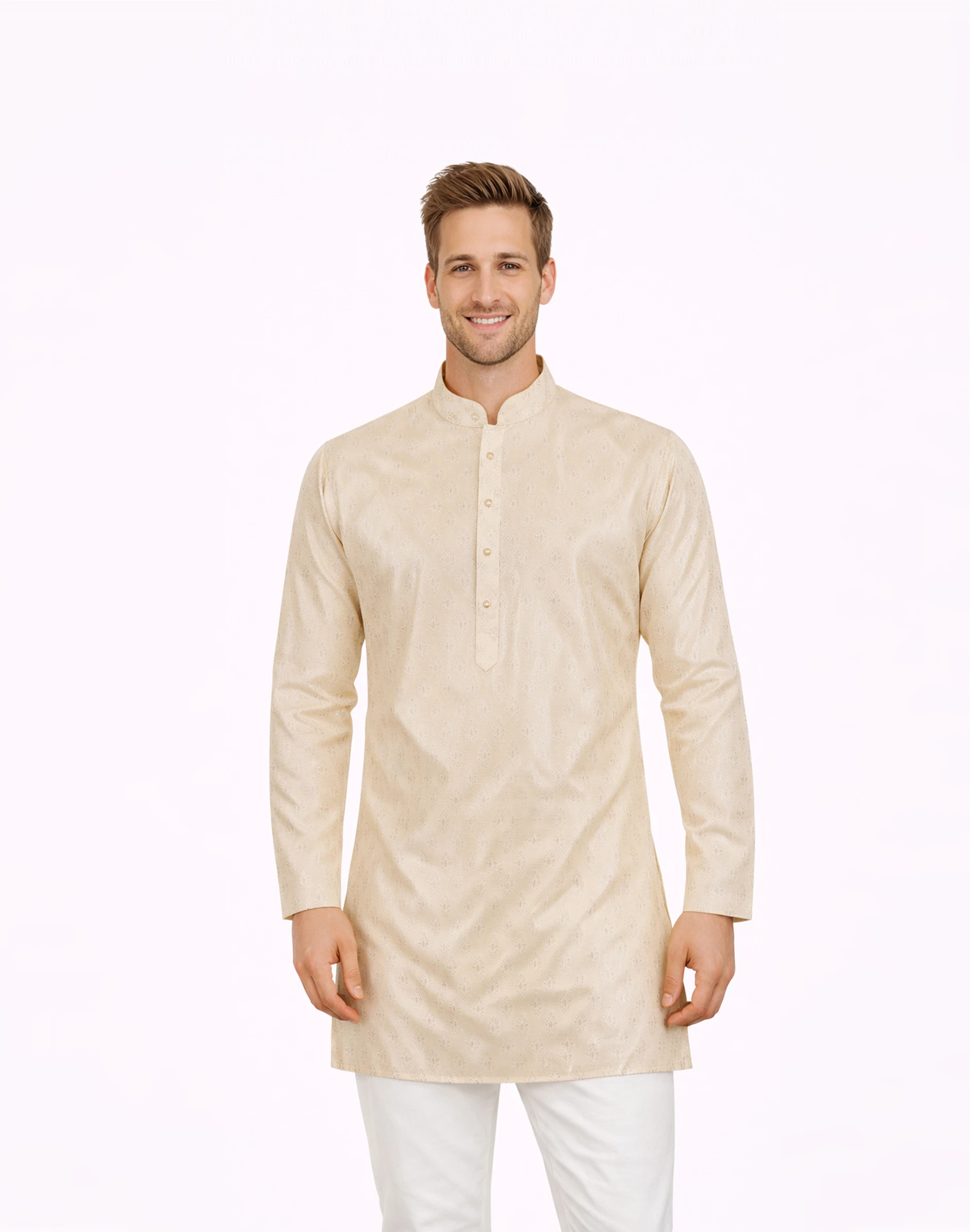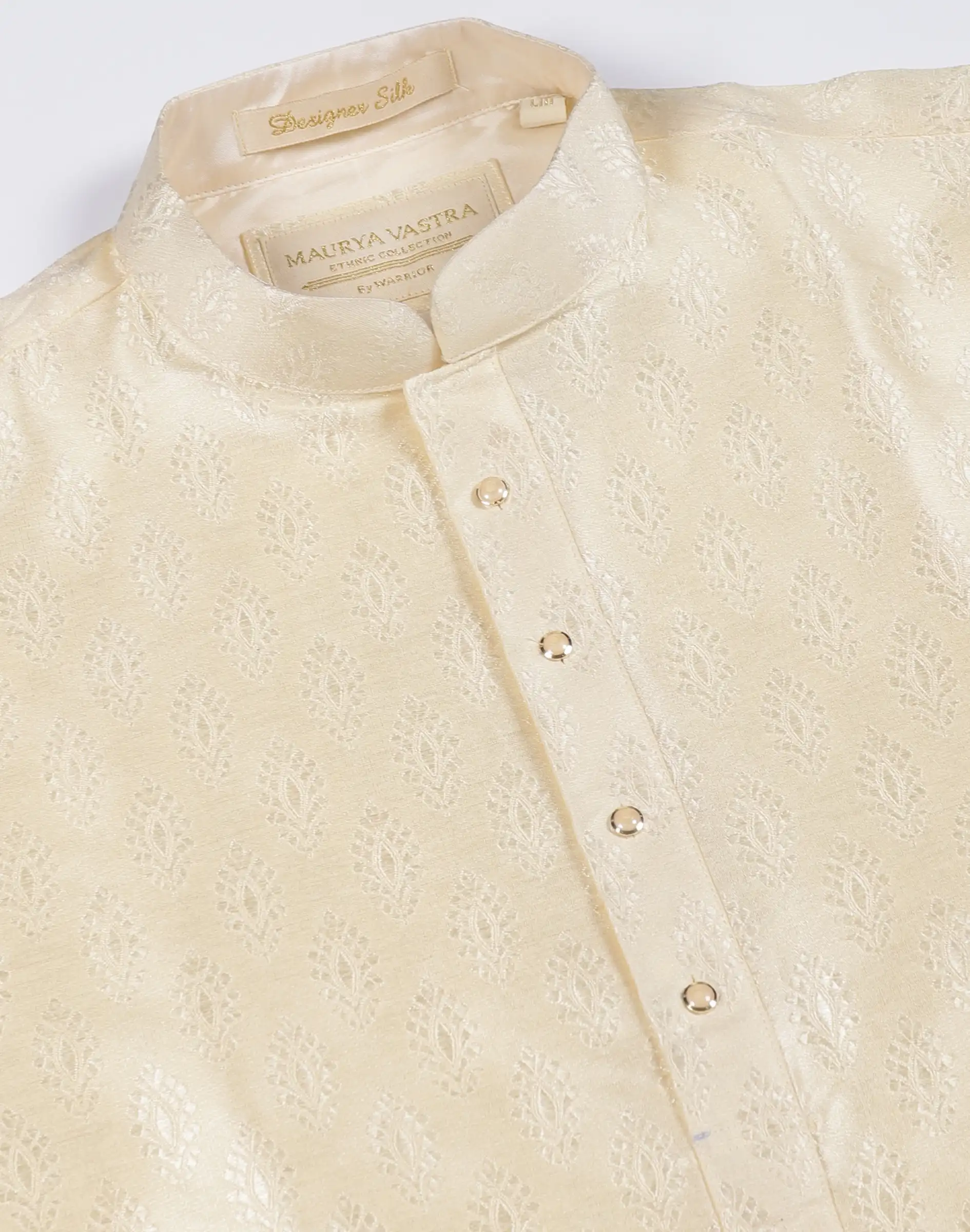 An elegant cream kurta crafted in premium designer silk with a subtle self-design pattern, perfect for understated festive sophistication.