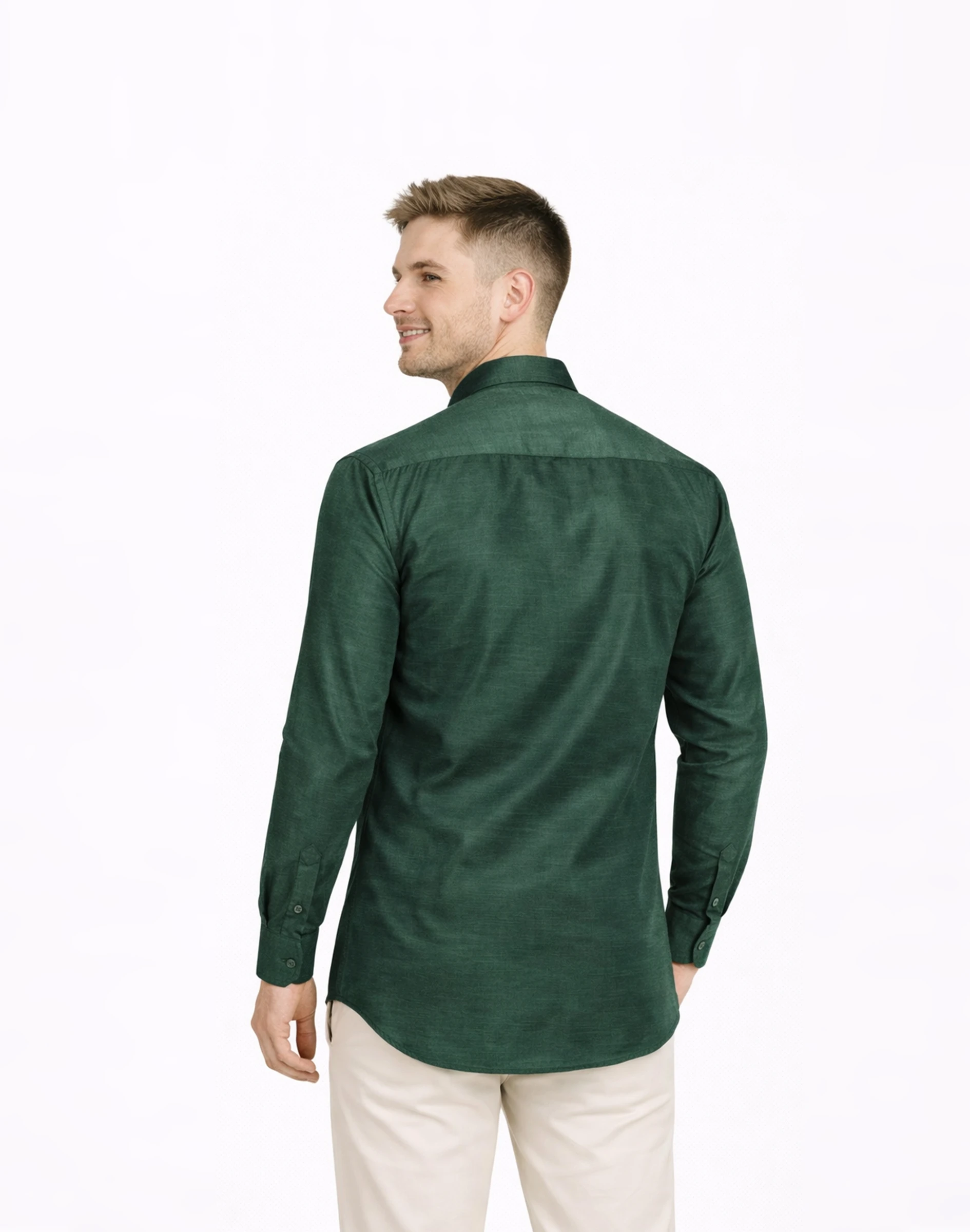 A rich forest green raw silk shirt with a subtle sheen, designed for refined style and versatile wear.