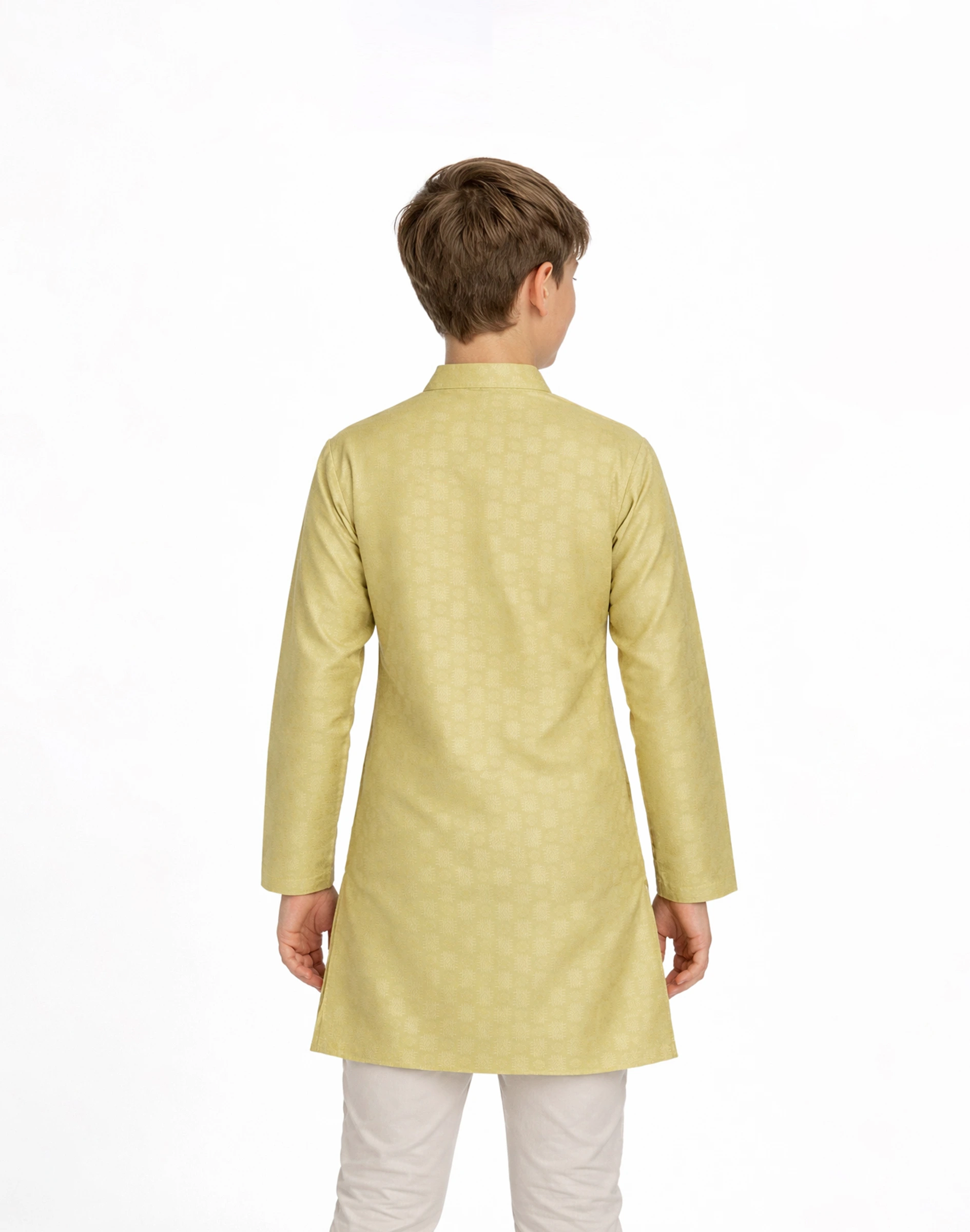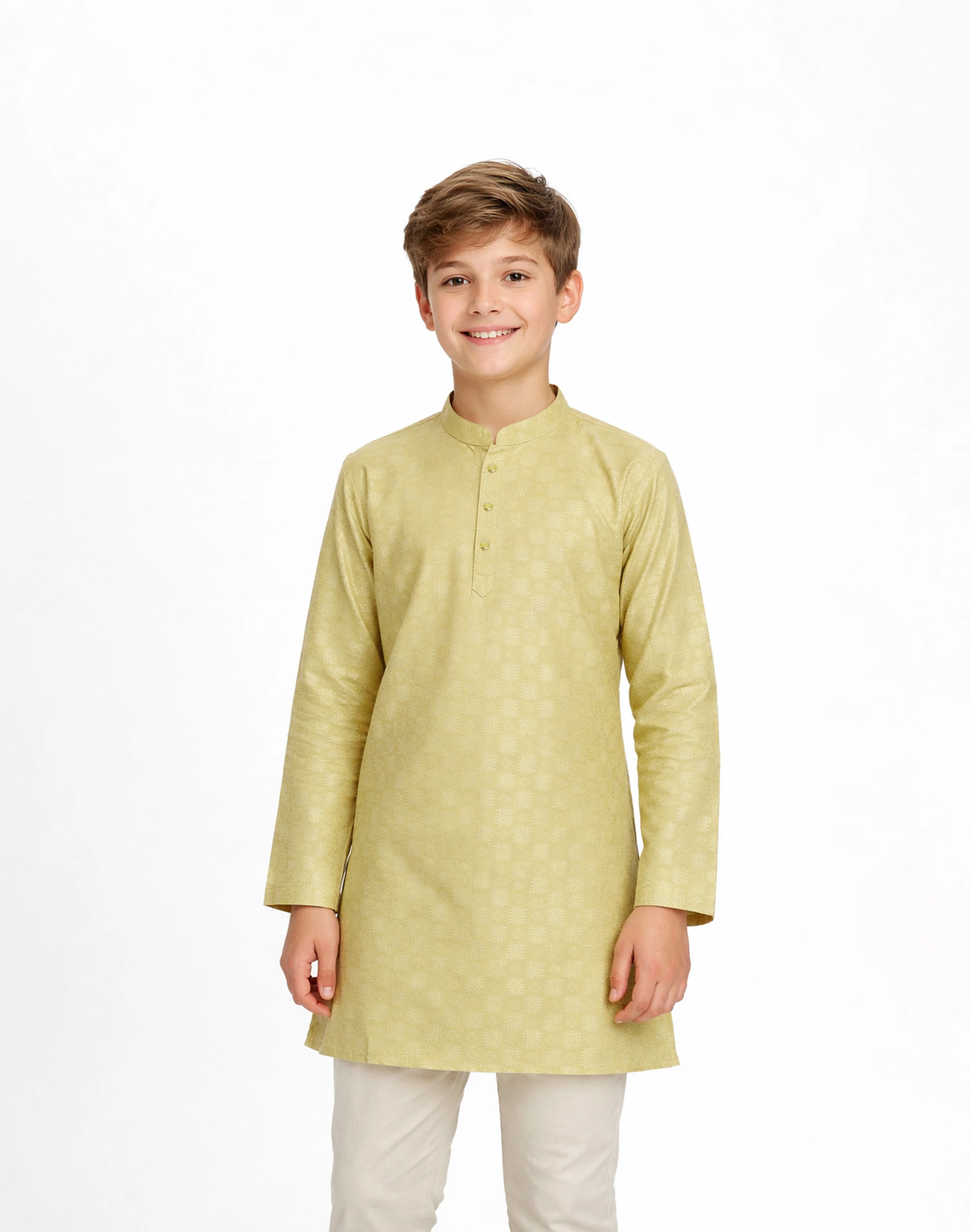 Subtle pistachio green jacquard silk kurta for kids, crafted for comfort and festive elegance.
