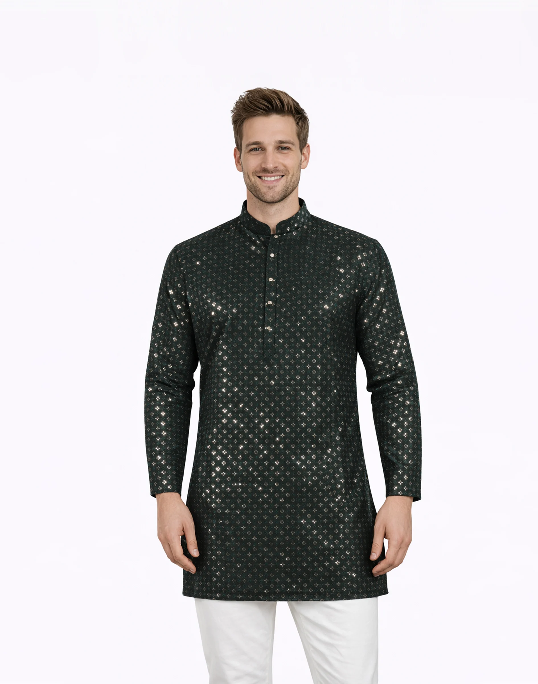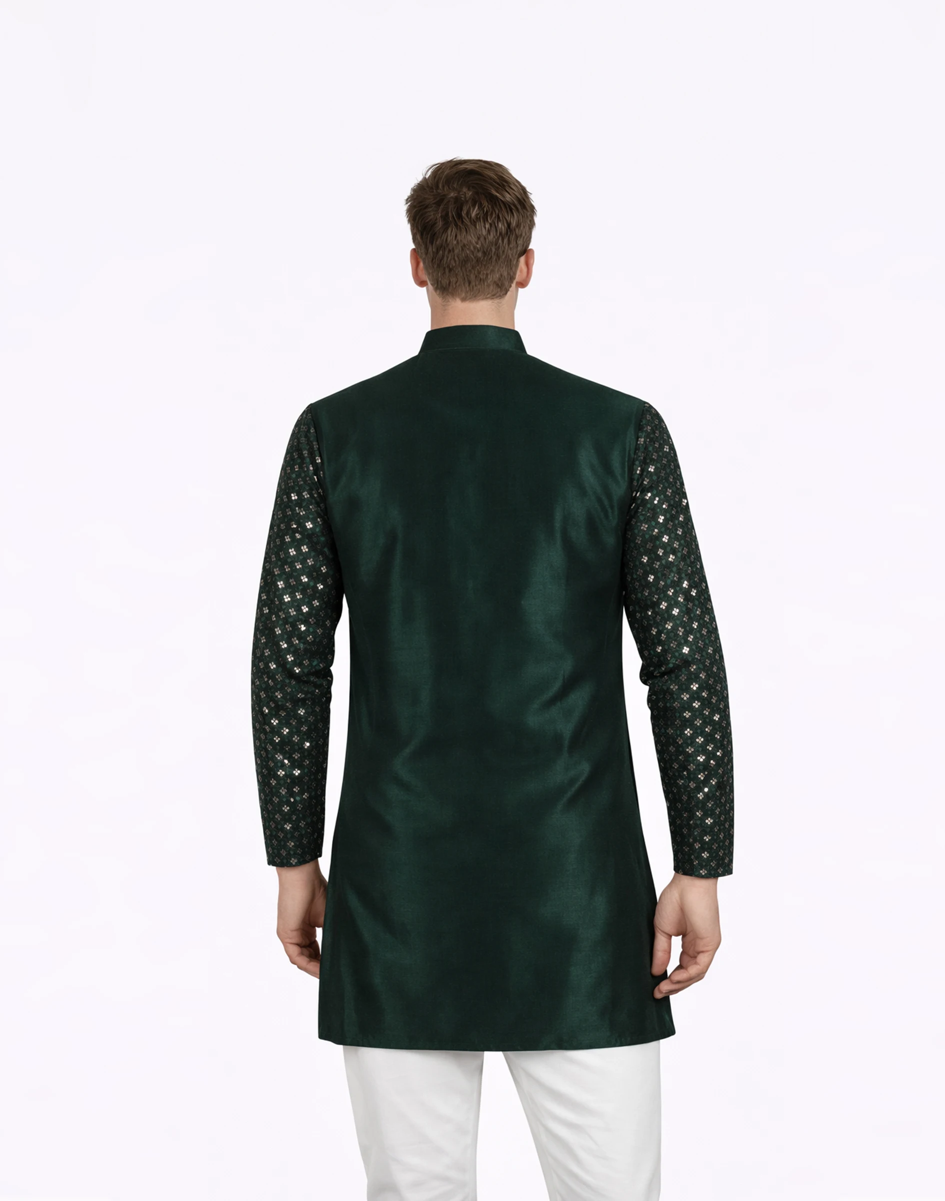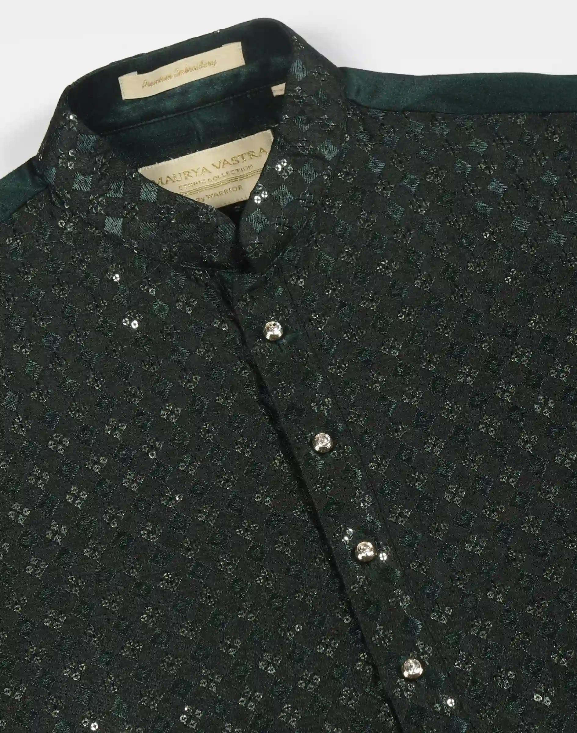 Deep, captivating, and effortlessly luxurious the Maurya Vastra Emerald GREEN Designer Brocade Kurta is crafted for moments that call for refined distinction. Woven in a premium silk blend, the brocade fabric reveals intricate motifs layered with a delicate shimmer, creating a sophisticated interplay of light and texture. The rich emerald base, almost GREEN in its depth, exudes understated opulence making it an ideal choice for evening celebrations, receptions, and festive gatherings. The subtle sparkle woven into the fabric enhances its presence without overpowering its elegant character. Designed with a structured mandarin collar and a clean, tailored placket, the silhouette remains sharp and contemporary. The fluid drape and lightweight construction ensure comfort, while the fabric’s natural sheen elevates its premium appeal. This kurta is for the modern gentleman who prefers elegance with impact refined, confident, and effortlessly striking.