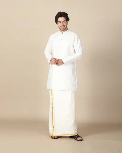 Tailored in a classic straight fit, the Maurya Vastra kurta drapes elegantly, offering both comfort and structure—making it ideal for ceremonial wear and extended occasions. The elegant ecru tone is enhanced with understated woven motifs, while the mandarin collar and clean minimal placket provide a refined, polished profile. Full sleeves with a straight finish and thoughtful tailoring complete the premium aesthetic, perfectly complemented when paired with a traditional off-white dhoti featuring a rich gold zari border.