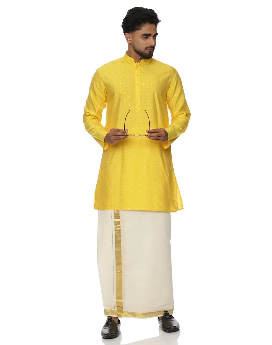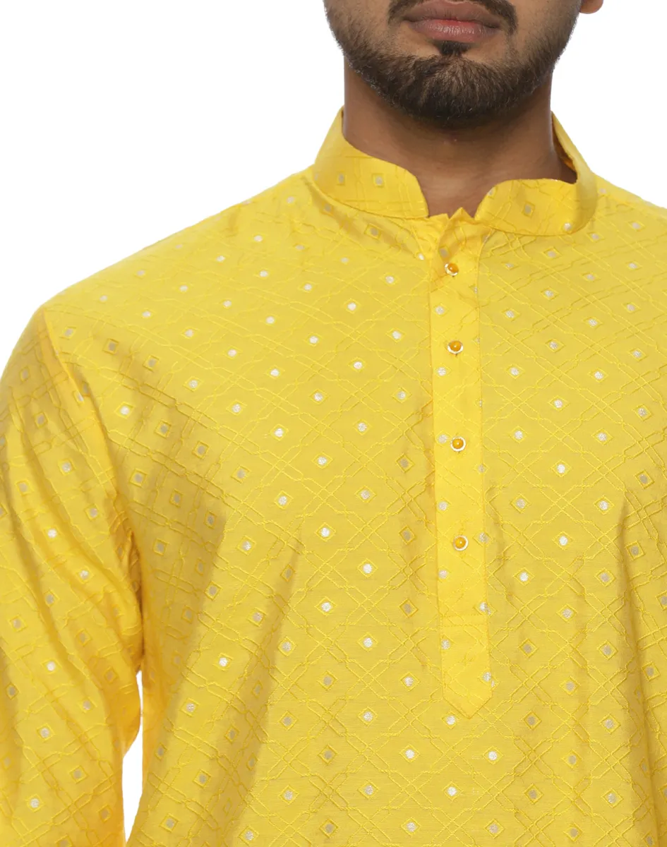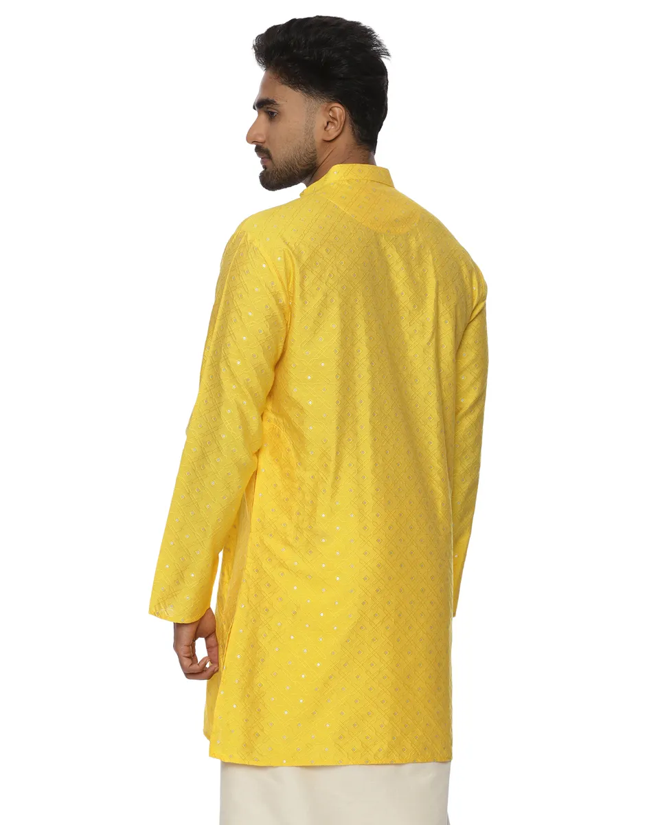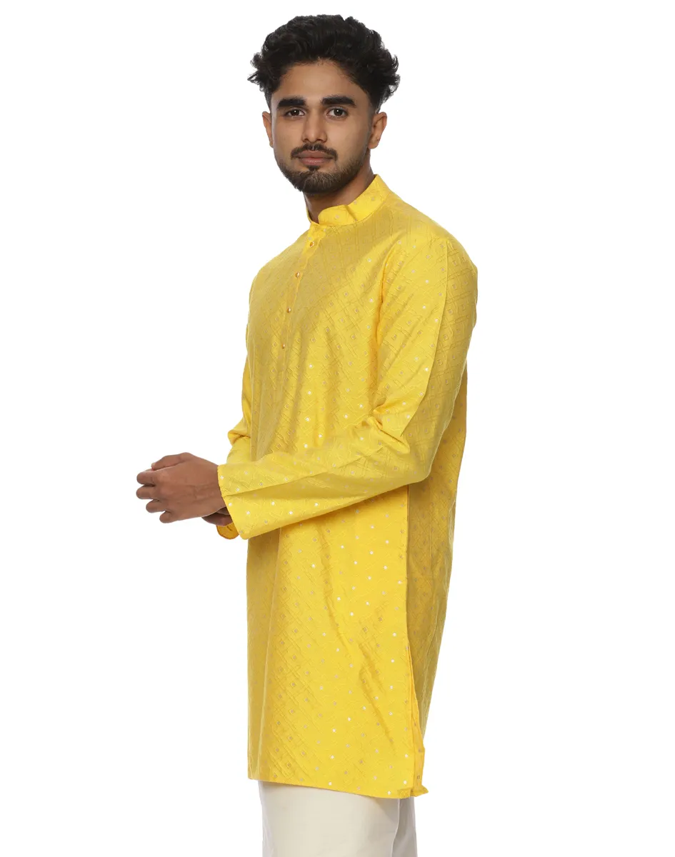 A vibrant yellow kurta with subtle woven detailing, designed to bring refined brightness to festive occasions.
