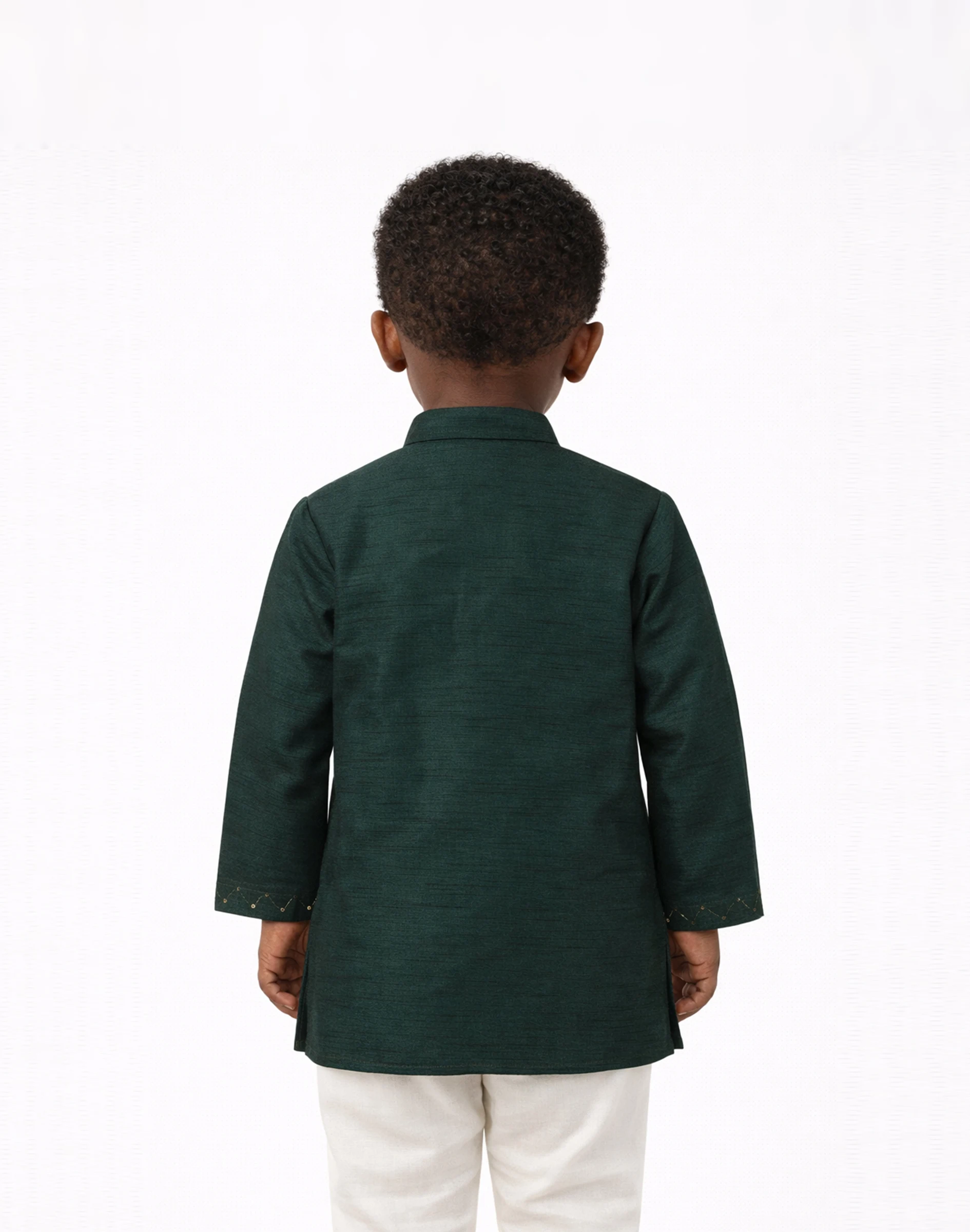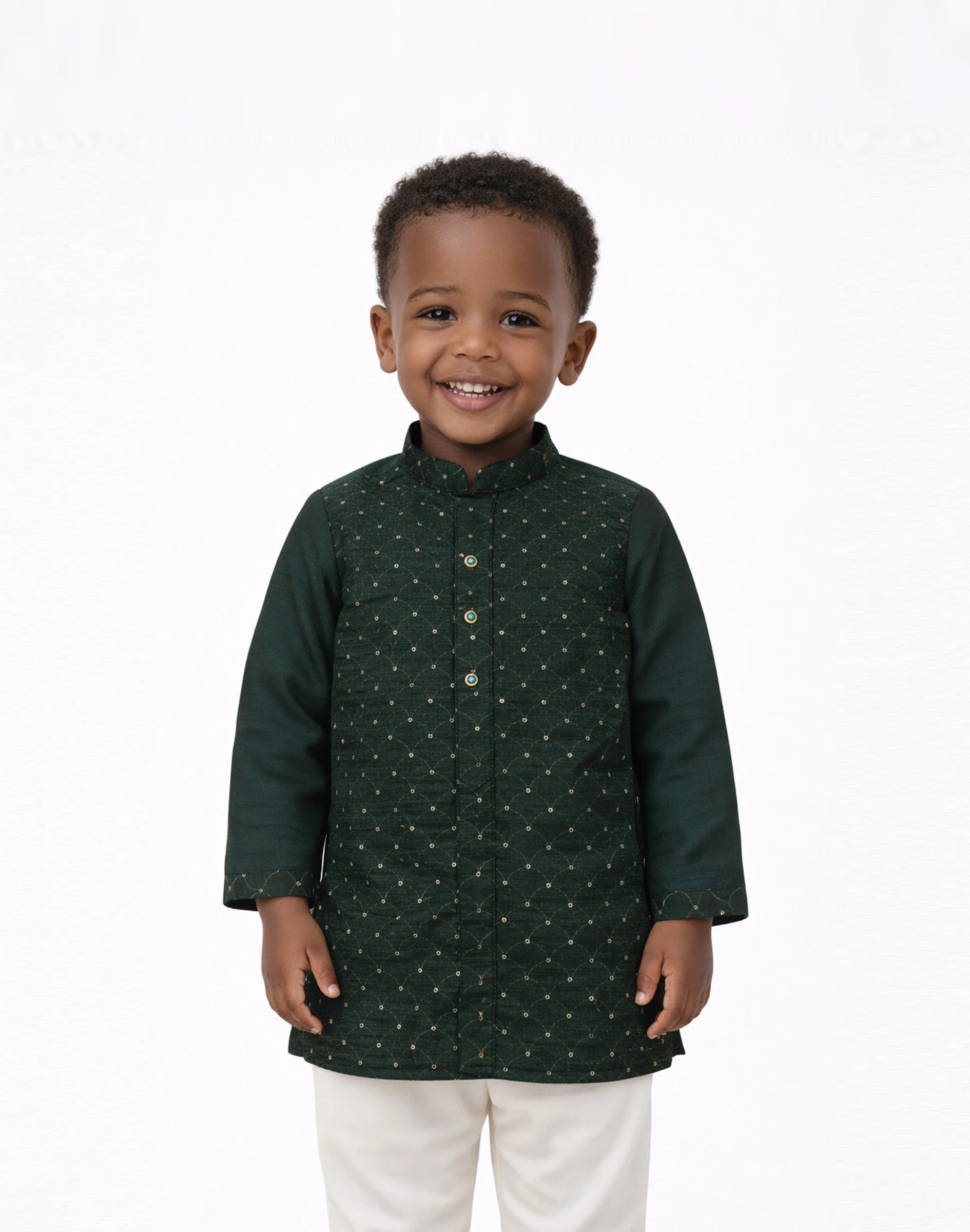 This sophisticated boys’ kurta set in a deep forest green shade is designed to bring a refined festive appeal. The kurta features delicate gold-toned embellishments arranged in a subtle geometric pattern, adding a touch of understated shimmer. The mandarin collar and neatly aligned button placket enhance its traditional silhouette, while the smooth, breathable fabric ensures all-day comfort. Paired with light-colored bottoms, this ensemble creates a perfect balance of modern elegance and ethnic charm—ideal for celebrations, festive gatherings, and special occasions.