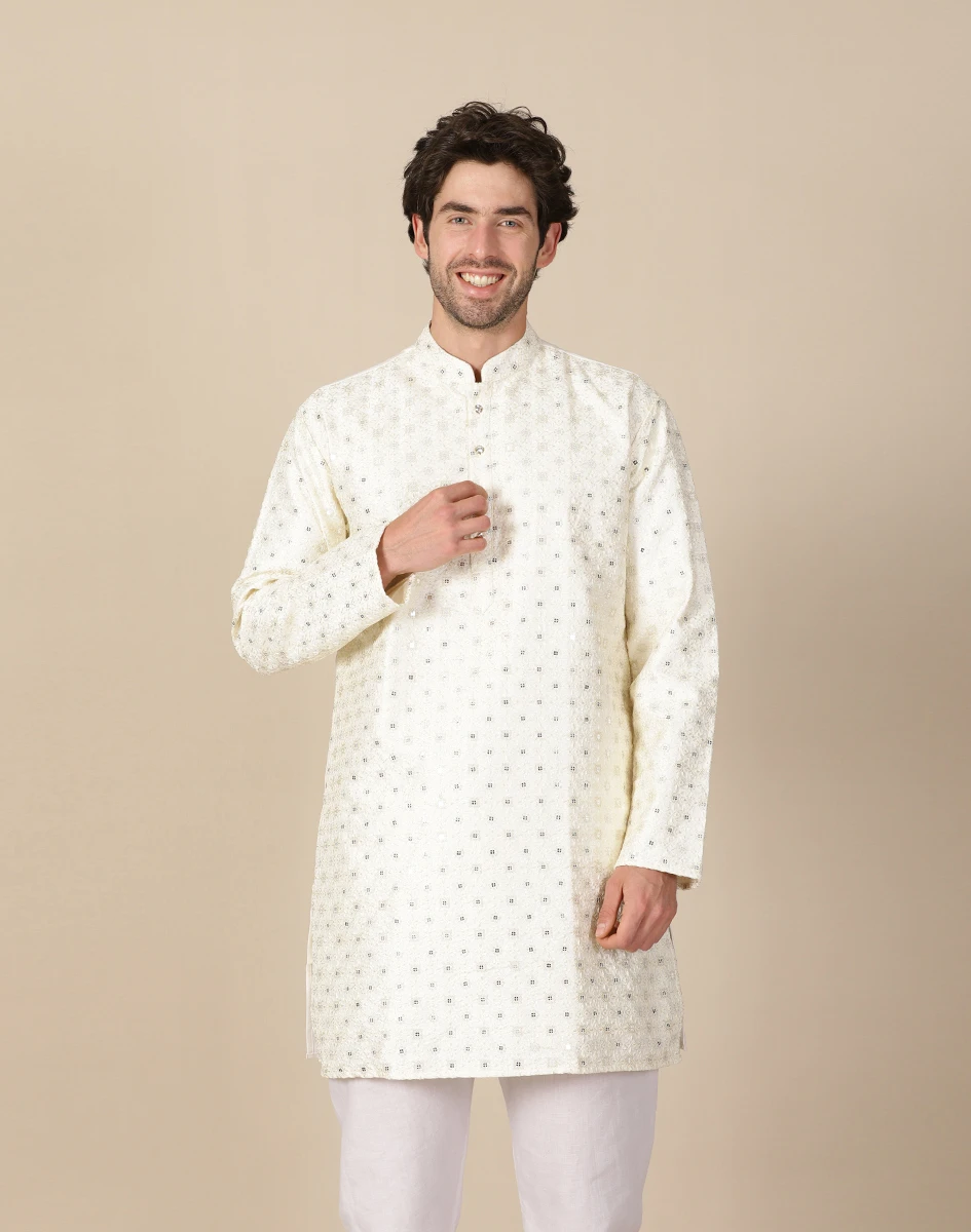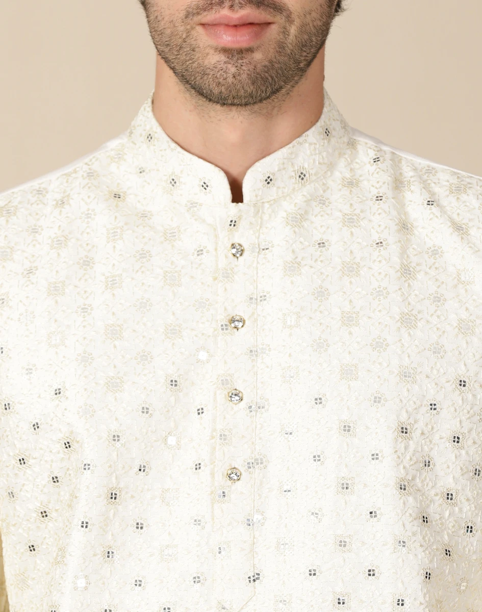 A refined ivory embroidered kurta designed with elegant detailing and a mandarin collar, perfect for weddings, festive occasions, and traditional celebrations.