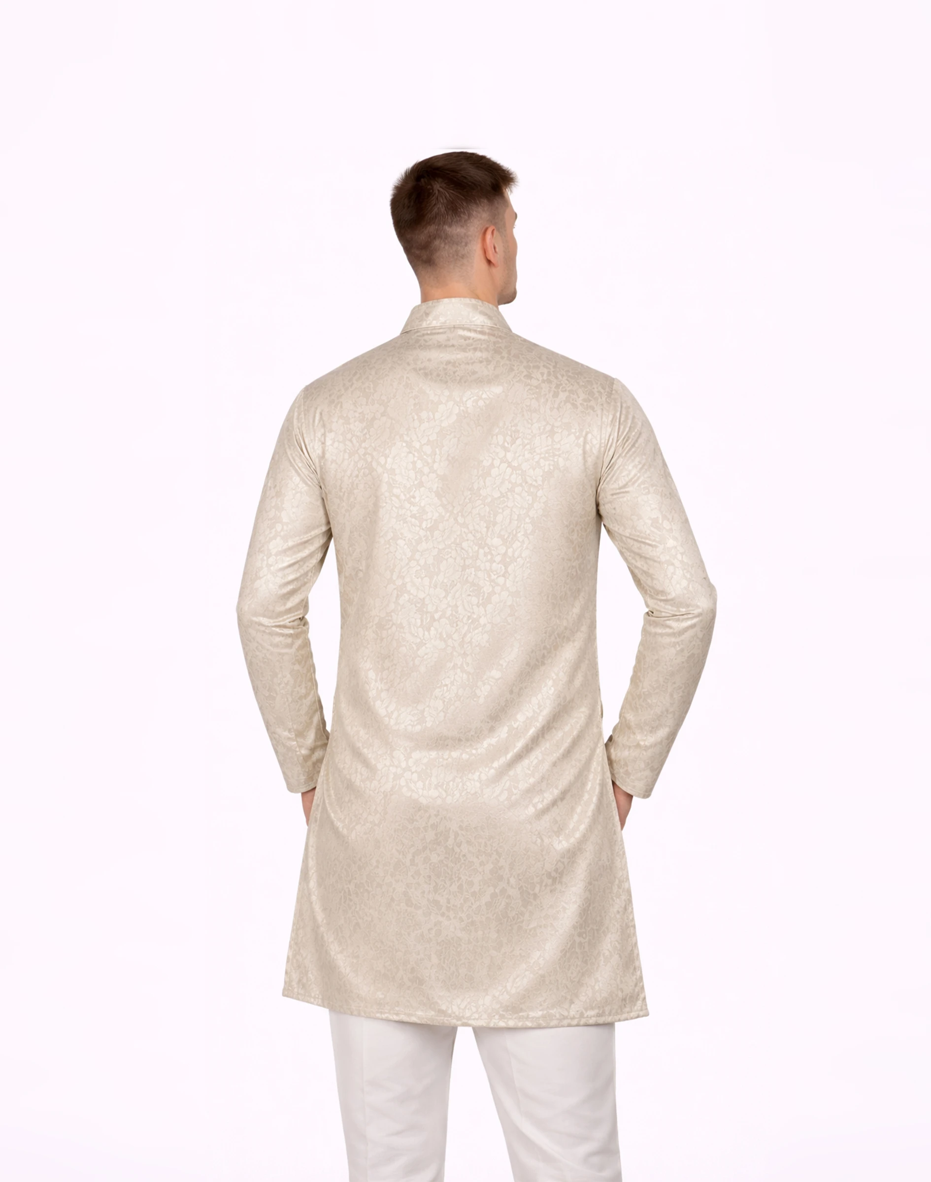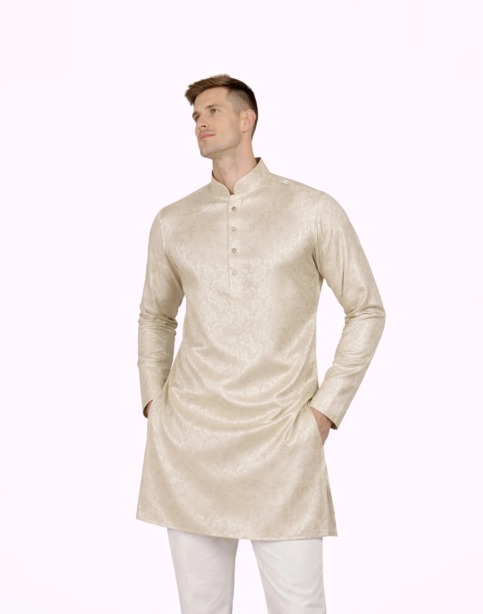 A sophisticated ivory kurta crafted in premium raw silk with an elegant floral self-design, perfect for refined festive dressing.