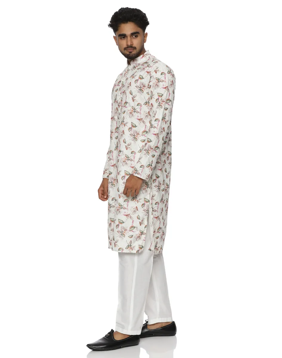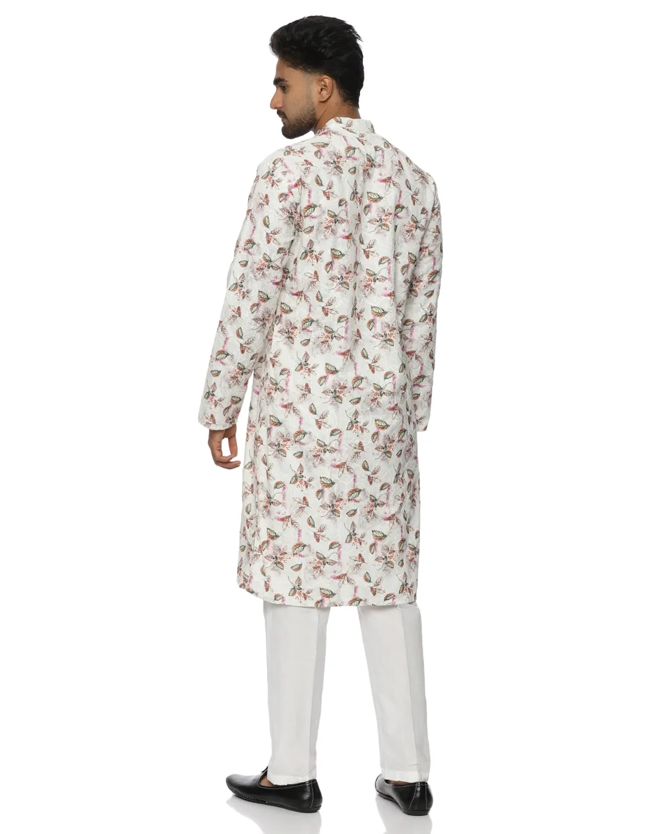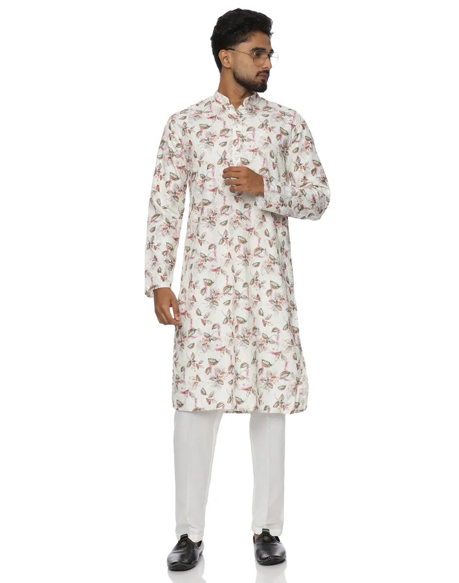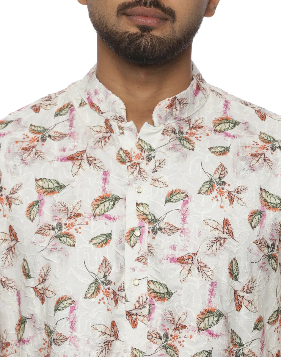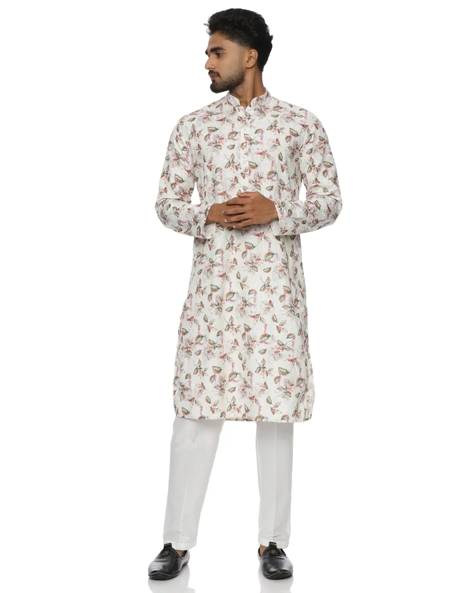 A refined ivory kurta adorned with delicate botanical prints, designed for effortless elegance and contemporary festive dressing.