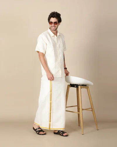 Pair it with an off-white or cream mundu with a golden border for a classic festive ensemble, or style it with churidar pants and mojaris for a regal, occasion-ready look.