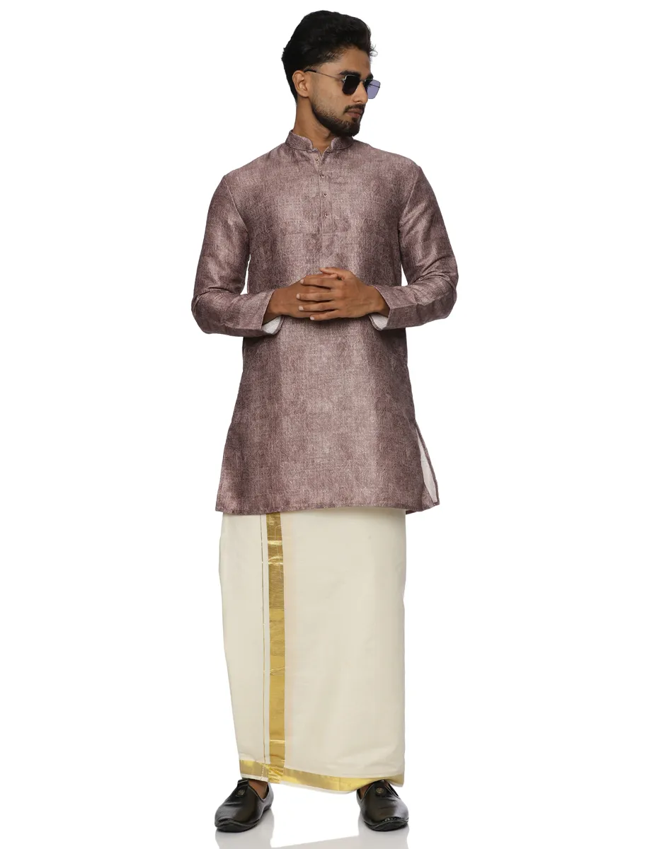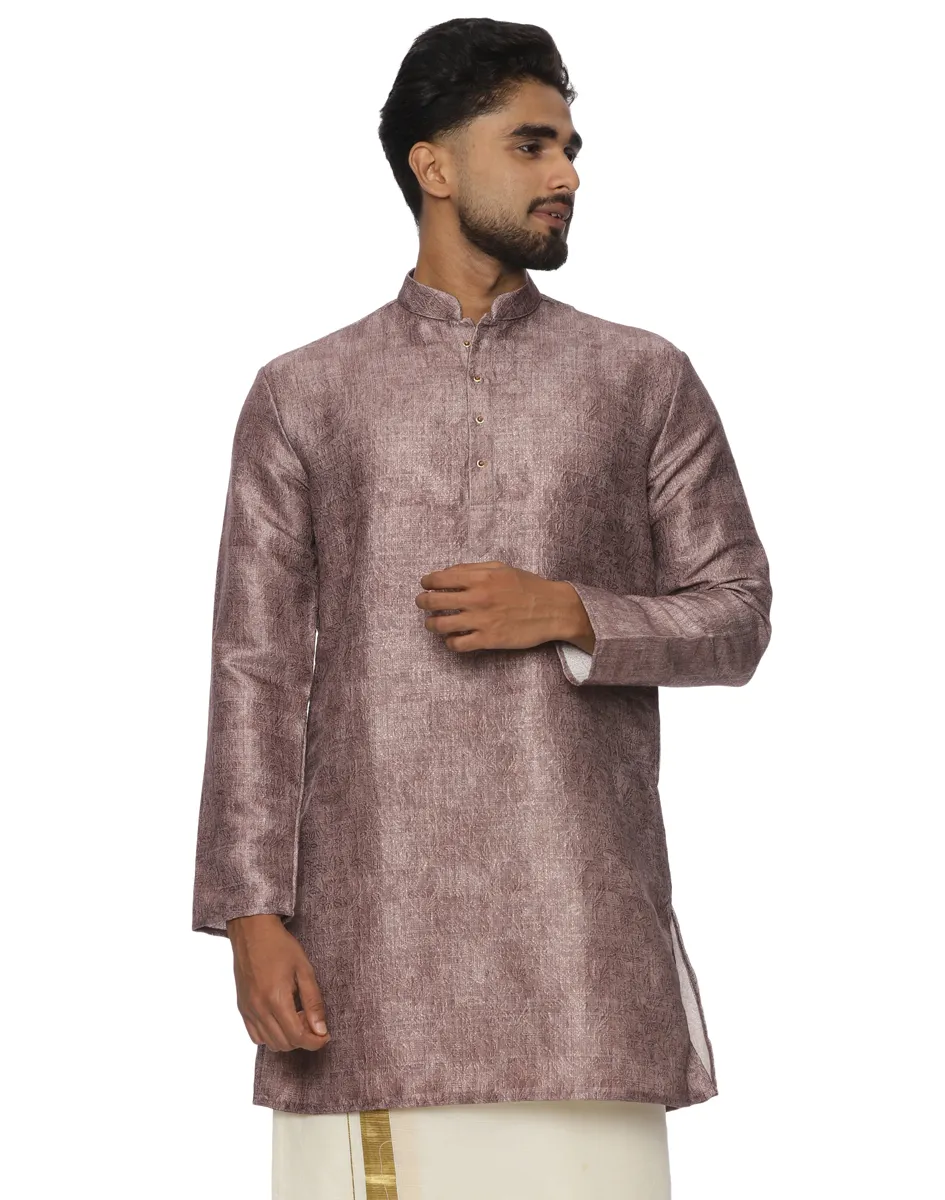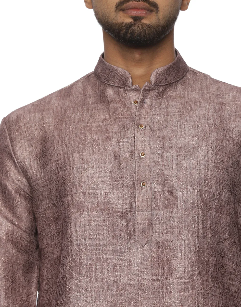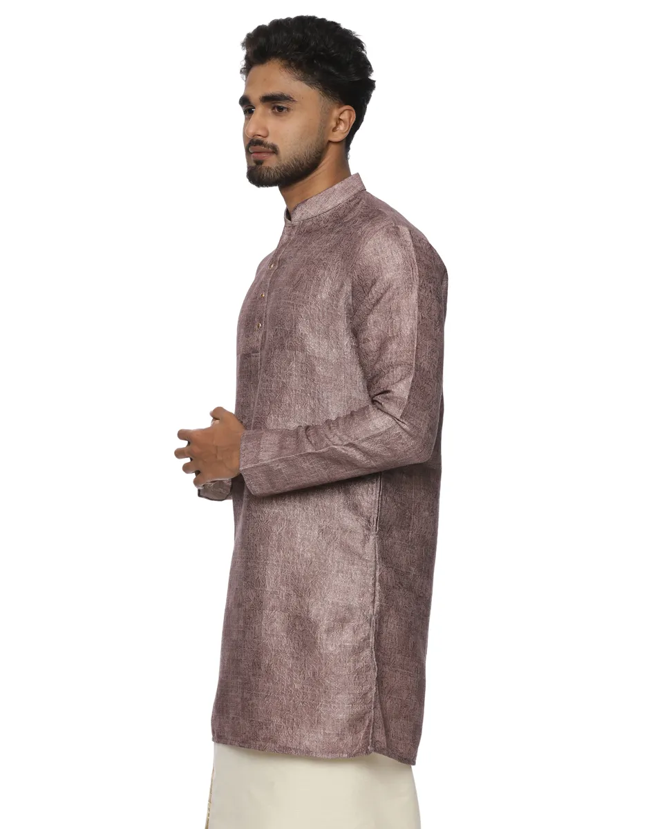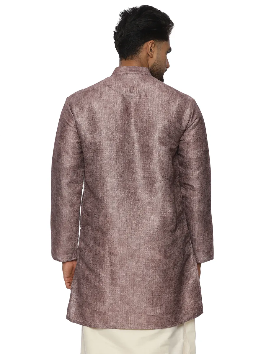 Defined by its muted, earthy mauve hue, the Maurya Vastra Silk-Blend Kurta strikes a perfect balance between festive vibrancy and contemporary minimalism. It features a classic Mandarin collar and a half-placket with tonal buttons, creating a clean, streamlined look that transitions effortlessly from day to evening celebrations.