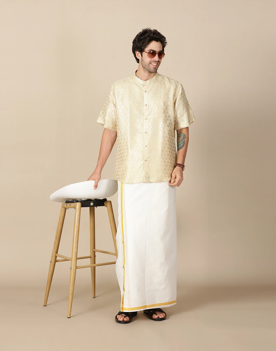 A refined ivory kurta featuring subtle woven textures and a modern short-sleeve silhouette—perfect for effortless festive and casual traditional styling.