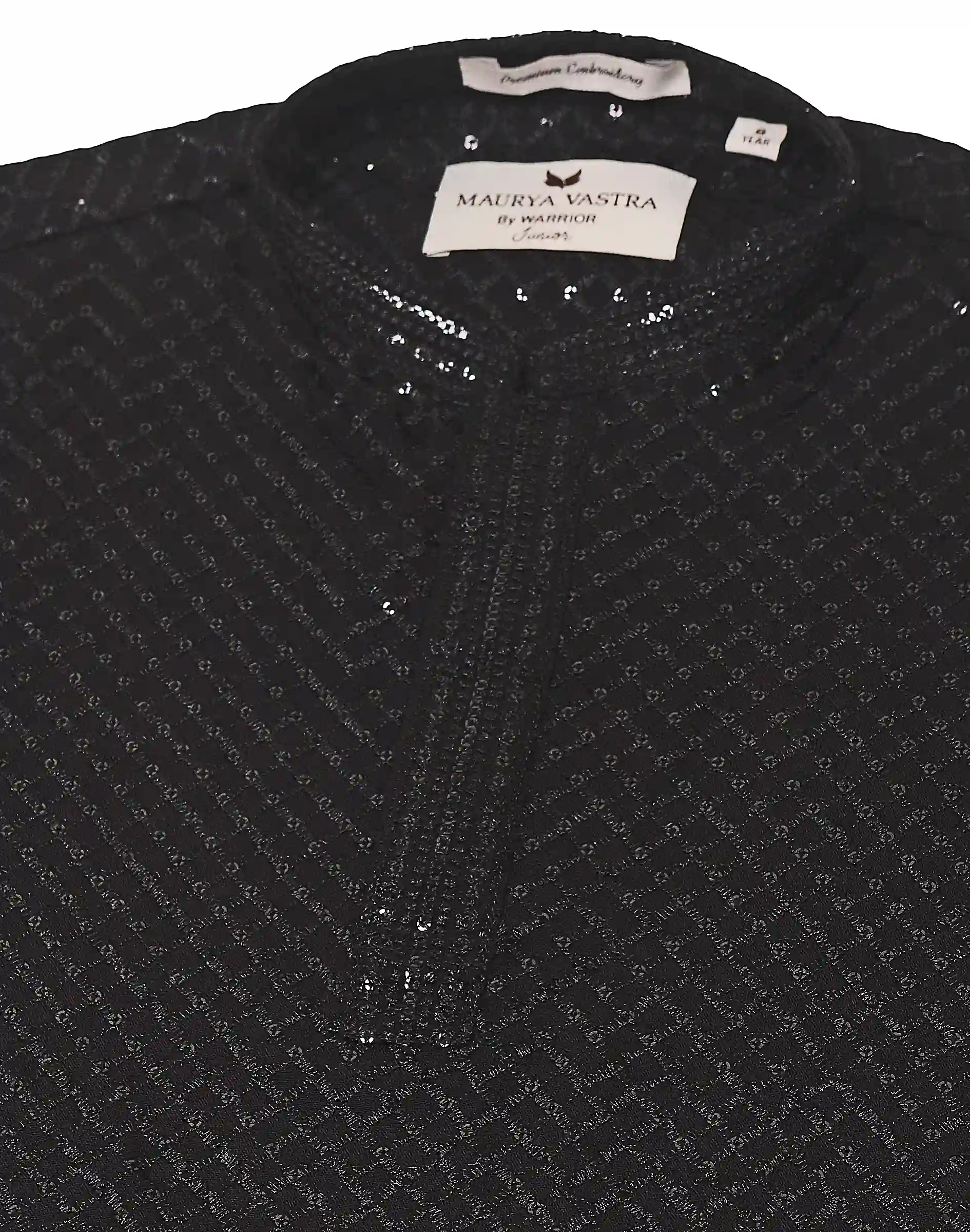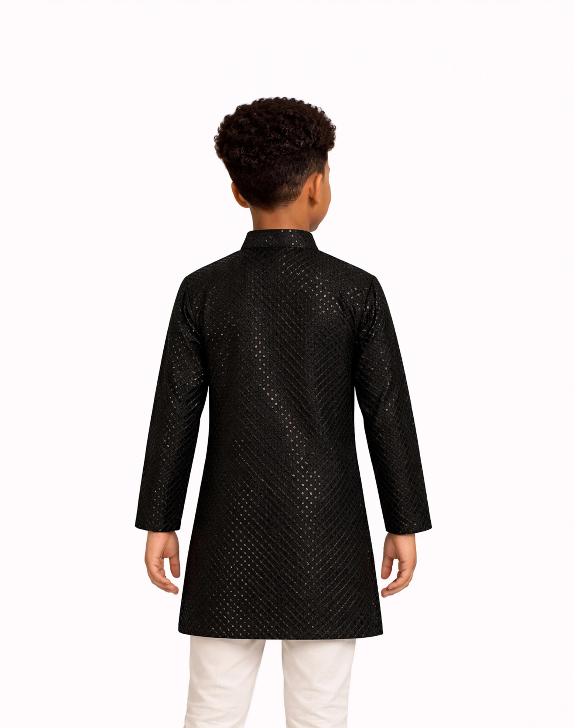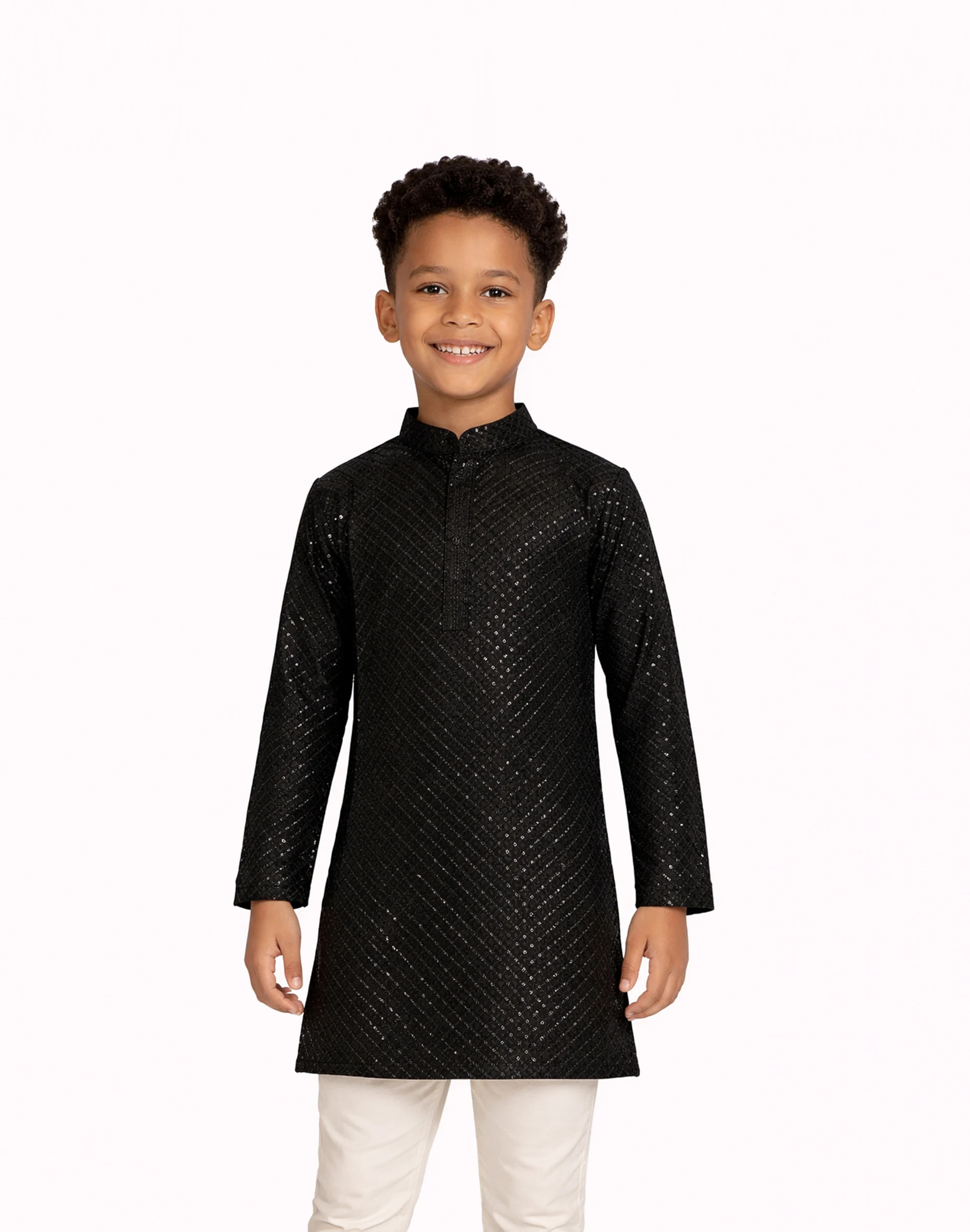 Add a touch of luxury to your child’s ethnic wardrobe with this midnight black textured kurta. Designed with a refined self-pattern throughout, this piece brings depth and elegance while maintaining a sleek, modern appeal.