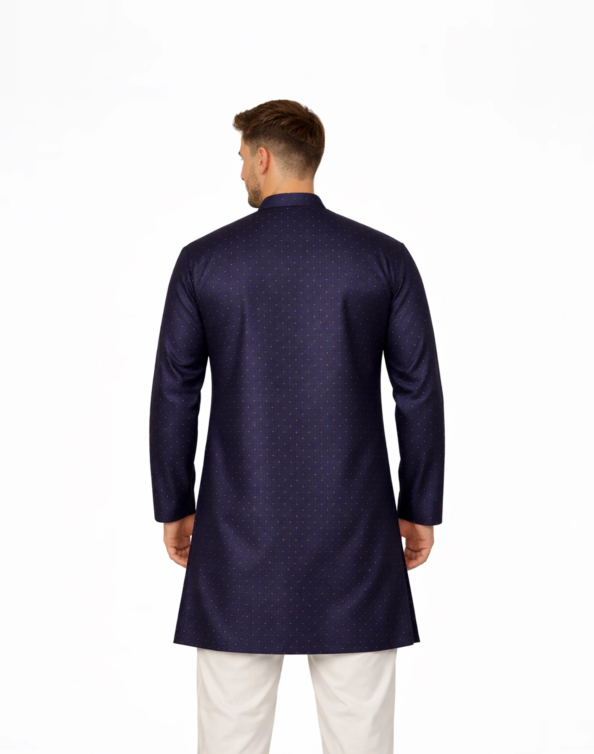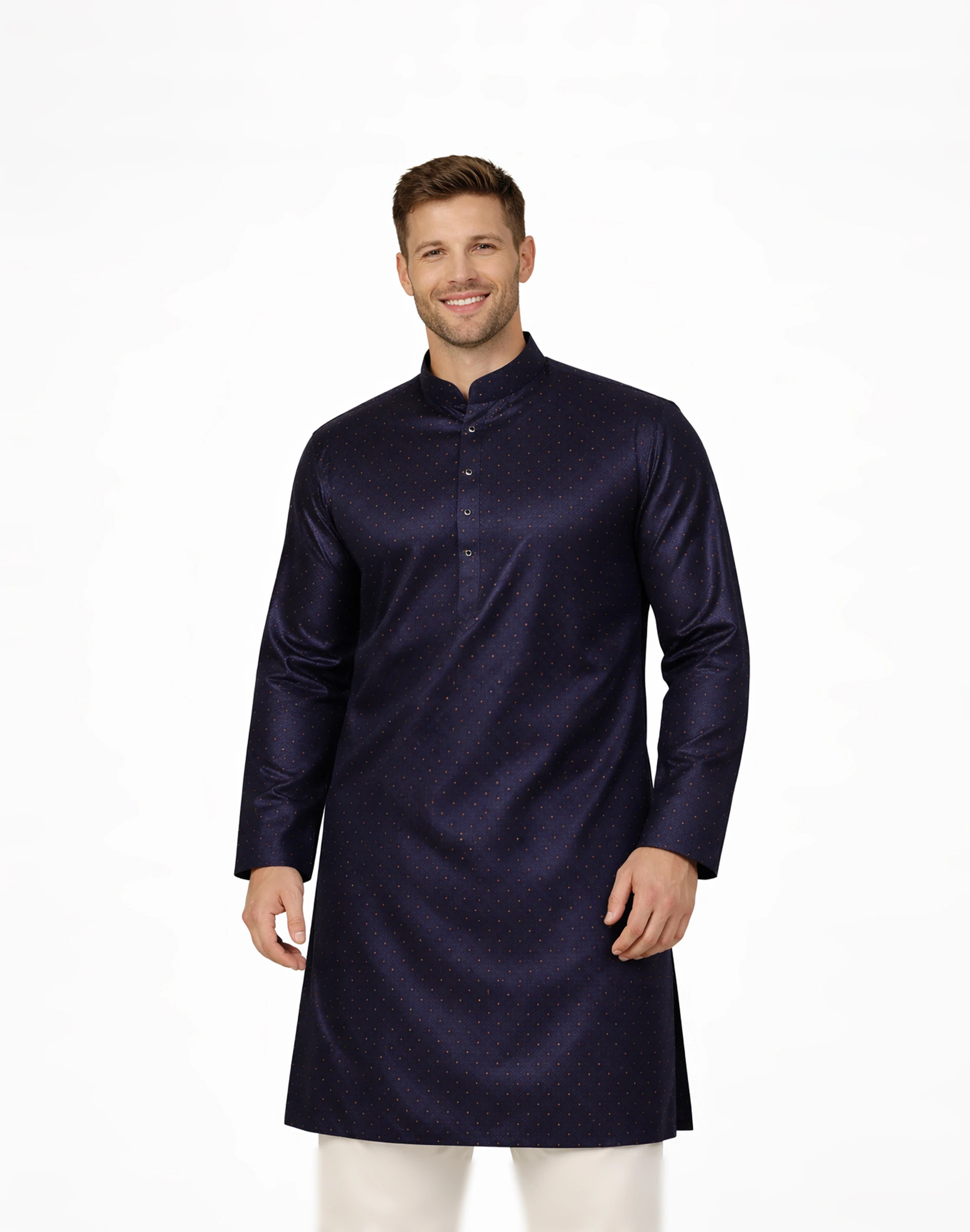 Step into understated sophistication with the Maurya Vastra Midnight Blue Textured Festive Kurta. Designed for the modern man who values elegance with subtle detailing, this kurta features a finely woven dotted texture that adds depth and a gentle sheen to the fabric. The rich midnight blue hue offers a timeless appeal, making it a versatile choice for both festive celebrations and evening gatherings. Styled with a sleek mandarin collar and a clean button placket, the kurta delivers a sharp, contemporary silhouette while maintaining its traditional essence. Its tailored yet comfortable fit ensures ease of movement, allowing you to carry a polished look effortlessly throughout weddings, festivals, and cultural occasions.