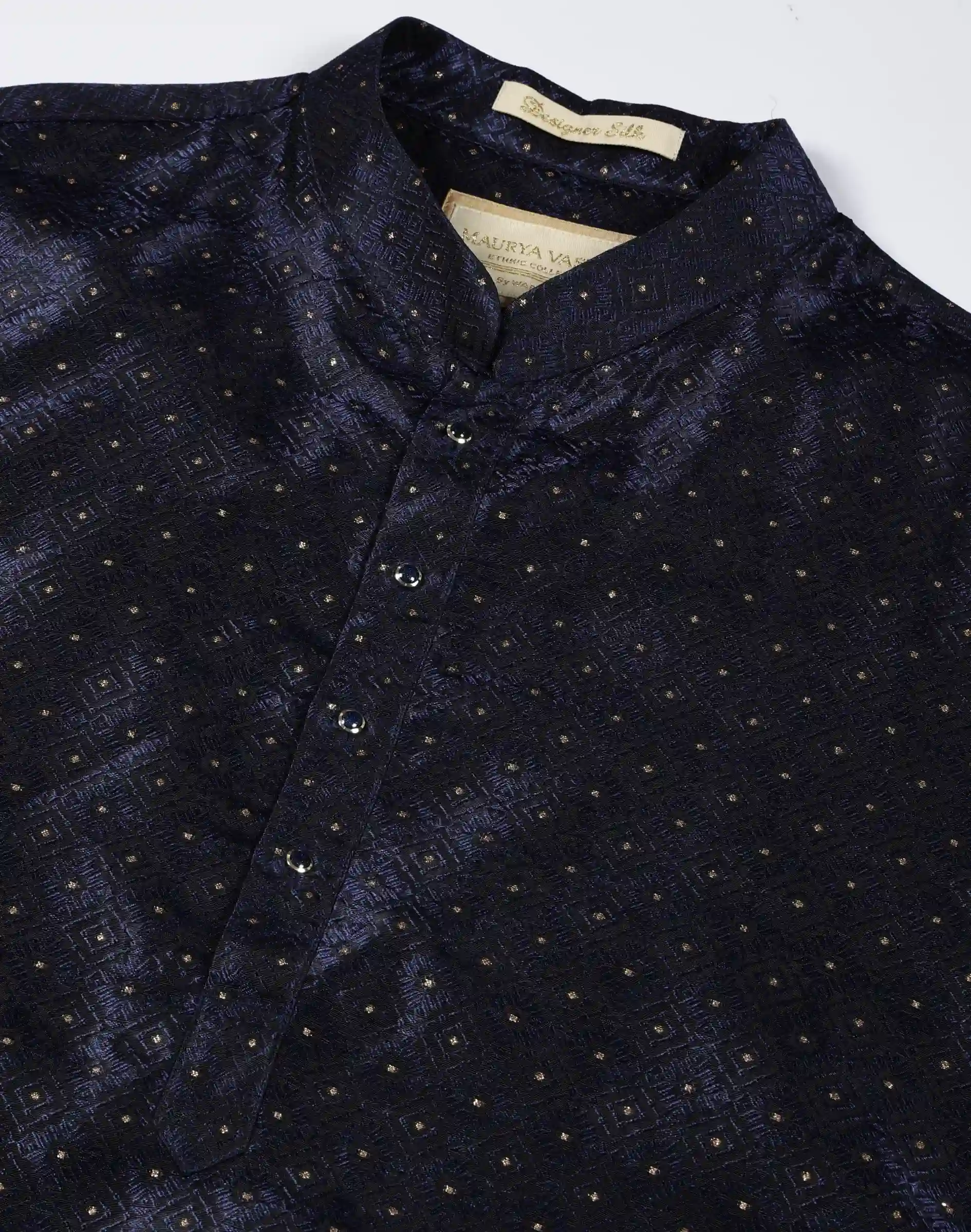 A refined midnight blue kurta by Maurya Vastra, featuring a subtle dotted texture with a soft sheen—perfect for elegant festive and evening occasions.