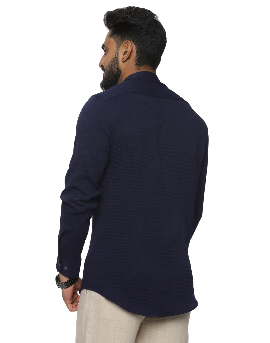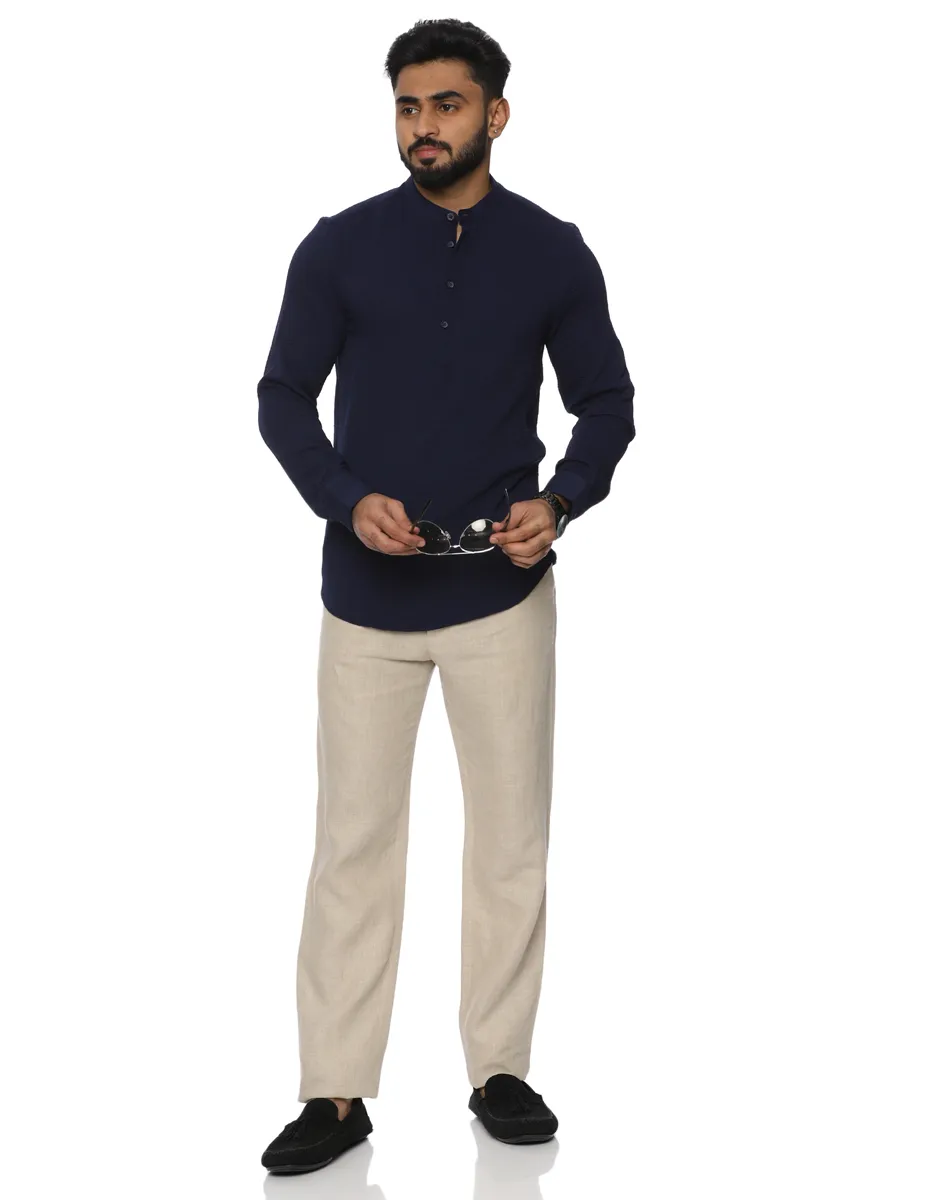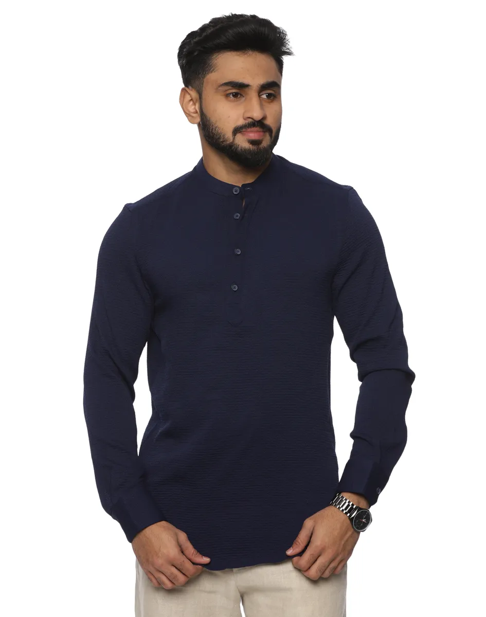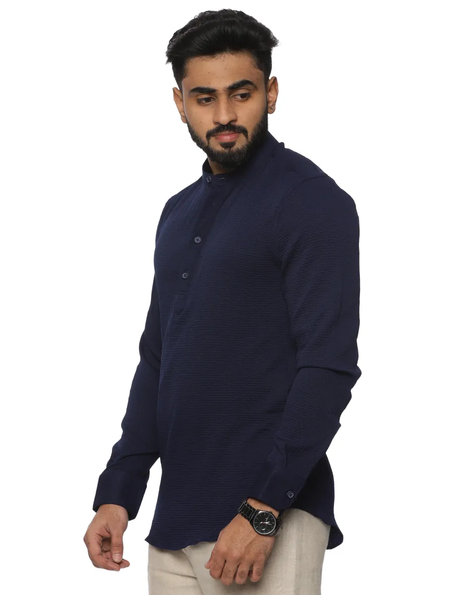 This Maurya Vastra kurta is crafted from a premium textured cotton blend that offers a refined surface finish with subtle depth. Lightweight and breathable, the fabric ensures lasting comfort while maintaining a smooth, structured appearance throughout the day. The deep midnight blue tone adds a sense of quiet luxury, making it a versatile choice for both festive and elevated casual settings.