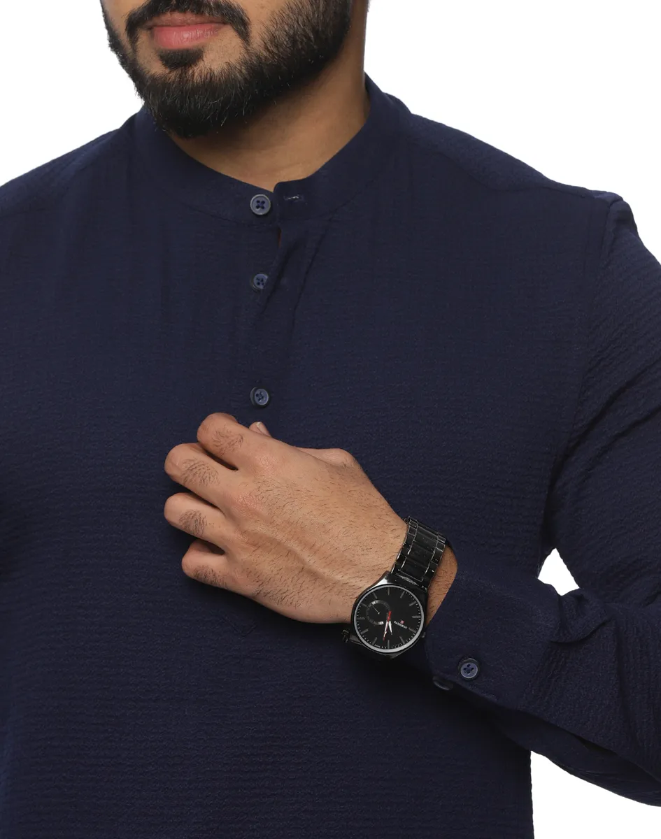 Designed in a modern slim fit, the kurta creates a clean, streamlined silhouette without feeling restrictive. It features a neatly structured mandarin collar, a minimal button placket with tonal buttons, and full-length sleeves finished with crisp cuffs. The understated texture across the fabric enhances its visual appeal while keeping the overall look minimal and sophisticated.
