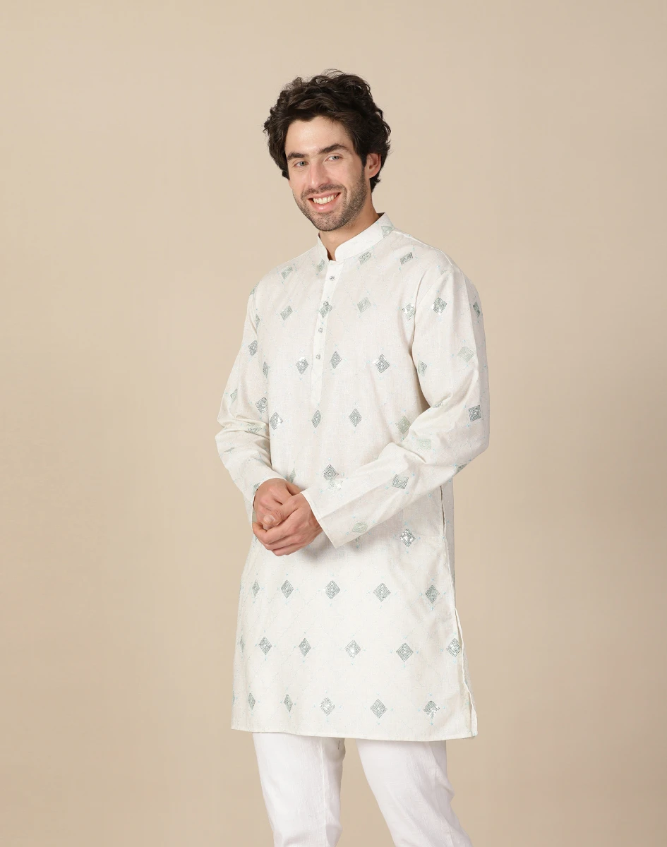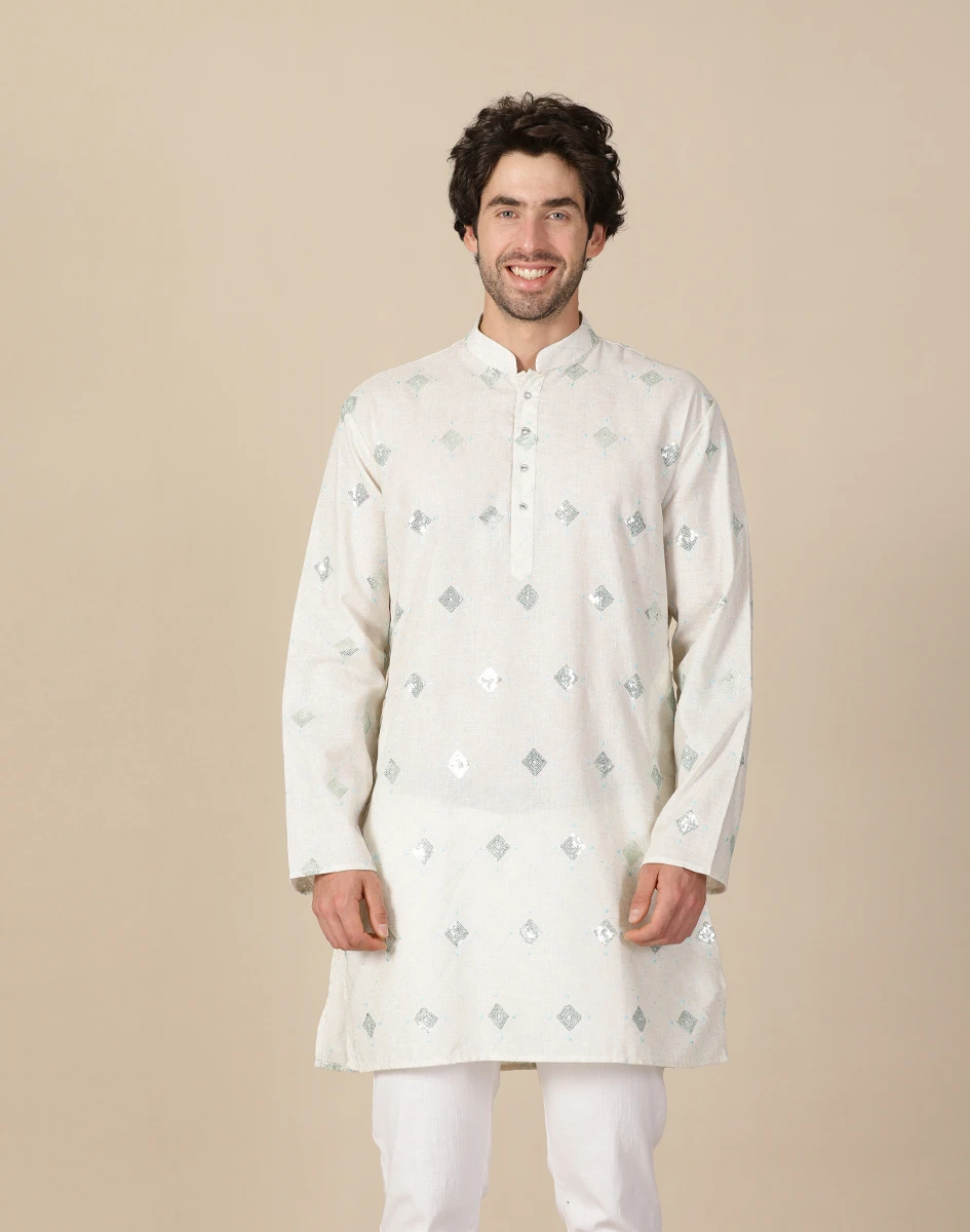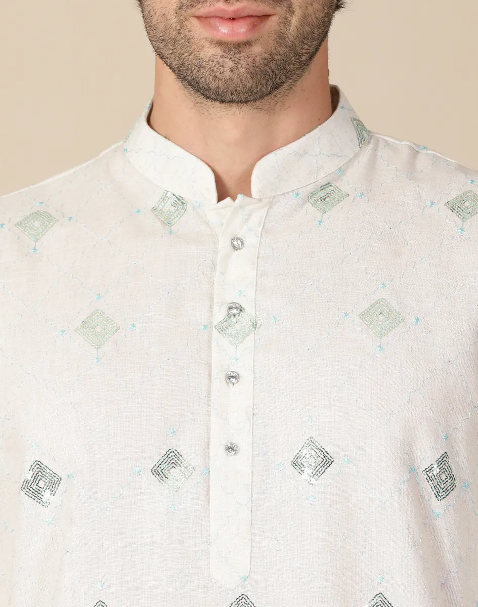 Add a subtle touch of elegance to your ethnic wardrobe with this Maurya Vastra off-white embroidered kurta. It features delicate geometric embroidery in soft mint tones, adding gentle texture while keeping the look clean and refined. Designed with a classic mandarin collar and a neat button placket with elegant buttons, the kurta has a polished festive appeal. The off-white base paired with light mint embroidery creates a fresh and graceful look, making it perfect for weddings, festive gatherings, cultural events, and family celebrations. With its comfortable straight fit, it offers both style and ease for both daytime and evening occasions.