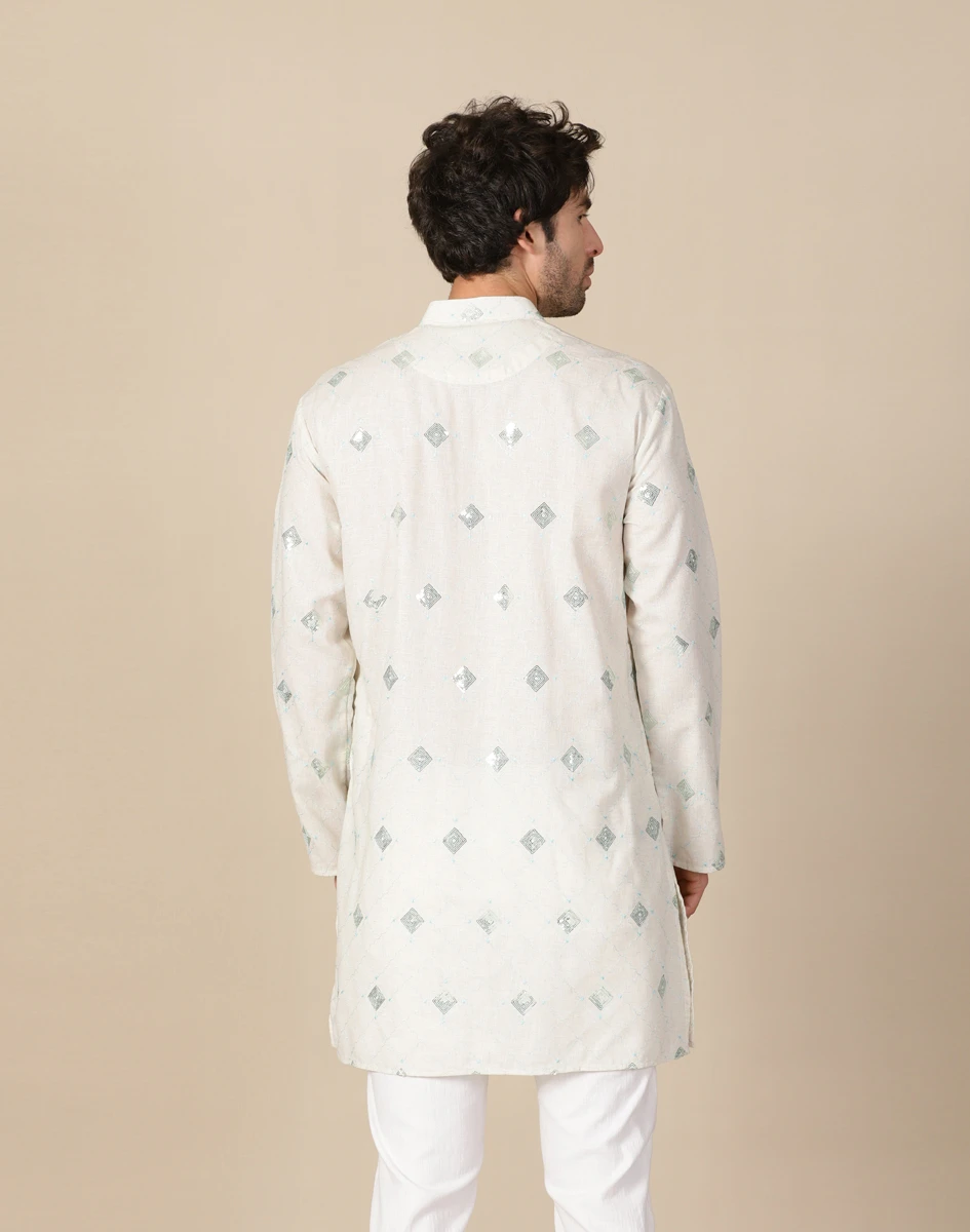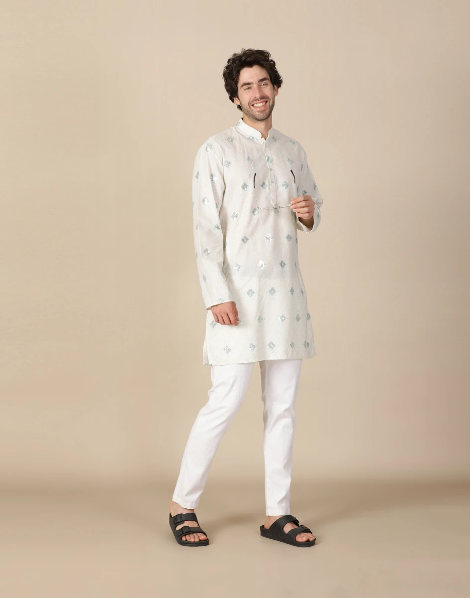 A refined ivory embroidered kurta designed with elegant detailing and a mandarin collar, perfect for weddings, festive occasions, and traditional celebrations.