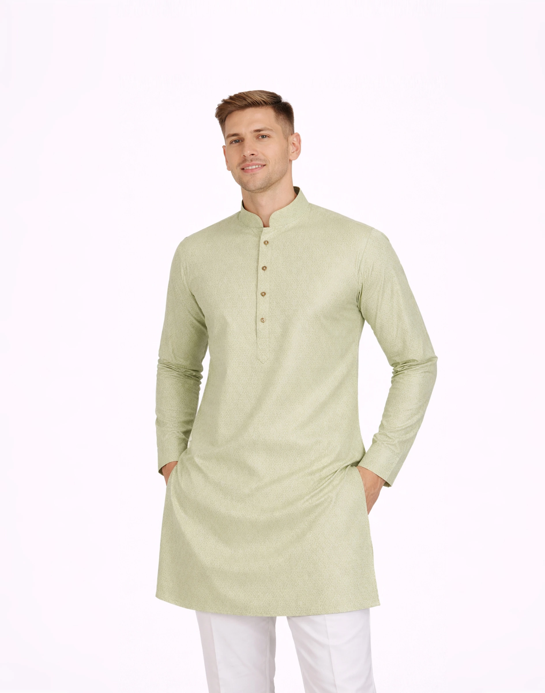 A refreshing mint green kurta with delicate woven texture and a soft sheen, perfect for elegant daytime celebrations.