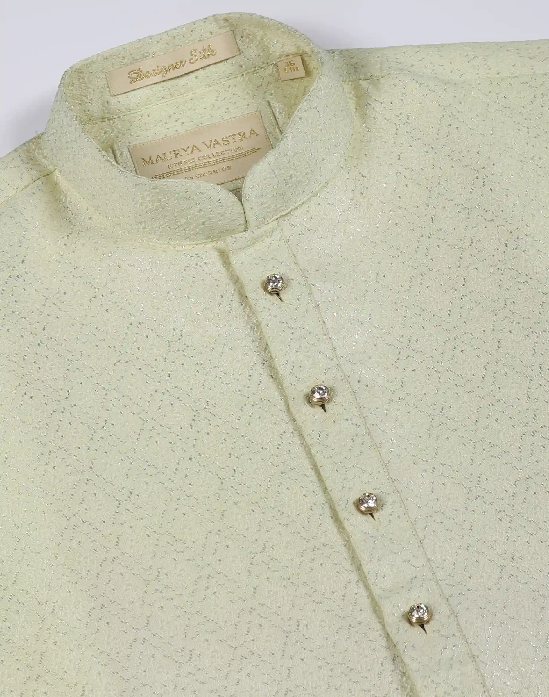 Step into refined sophistication with the Maurya Vastra Pastel Mint Green Textured Silk Kurta, designed for those who appreciate subtle luxury. Rendered in a soothing mint green tone, this kurta features an intricate self-textured weave that adds depth and character while maintaining a clean and minimal aesthetic. The gentle sheen of the fabric enhances its premium appeal, making it an excellent choice for daytime festivities, intimate gatherings, and summer celebrations. The kurta is tailored with a classic mandarin collar and a sleek button placket, accented with elegant metallic buttons that elevate its overall look. Its structured silhouette and full sleeves offer a balanced combination of comfort and style, ensuring you look effortlessly polished throughout the day. Light, breathable, and refined, this piece brings a fresh perspective to traditional wear.