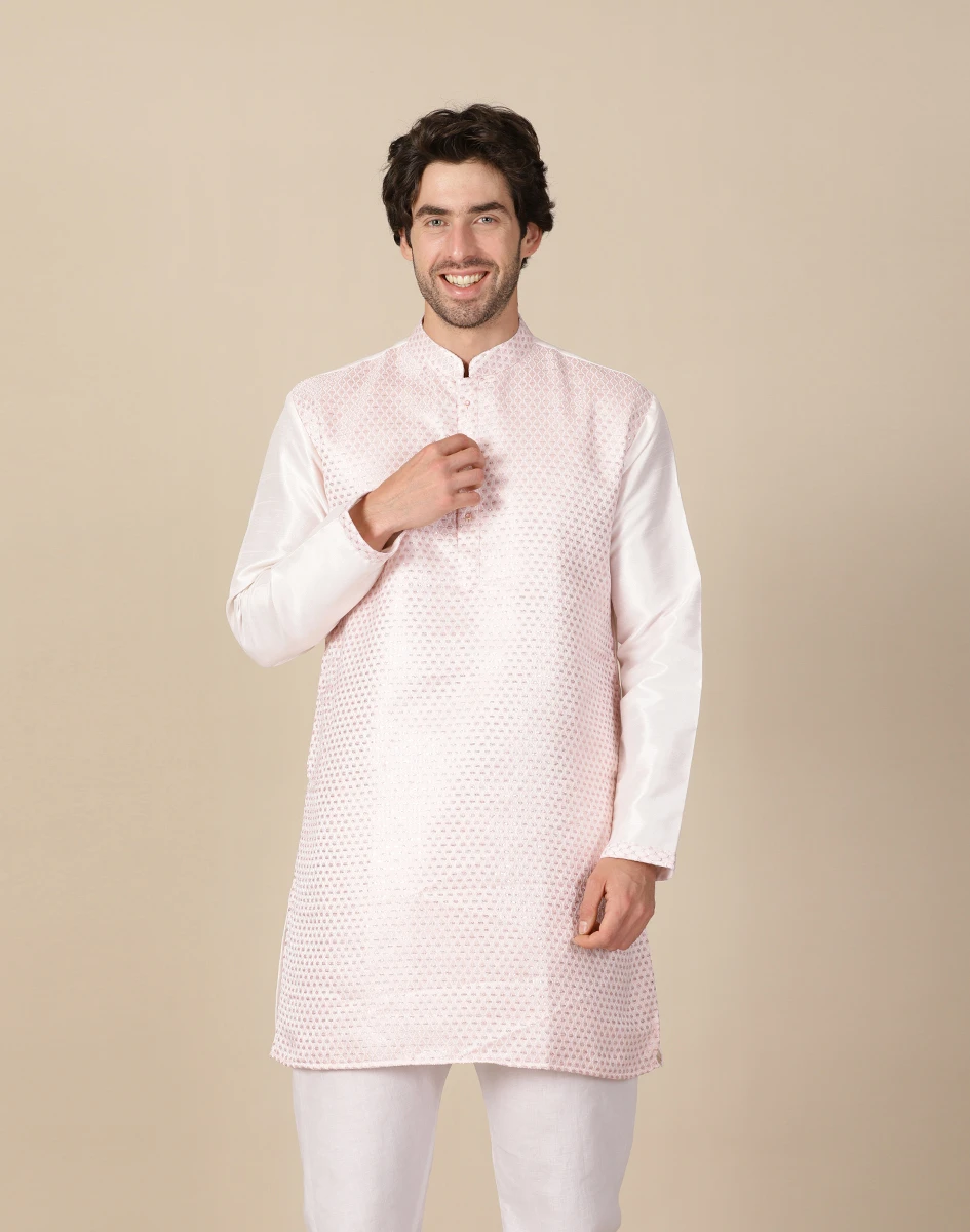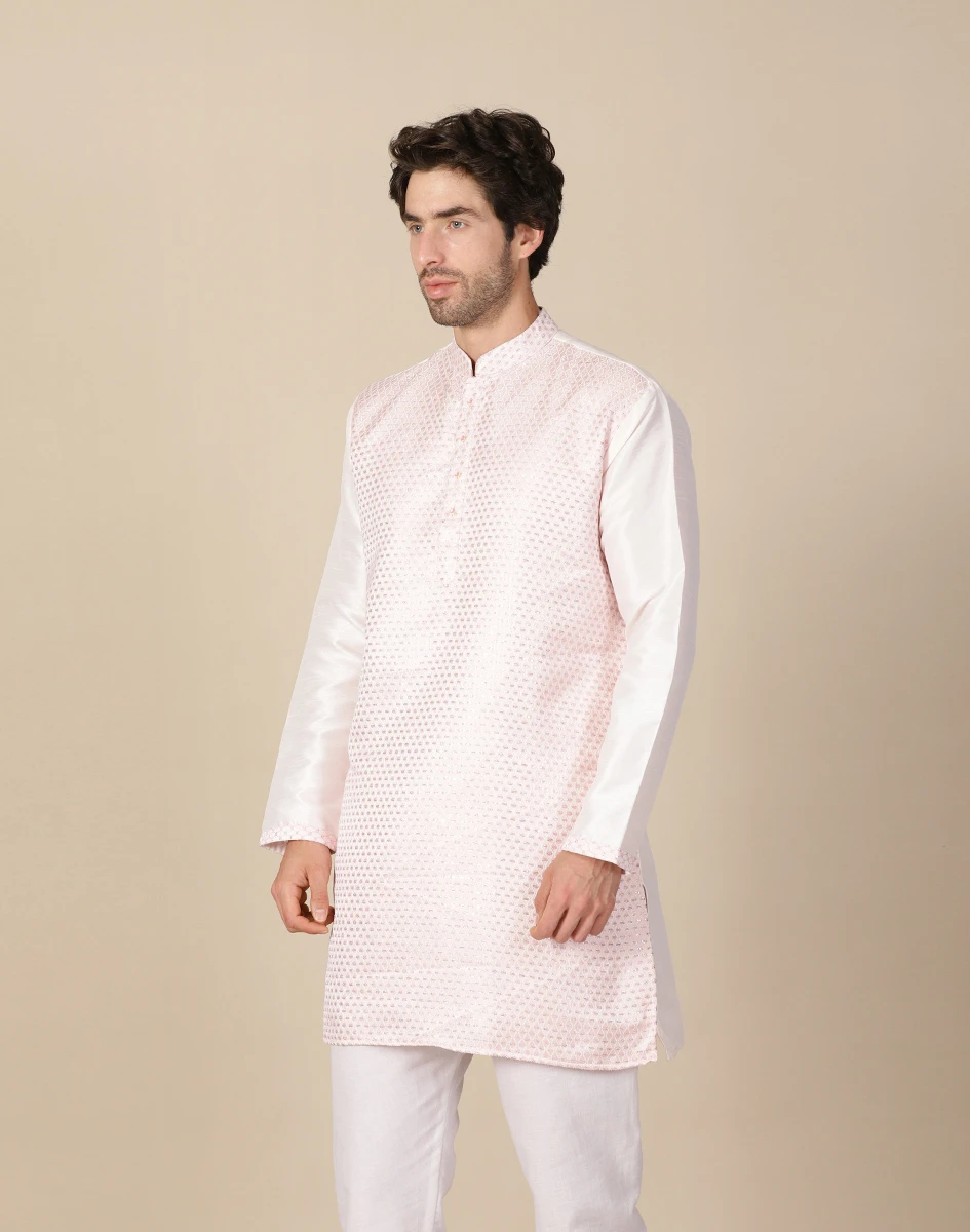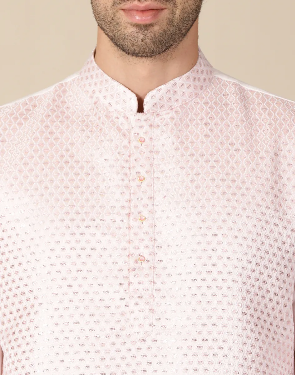 A stylish light pink kurta crafted with subtle textured fabric, perfect for festive occasions, cultural events, and elegant everyday wear.