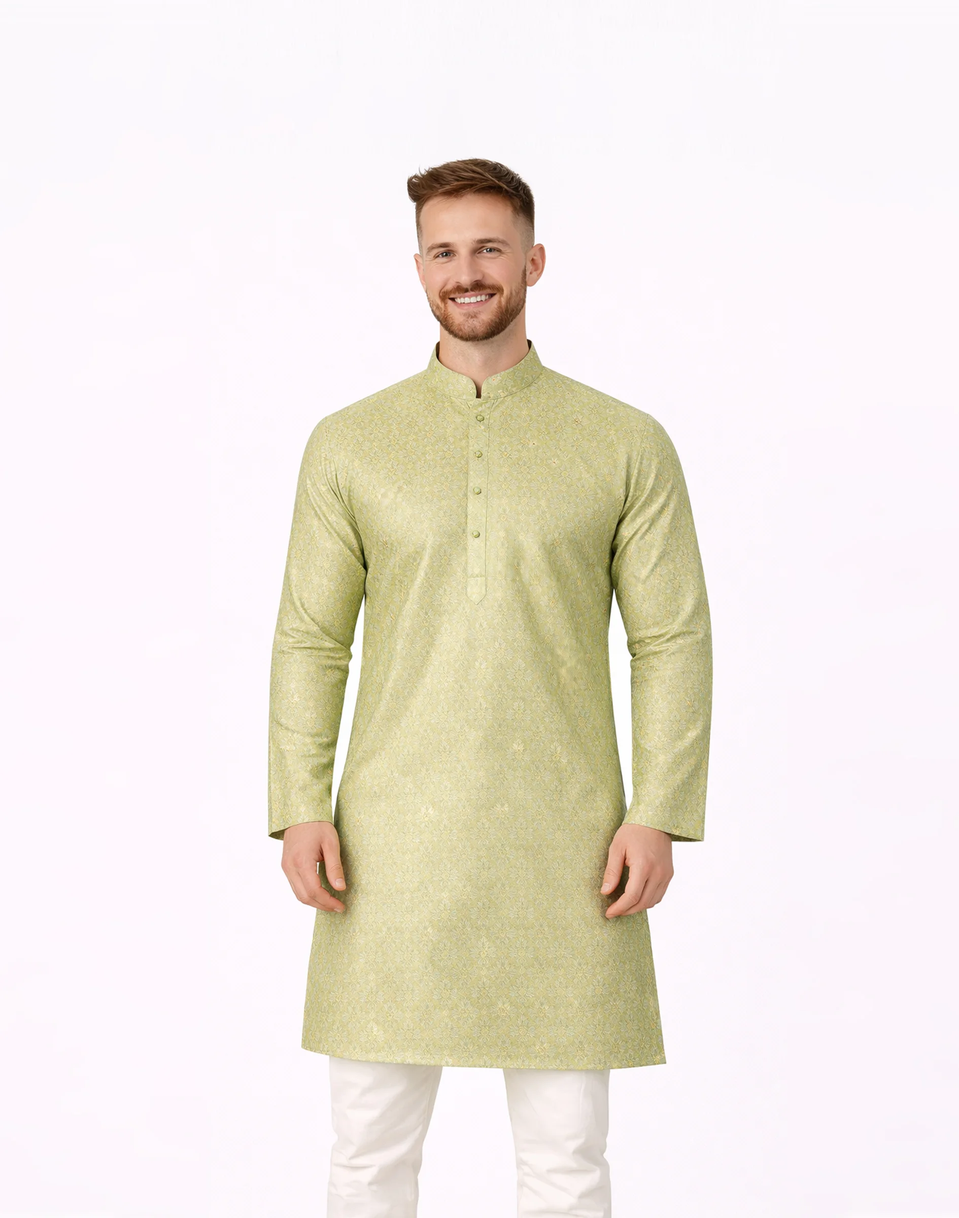 A refined expression of modern elegance, this sage green silk kurta features intricate jacquard textures and subtle embellishments for a serene yet luxurious festive look.