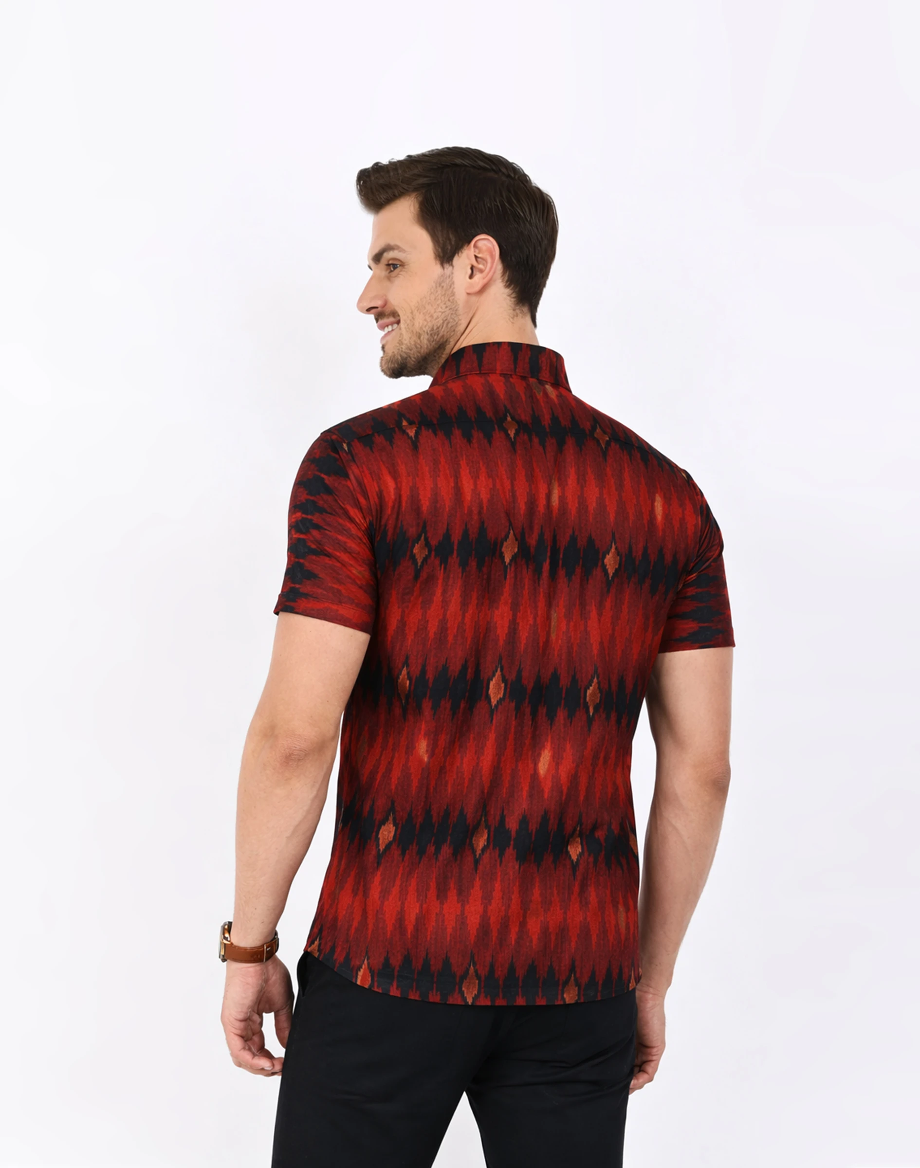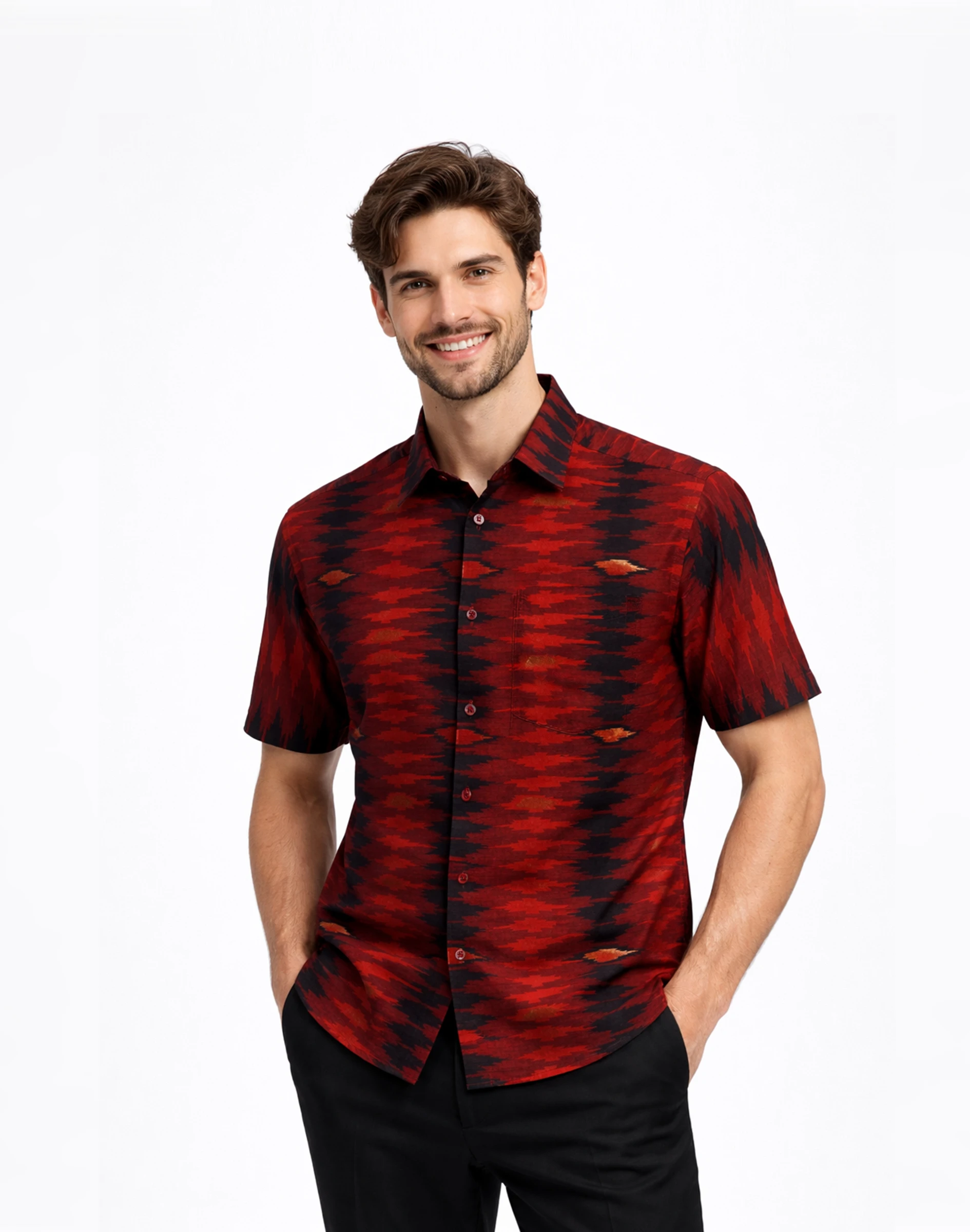 A bold red and black designer silk shirt featuring an eye-catching ikat-inspired pattern, perfect for festive and statement styling.