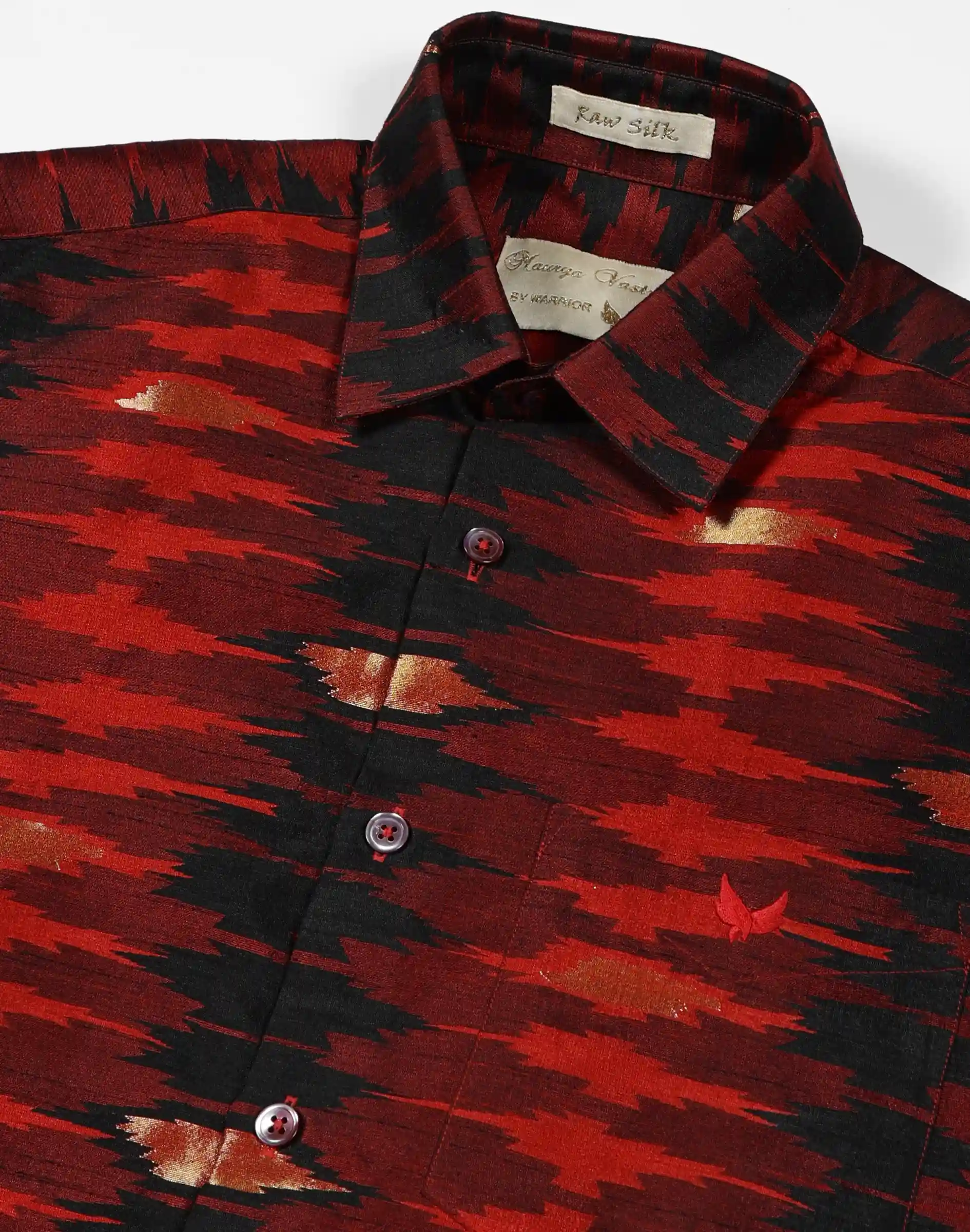Maurya Vastra Red & Black Ikat Pattern Designer Silk Shirt
