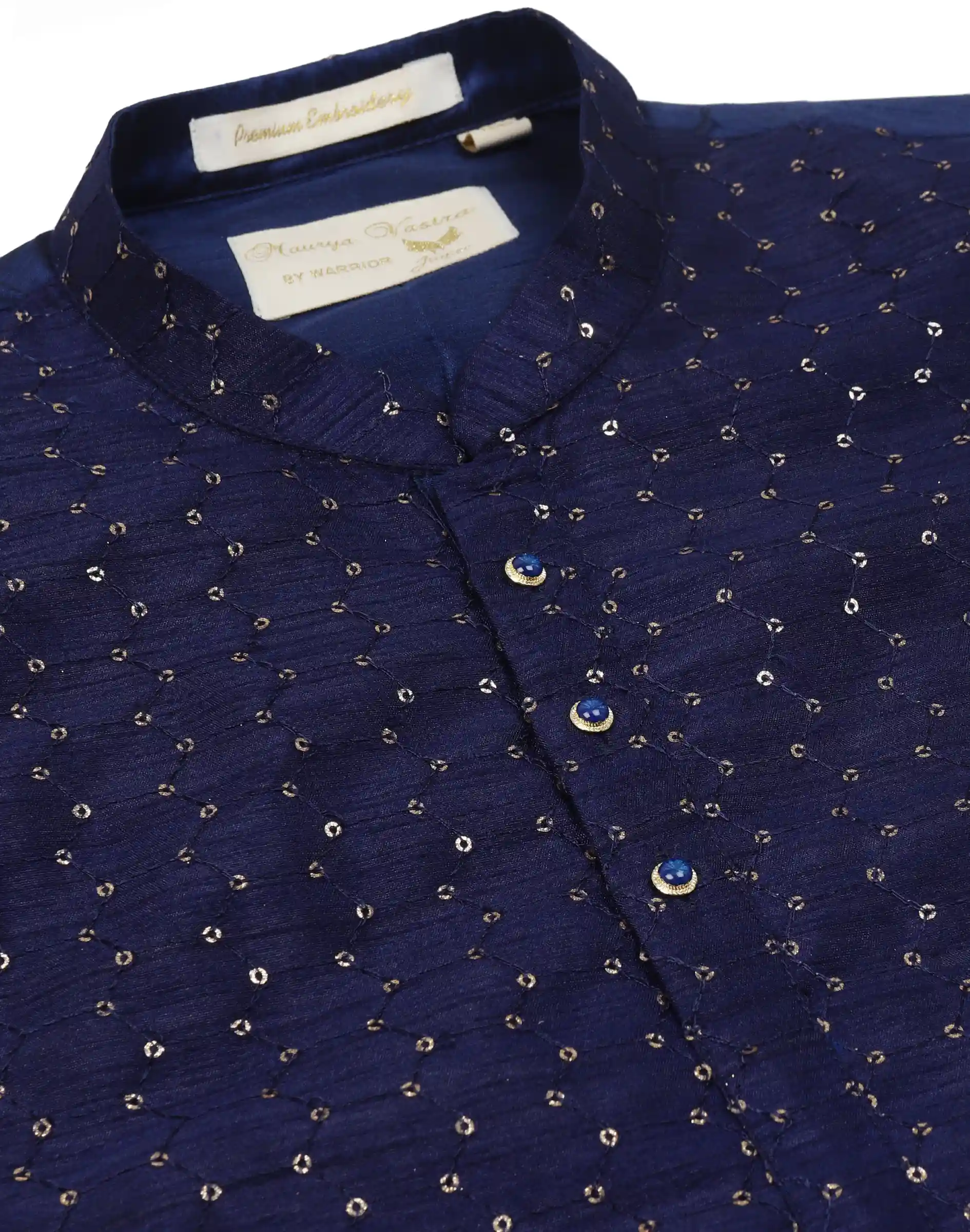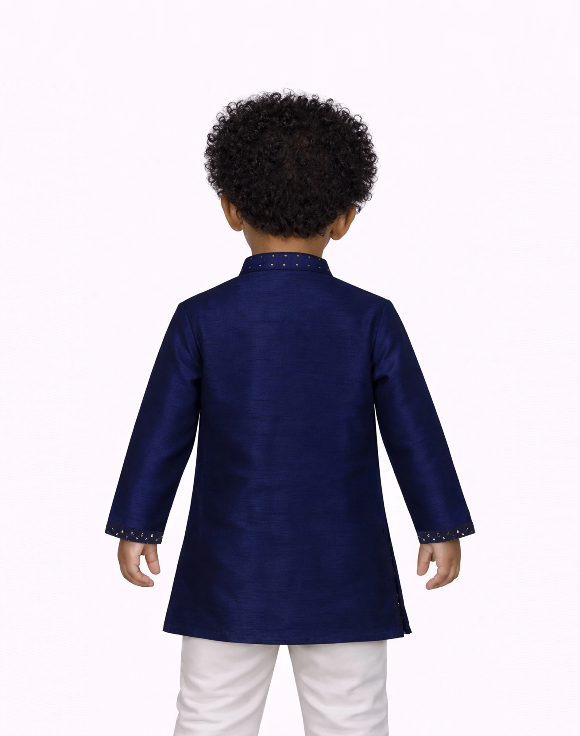 This elegant boys’ kurta in a rich royal navy shade is crafted for timeless festive styling. The kurta features delicate gold dot embellishments spread evenly across the fabric, adding a subtle yet striking shimmer. Designed with a structured mandarin collar and a clean buttoned placket, it offers a classic ethnic silhouette with a modern finish. The smooth, breathable fabric ensures comfort, making it ideal for long hours of wear during celebrations. Paired with light-colored bottoms, this ensemble delivers a perfect blend of sophistication and festive charm.